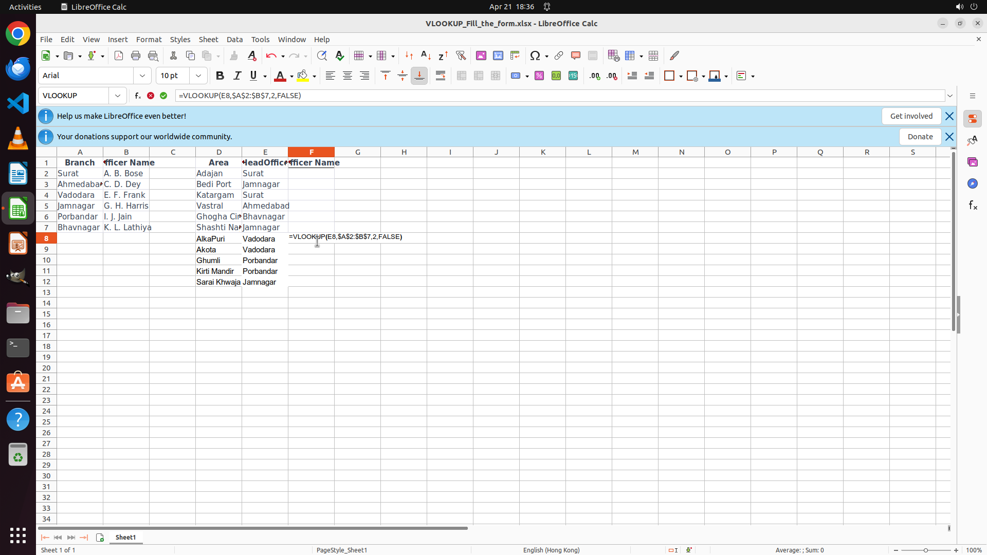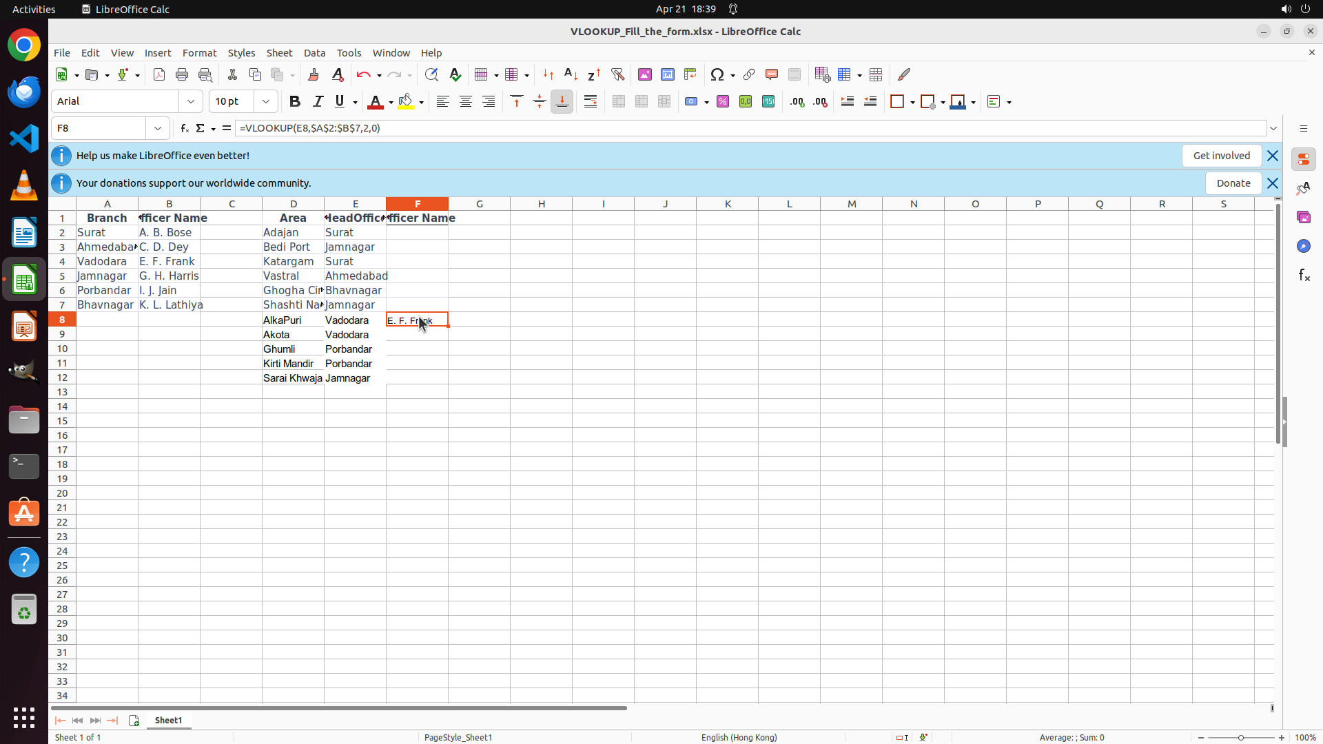 1. 按 Enter 确认公式,让 E8 显示查找结果(应该是 "E. F. Frank",因为 D8 是 Vadodara)