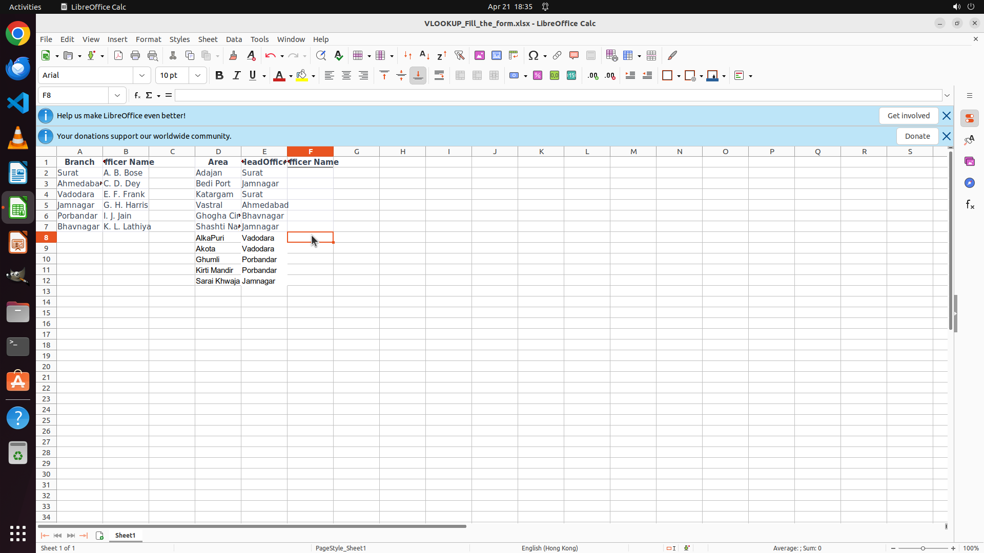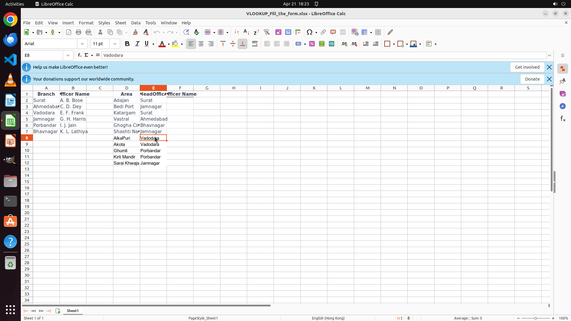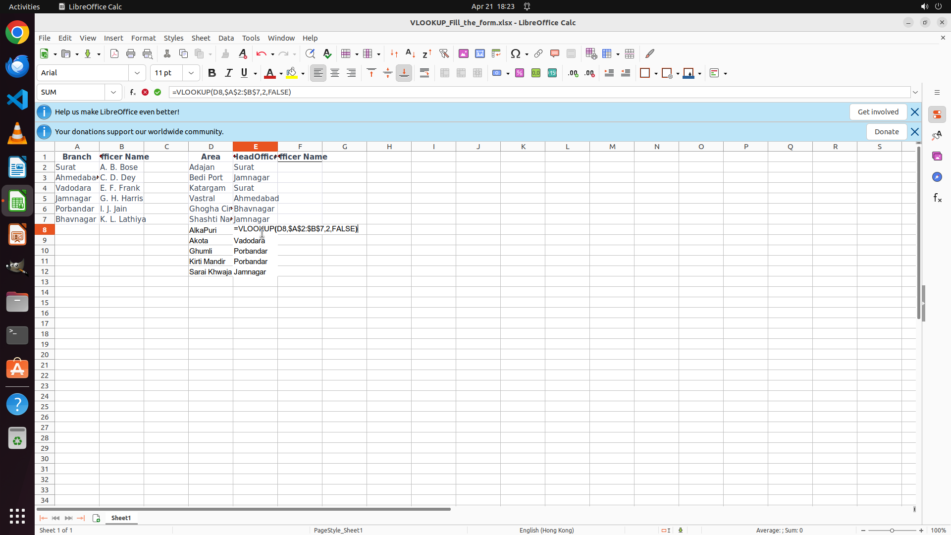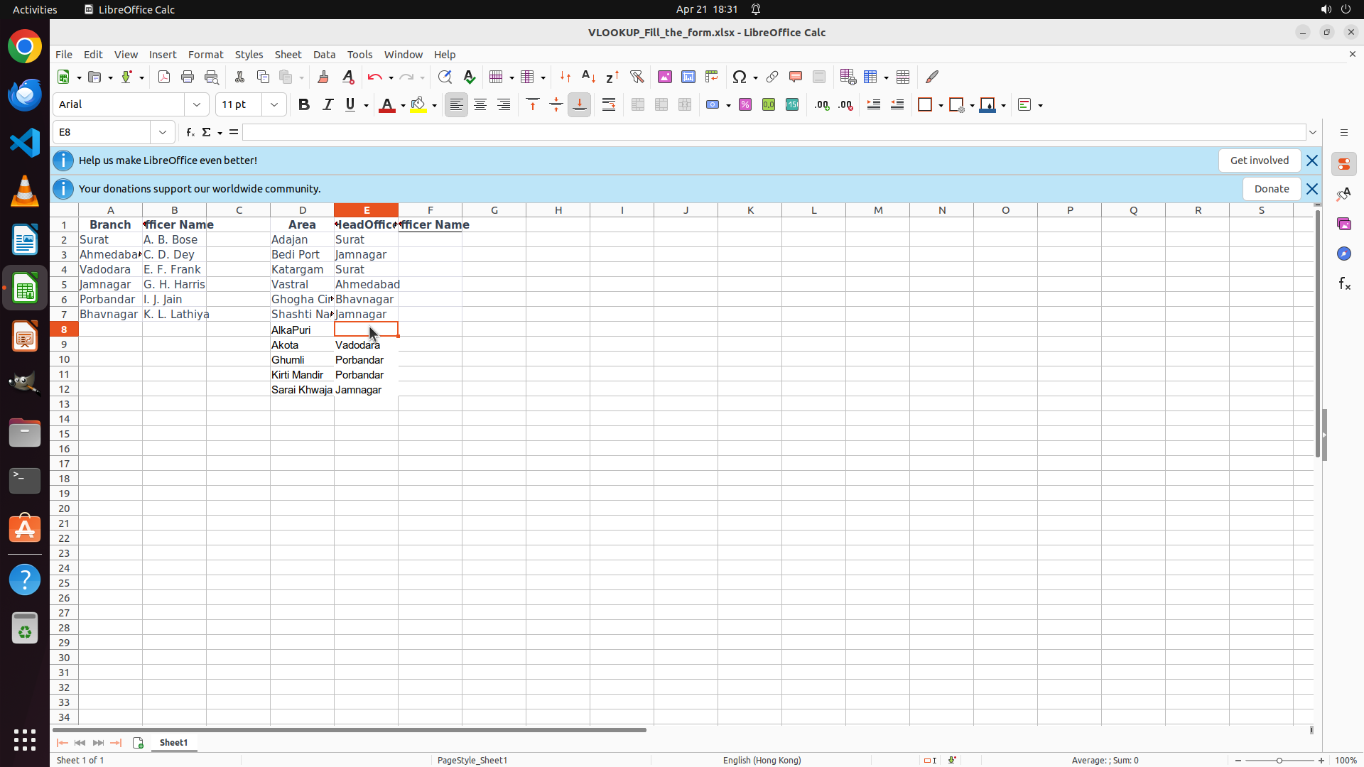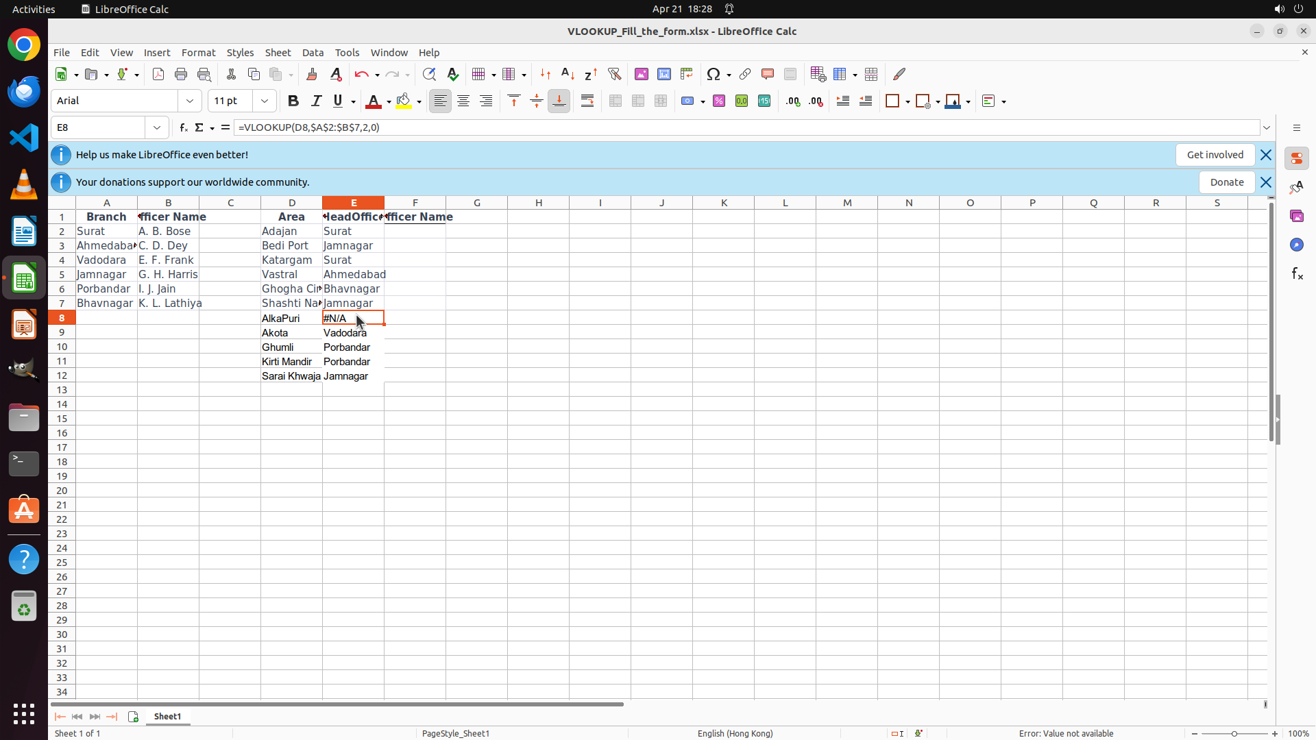 4. E8 的 #N/A 错误表明 VLOOKUP 未能找到匹配值 - 可能是因为 D8 包含 "AlkaPur"(区域名称)而不是分支名称如 "Vadodara"