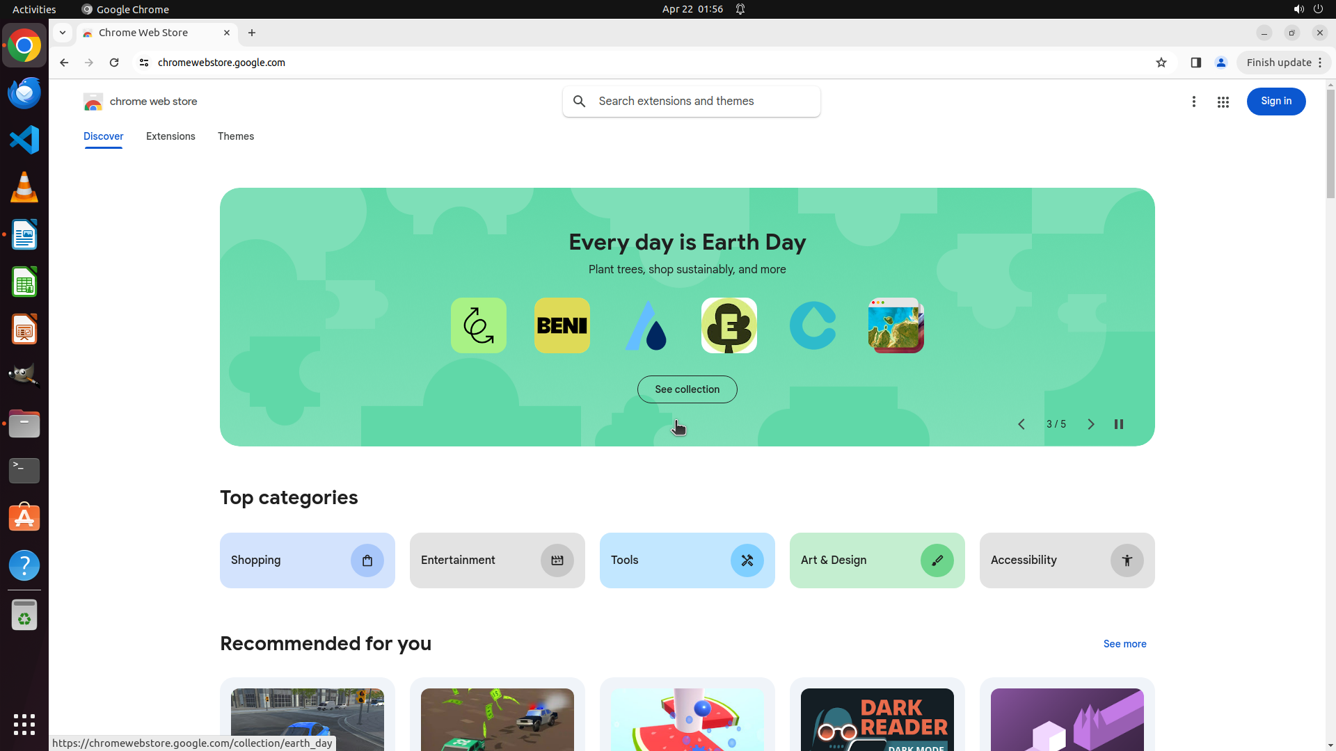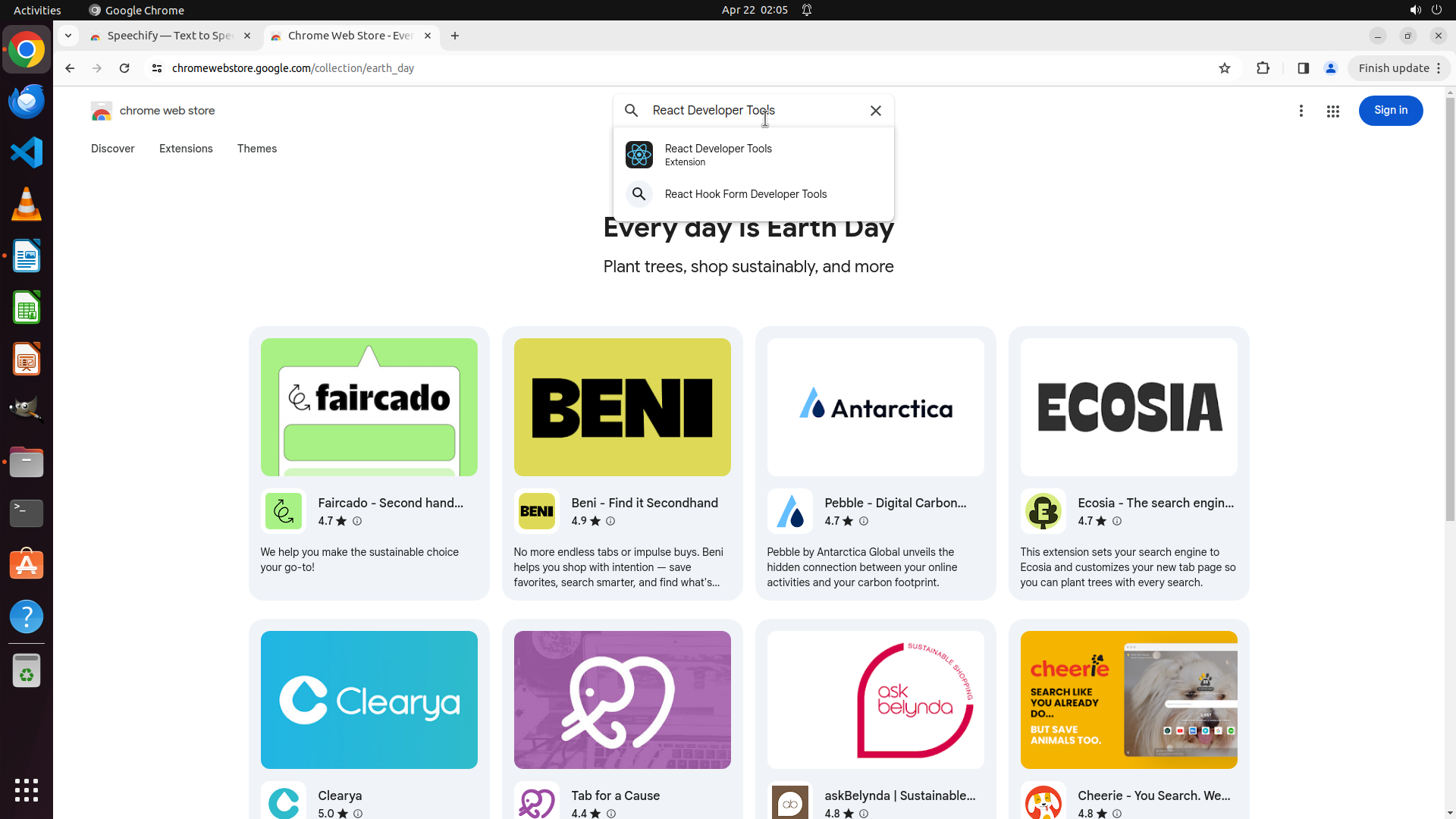 当前屏幕显示 Chrome Web Store 的 "Every day is Earth Day" 集合页面。搜索框已经被激活(光标可见),准备接受输入。根据 LibreOffice 文档,我需要安装的5个插件: