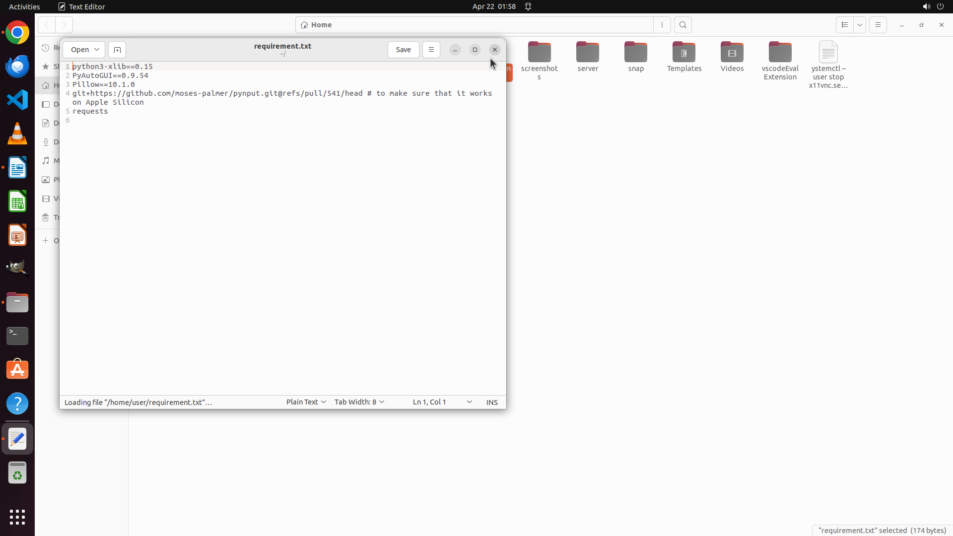我现在在文件管理器中,看到了 Home 目录的内容。其中有一个 "requirement.txt" 文件,这很可能就是包含朋友推荐插件列表的文件。我需要打开这个文件来查看具体的插件名称,然后回到 Chrome Web Store 进行安装。