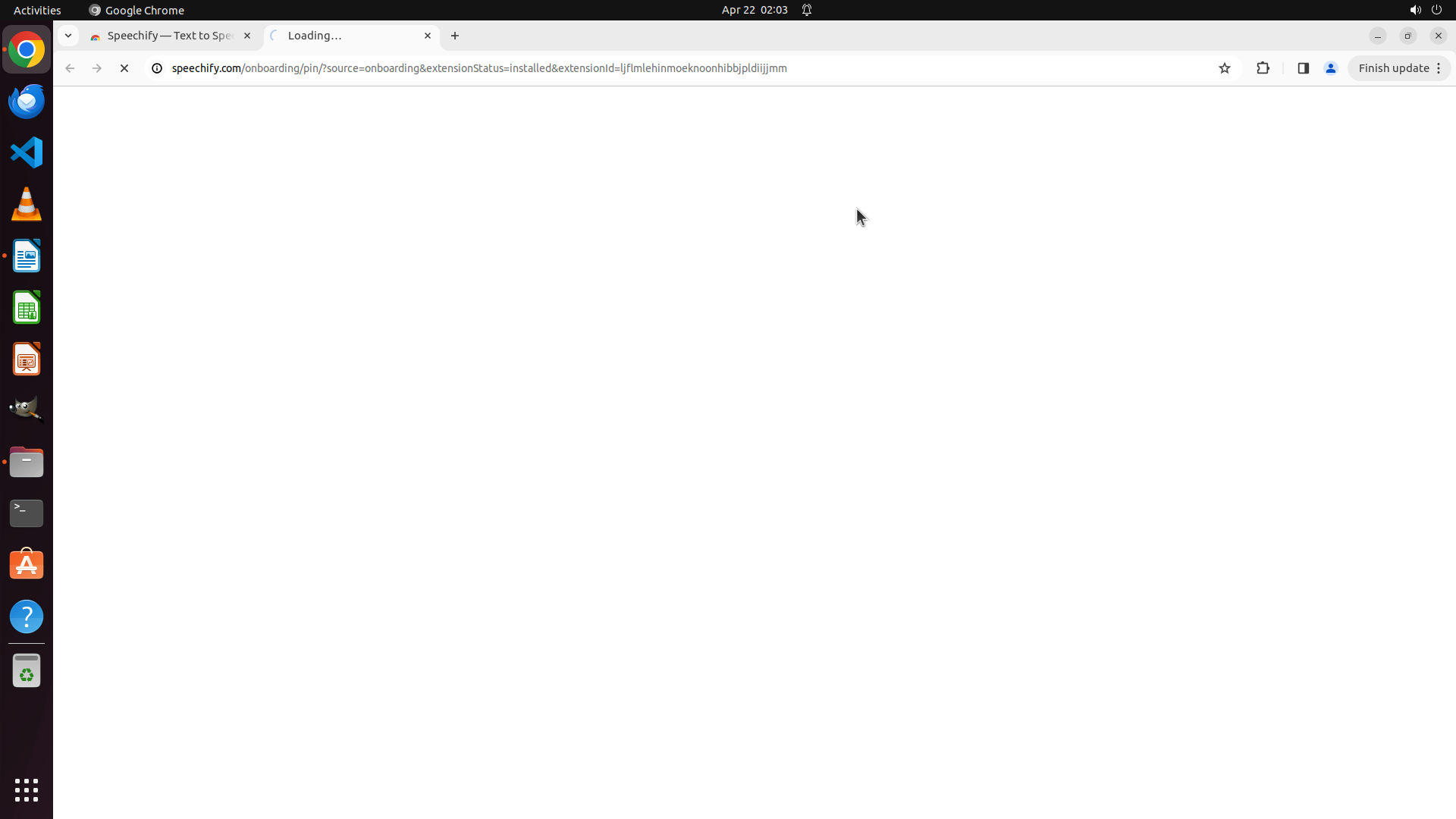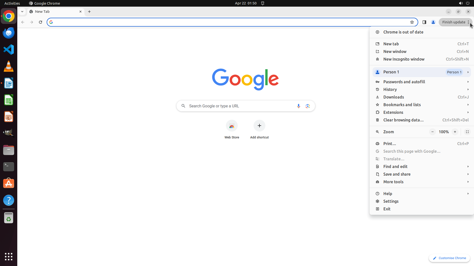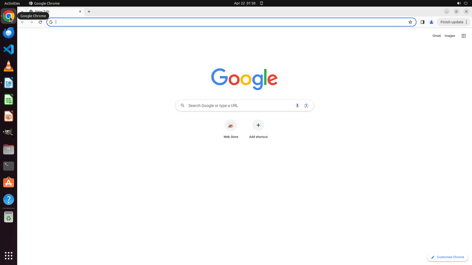 3. **Chrome window layout**: The browser shows a "New Tab" with Google search page, address bar at the top, navigation buttons, and a "Finish update" button in the top-right corner