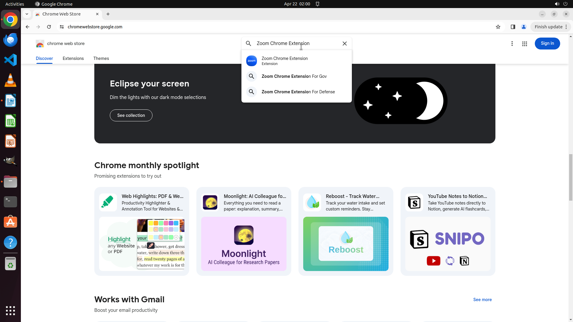 Chrome Web Store 页面显示 Zoom Chrome Extension 已成功安装("Remove from Chrome" 按钮可见)。搜索框位于页面顶部,显示 "Search extensions and themes" 占位文本。根据之前的 LibreOffice 文档,我需要安装5个插件: