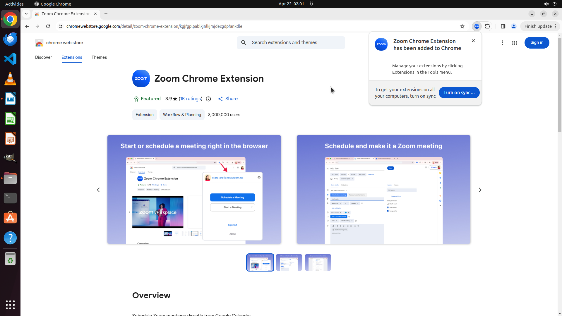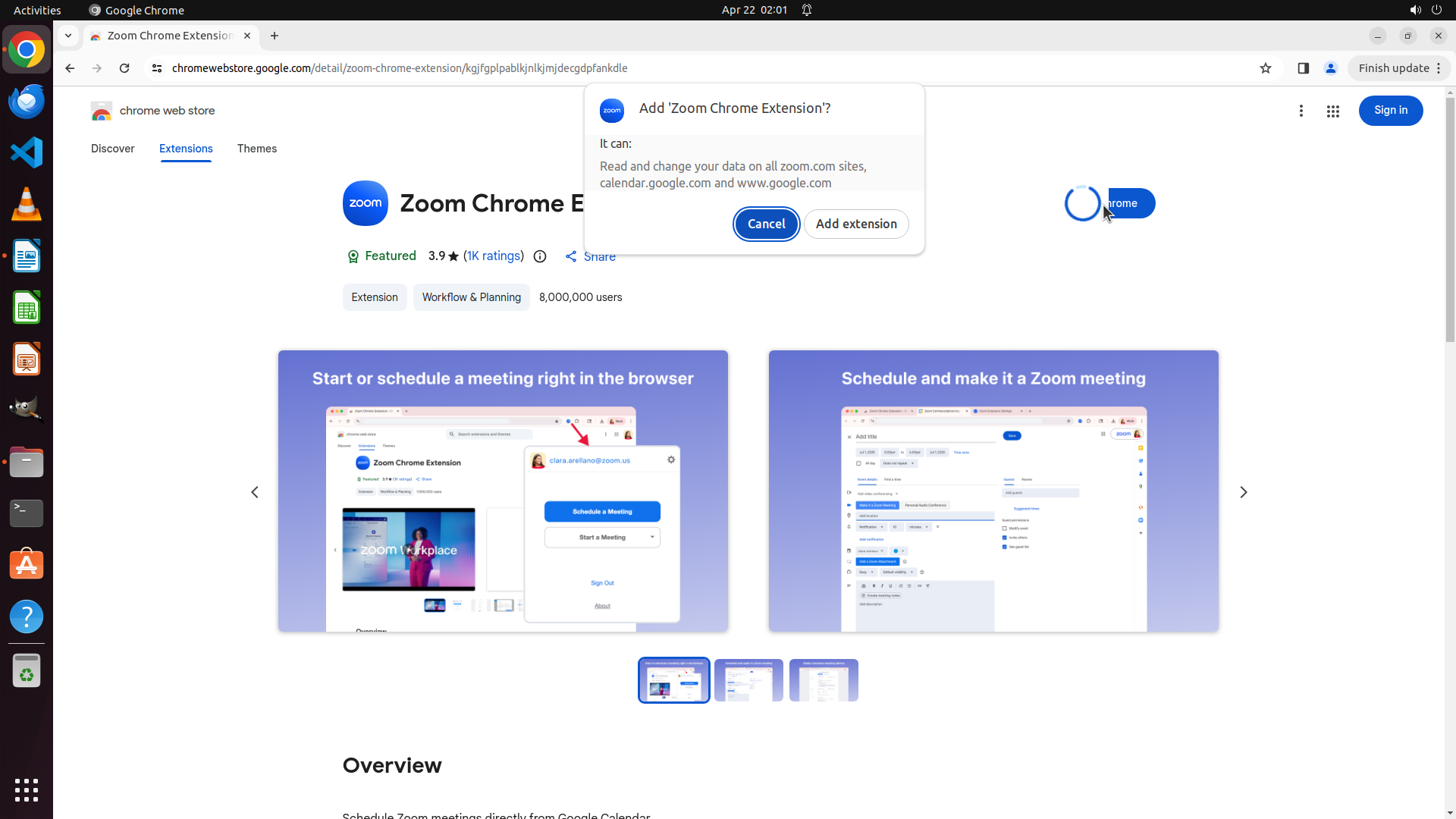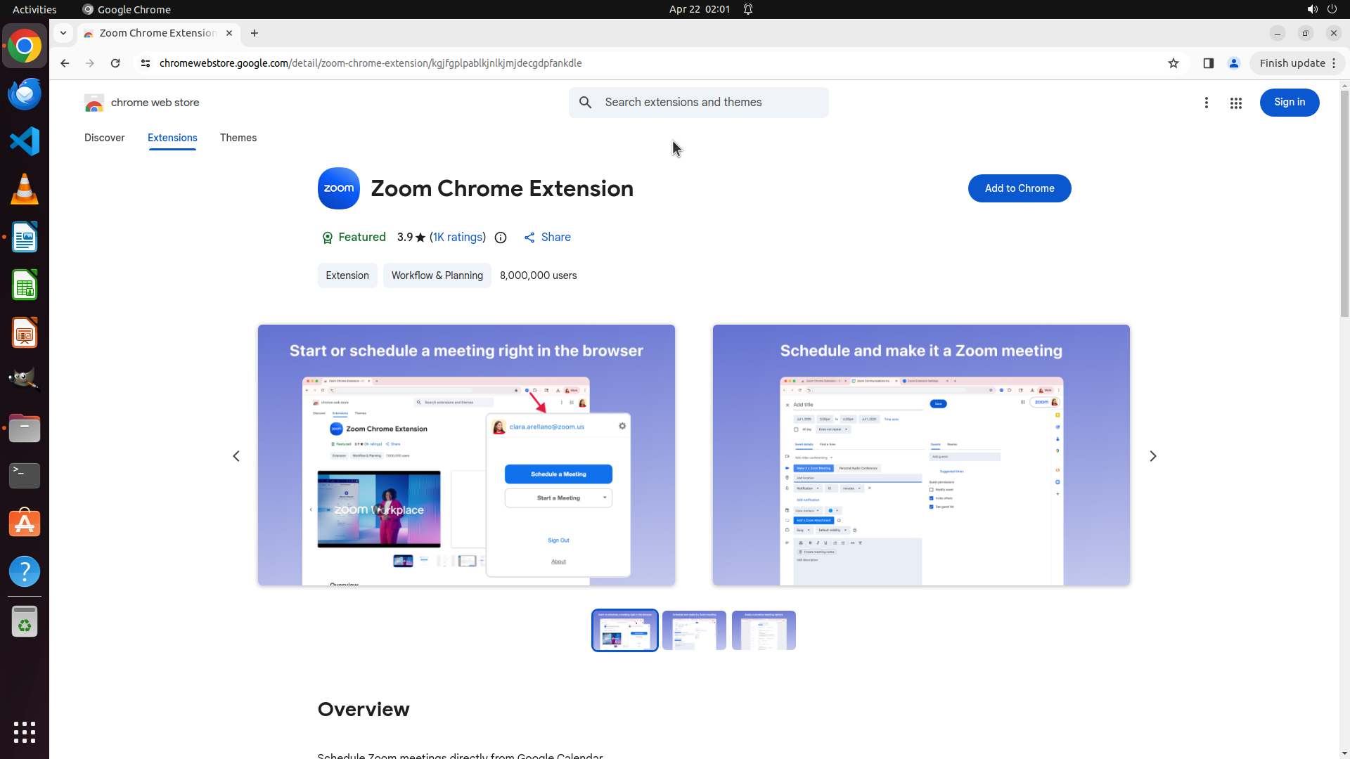 我现在在 Zoom Chrome Extension 的详细页面,这是朋友推荐的第一个插件。我需要: