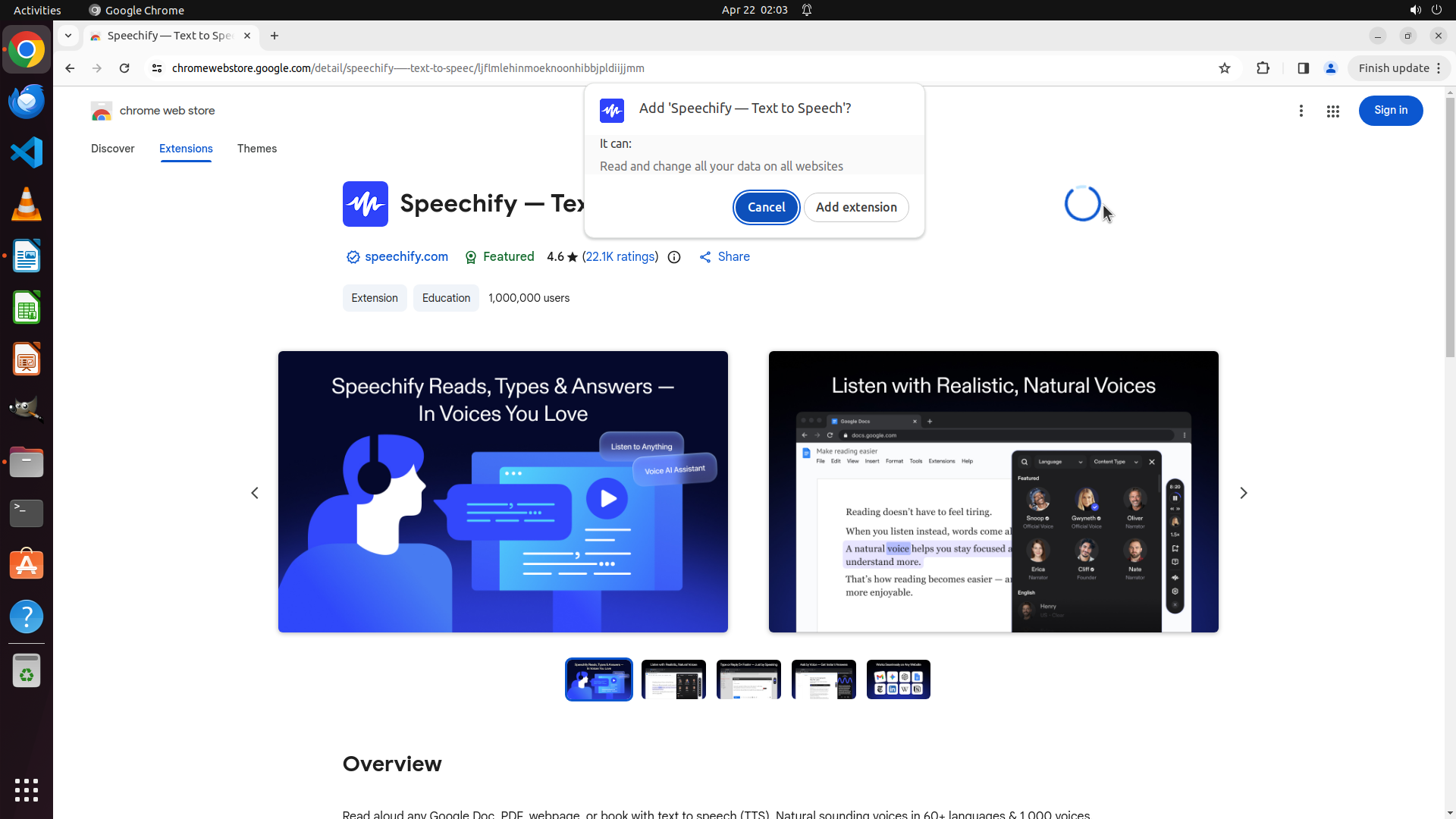 2. Speechify Text to Speech Voice Reader - 🔄 正在安装(确认对话框已显示)