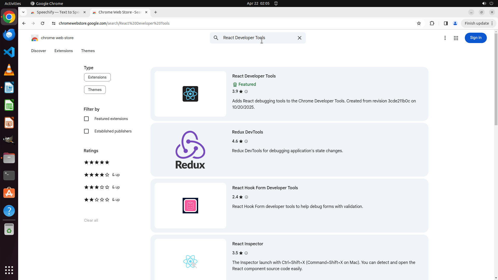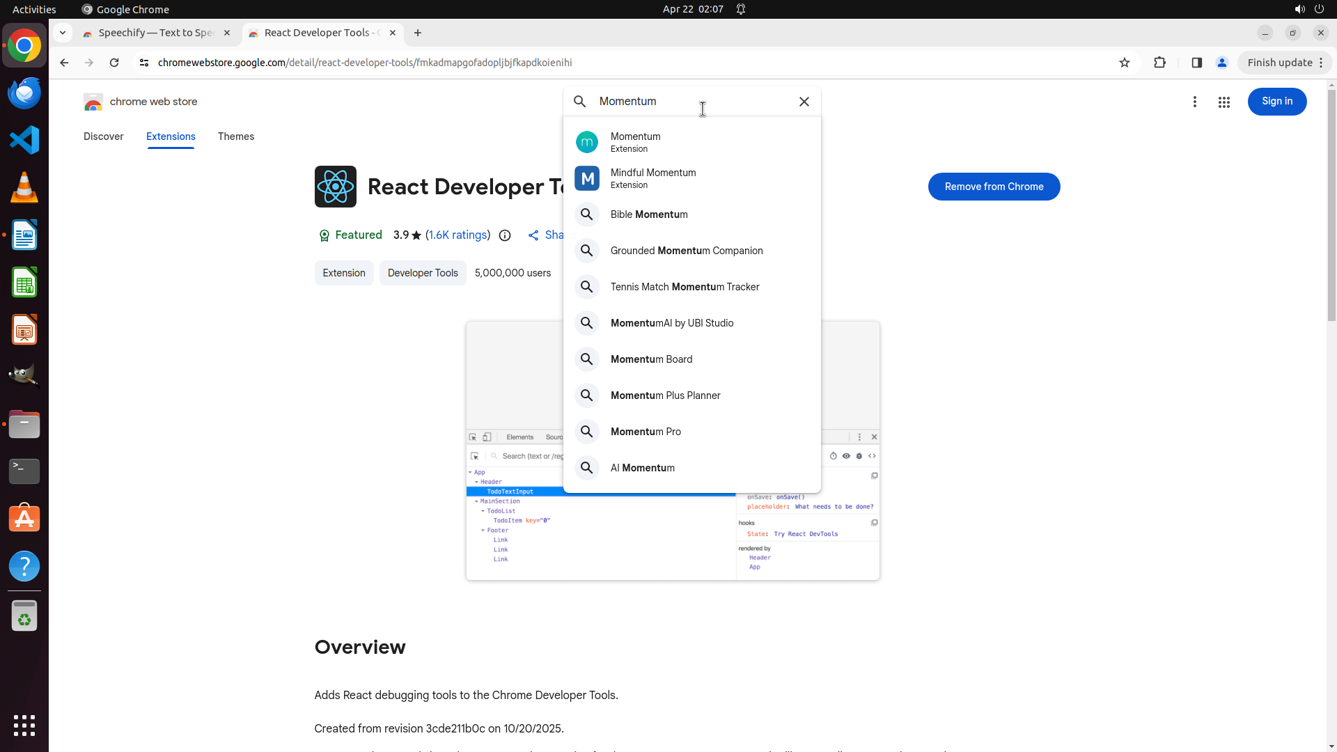 搜索框已经激活,我可以直接输入第三个插件的名称 "React Developer Tools" 进行搜索。虽然 Speechify 的安装结果不确定,但我可以继续安装其他插件,最后统一验证所有插件是否都已成功安装。