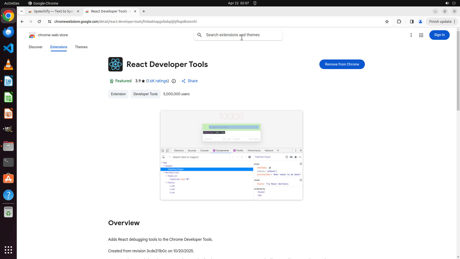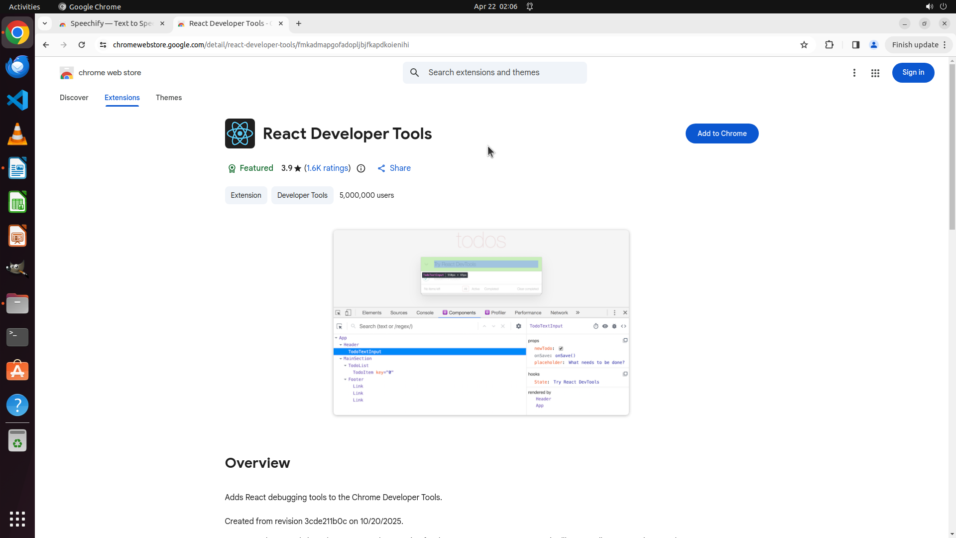 当前屏幕显示 Chrome Web Store 中 "Speechify — Text to Speech" 扩展的详细页面。页面显示: