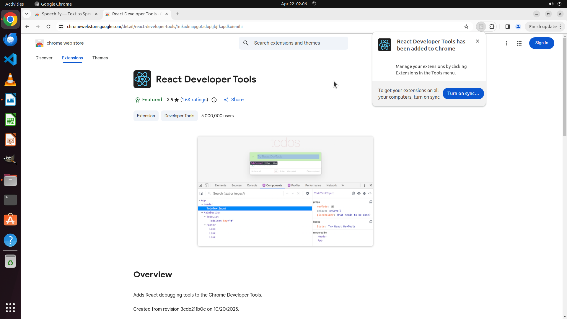 点击 "Add extension" 后,我应该会看到安装成功的通知,然后需要继续搜索并安装第三个插件 "React Developer Tools"。