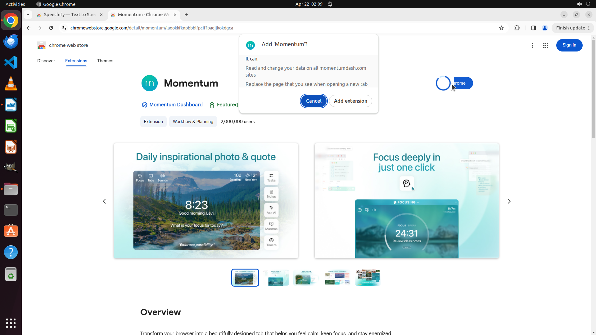 我现在需要点击 "Add extension" 按钮来确认安装 Speechify 插件。这是第二个插件的安装确认步骤。