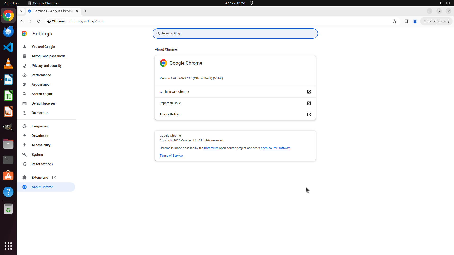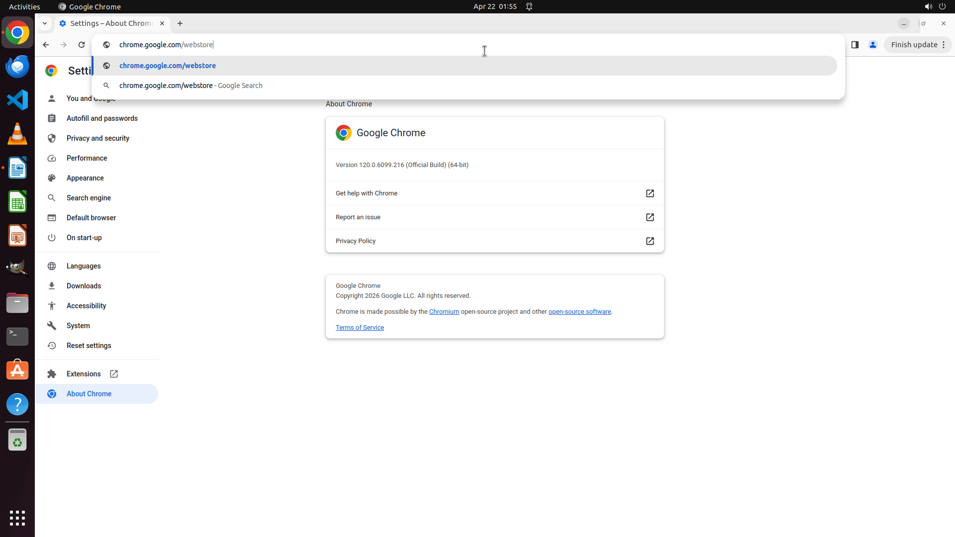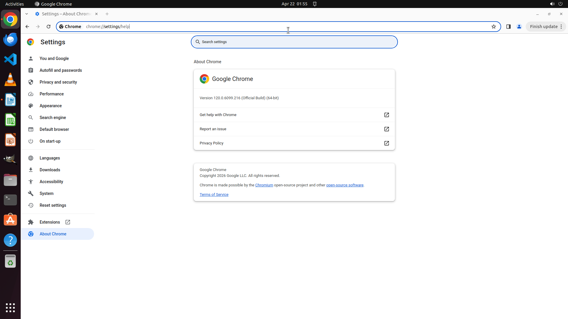 当前屏幕显示 Google Chrome 浏览器已打开,但当前页面是 Chrome 设置页面的"About Chrome"部分(chrome://settings/help)。浏览器版本为 120.0.6099.216。左侧边栏显示了设置菜单选项,包括 Extensions(扩展程序)选项。