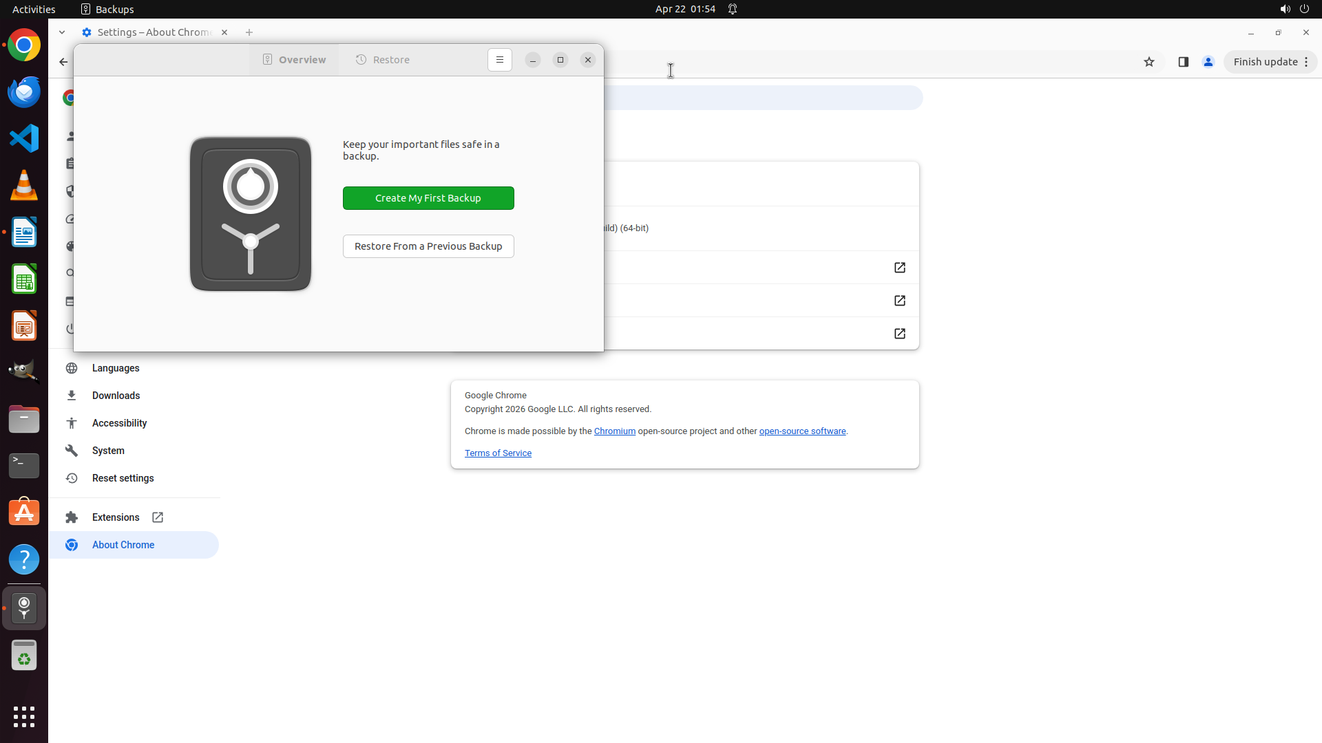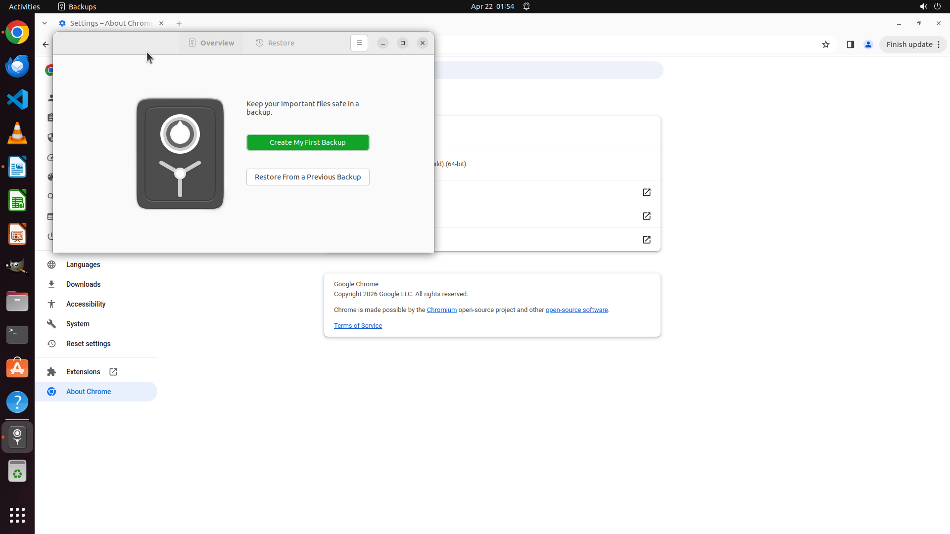 备份对话框仍然显示在屏幕上,之前的点击操作没有成功关闭它。对话框显示"Backups"应用程序,有"Overview"和"Restore"标签页,以及"Create My First Backup"和"Restore From a Previous Backup"按钮。Chrome浏览器在对话框后面,仍然显示About Chrome设置页面。