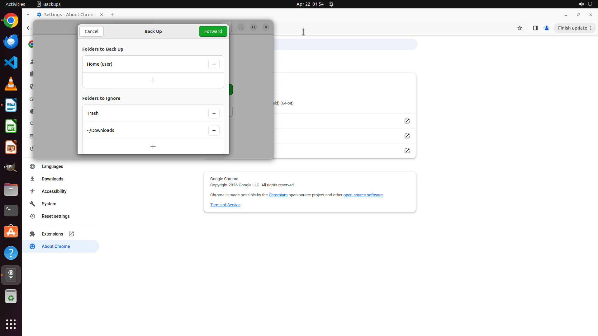 当前屏幕上出现了一个"Back Up"备份对话框,这不是预期的Chrome Web Store页面。这个对话框显示"Folders to Back Up"和"Folders to Ignore"选项,有Cancel和Forward按钮。Chrome浏览器窗口在对话框后面,仍然显示About Chrome设置页面。