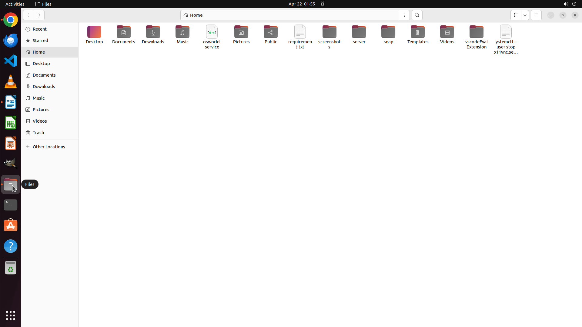 当前屏幕显示的是 Ubuntu 文件管理器(Files),显示了 Home 目录的内容。之前的操作错误地点击了文件管理器图标,导致从 Chrome 浏览器切换到了文件管理器。在之前的截图中,Chrome 已经成功导航到了 Chrome Web Store 页面(chromewebstore.google.com)。
