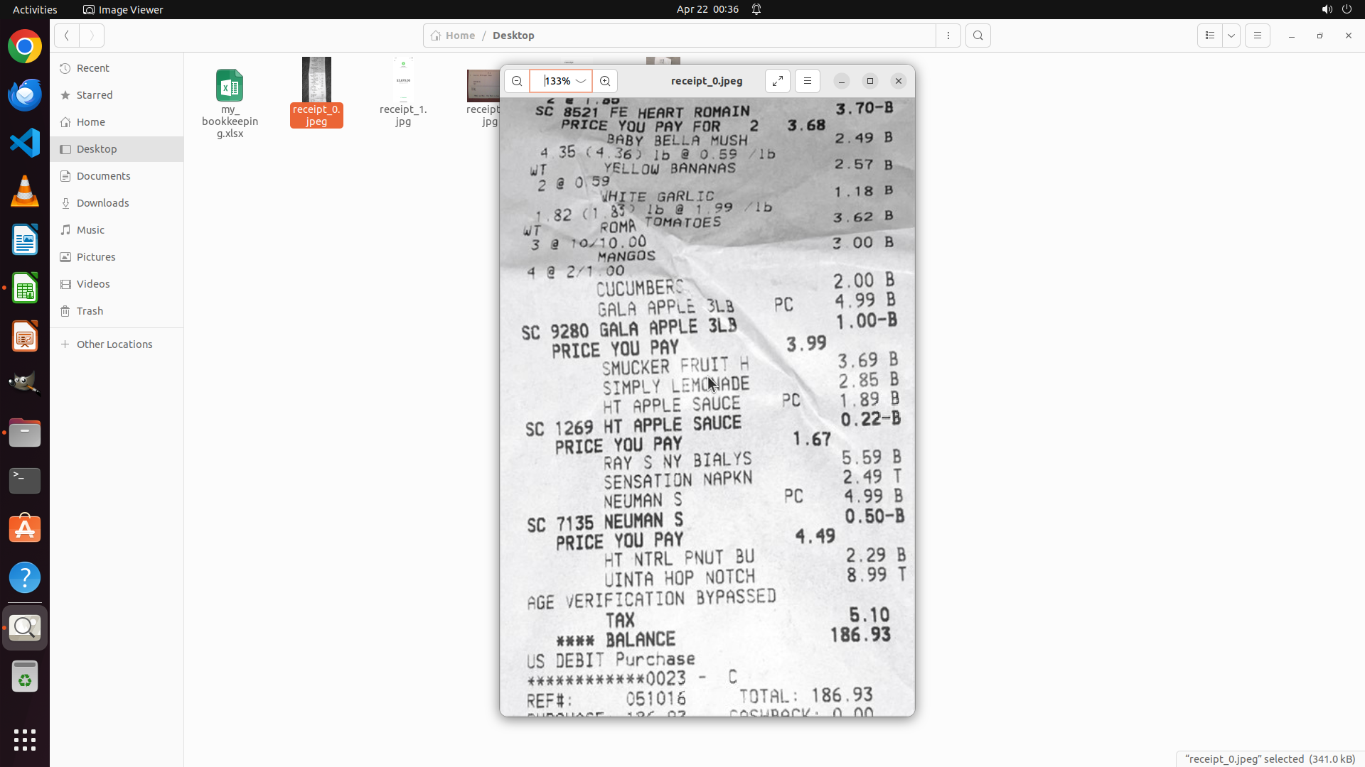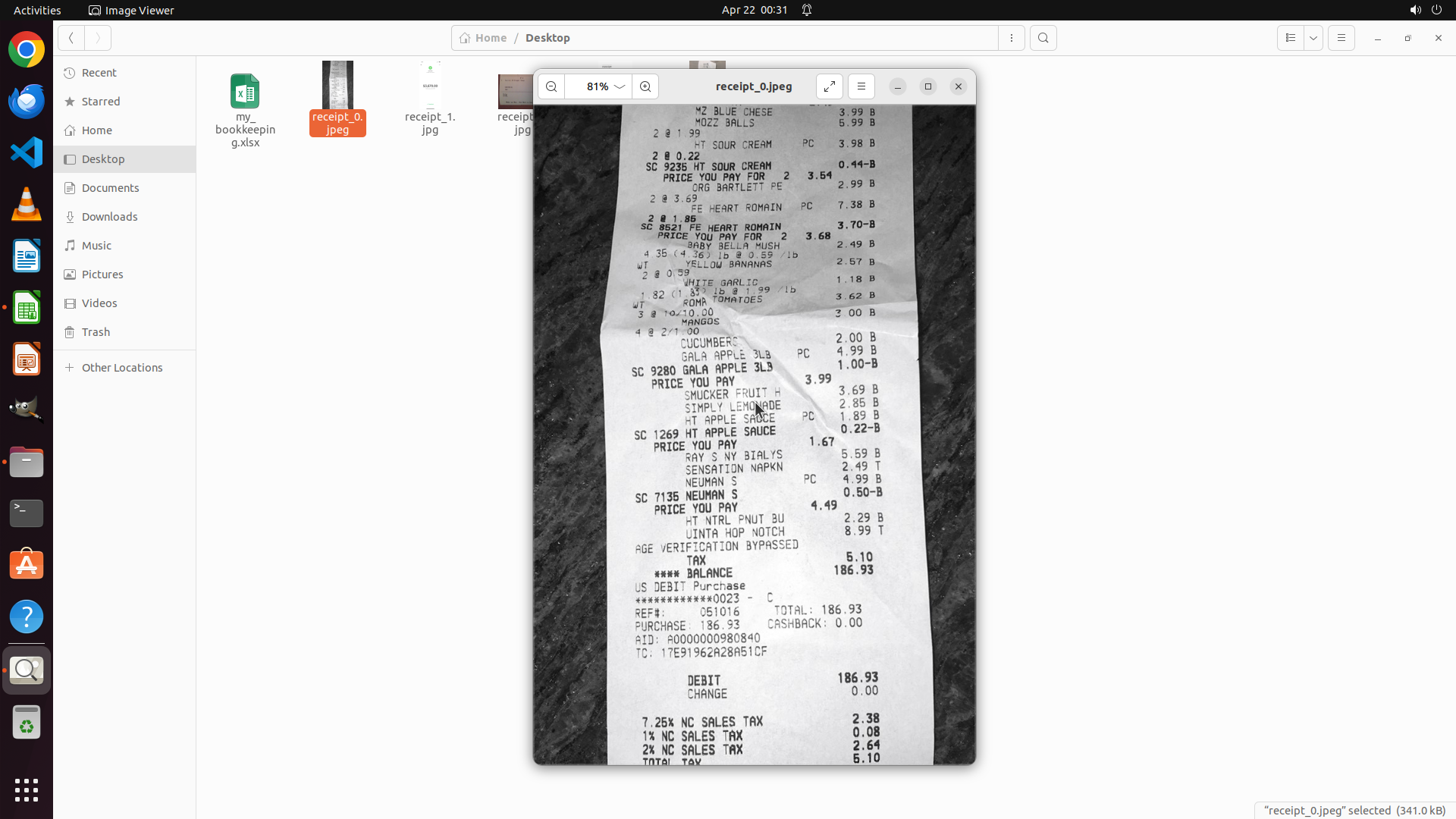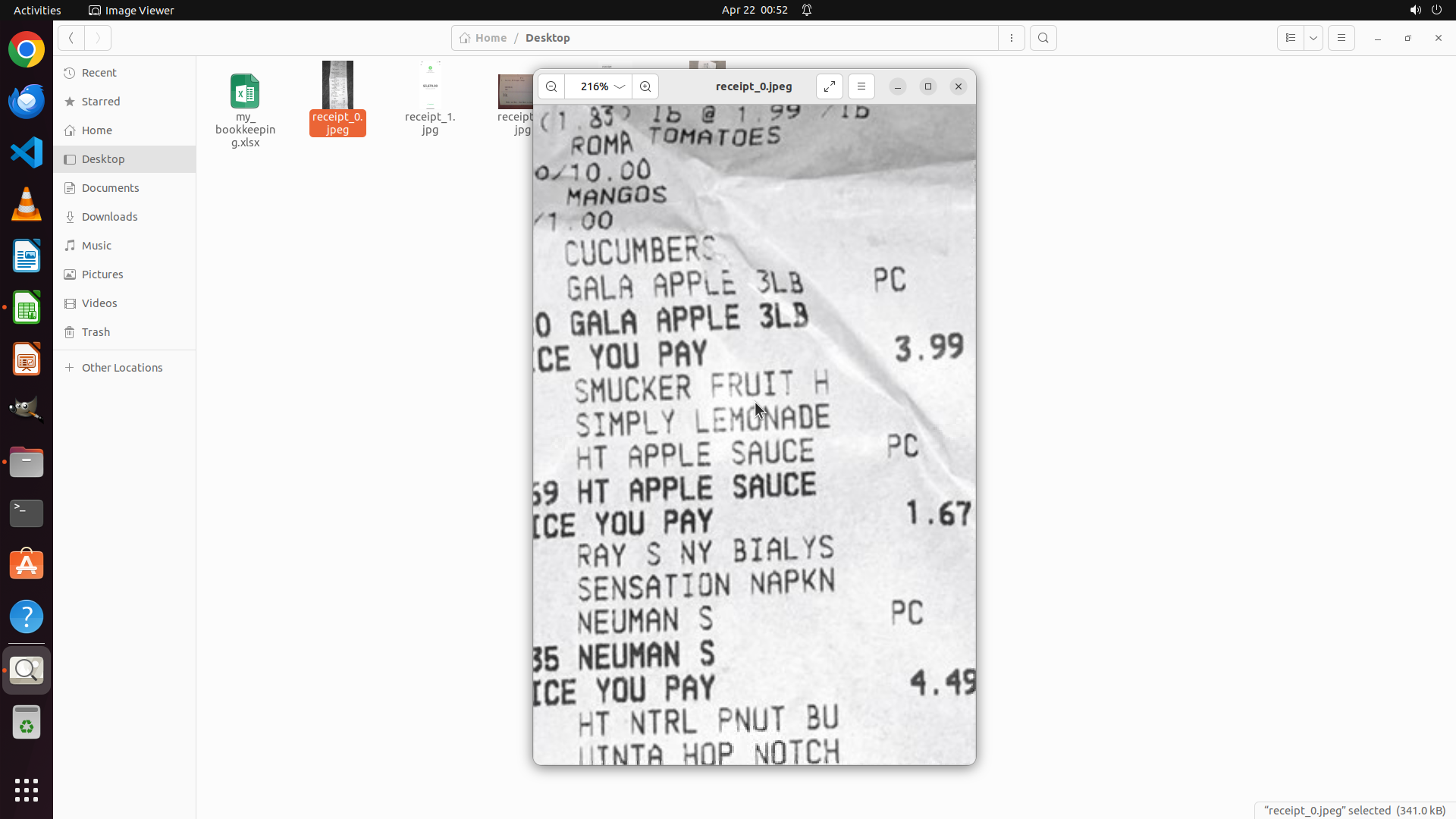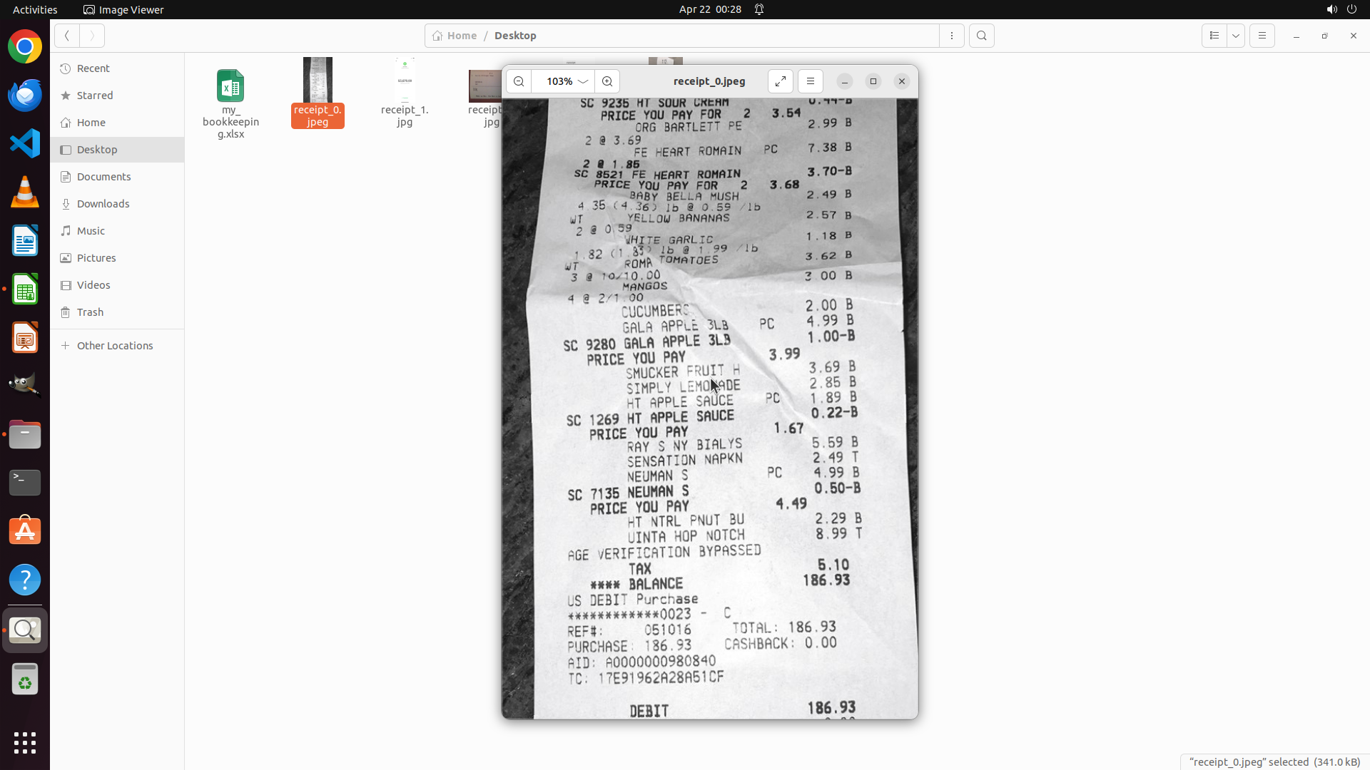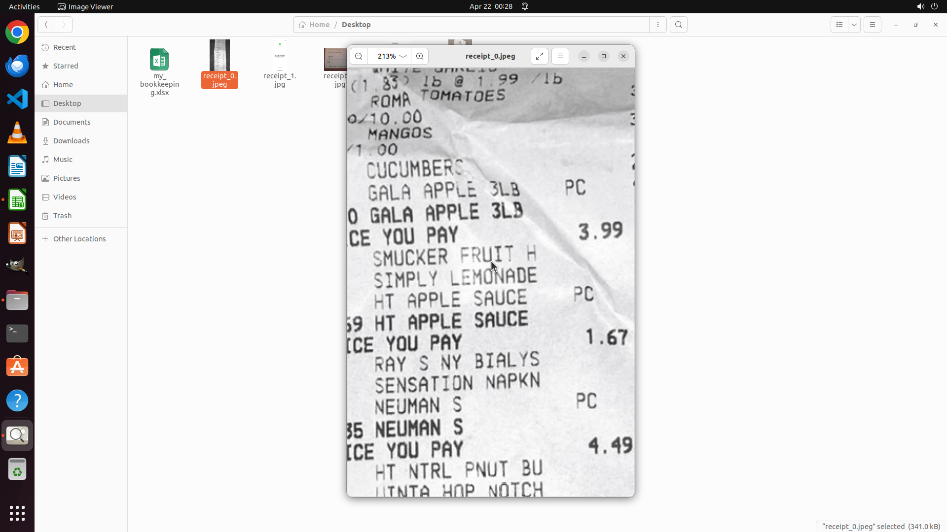 - 文件浏览器左侧显示Desktop文件夹中有my_bookkeeping.xlsx文件和多个receipt文件
