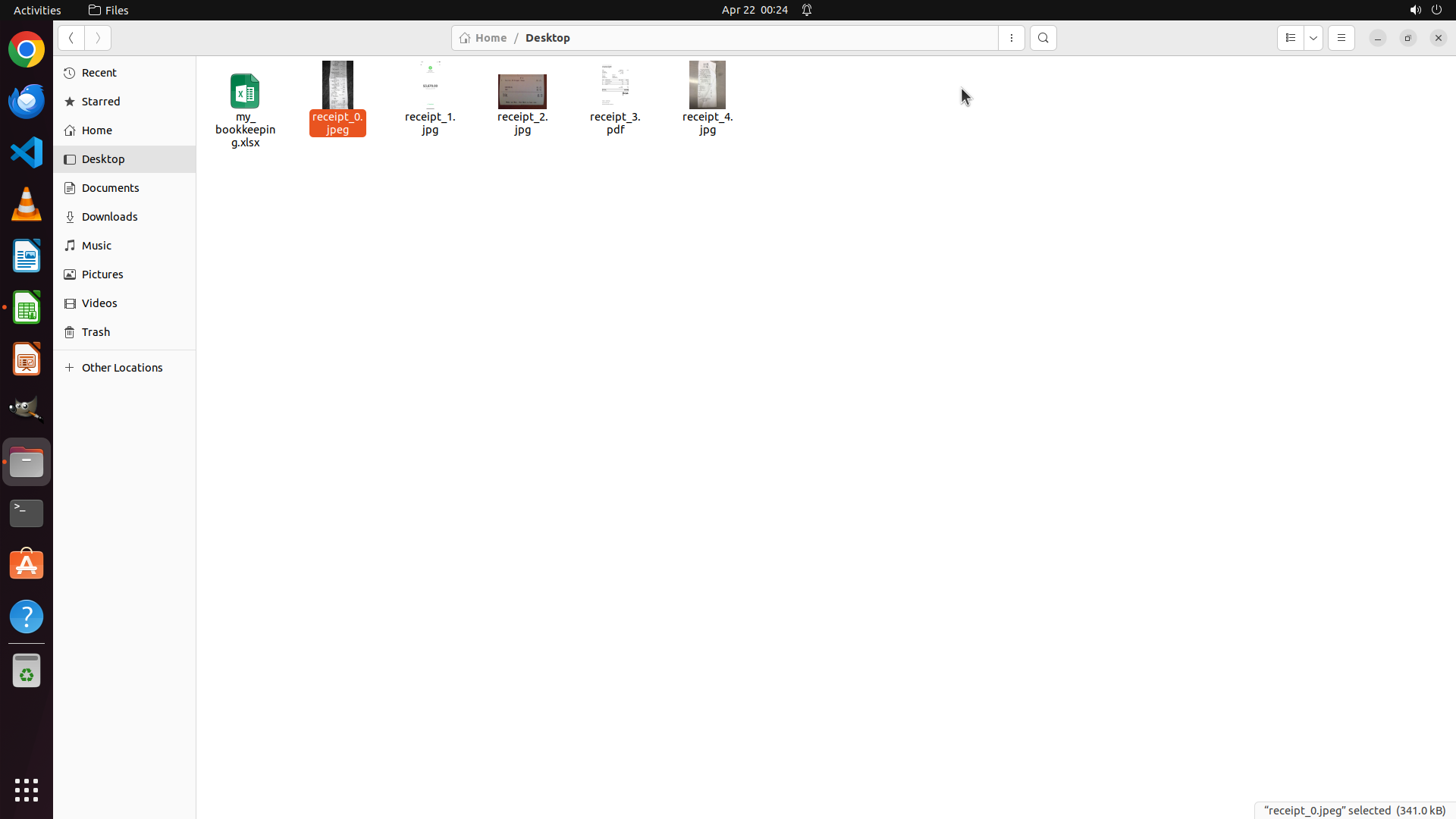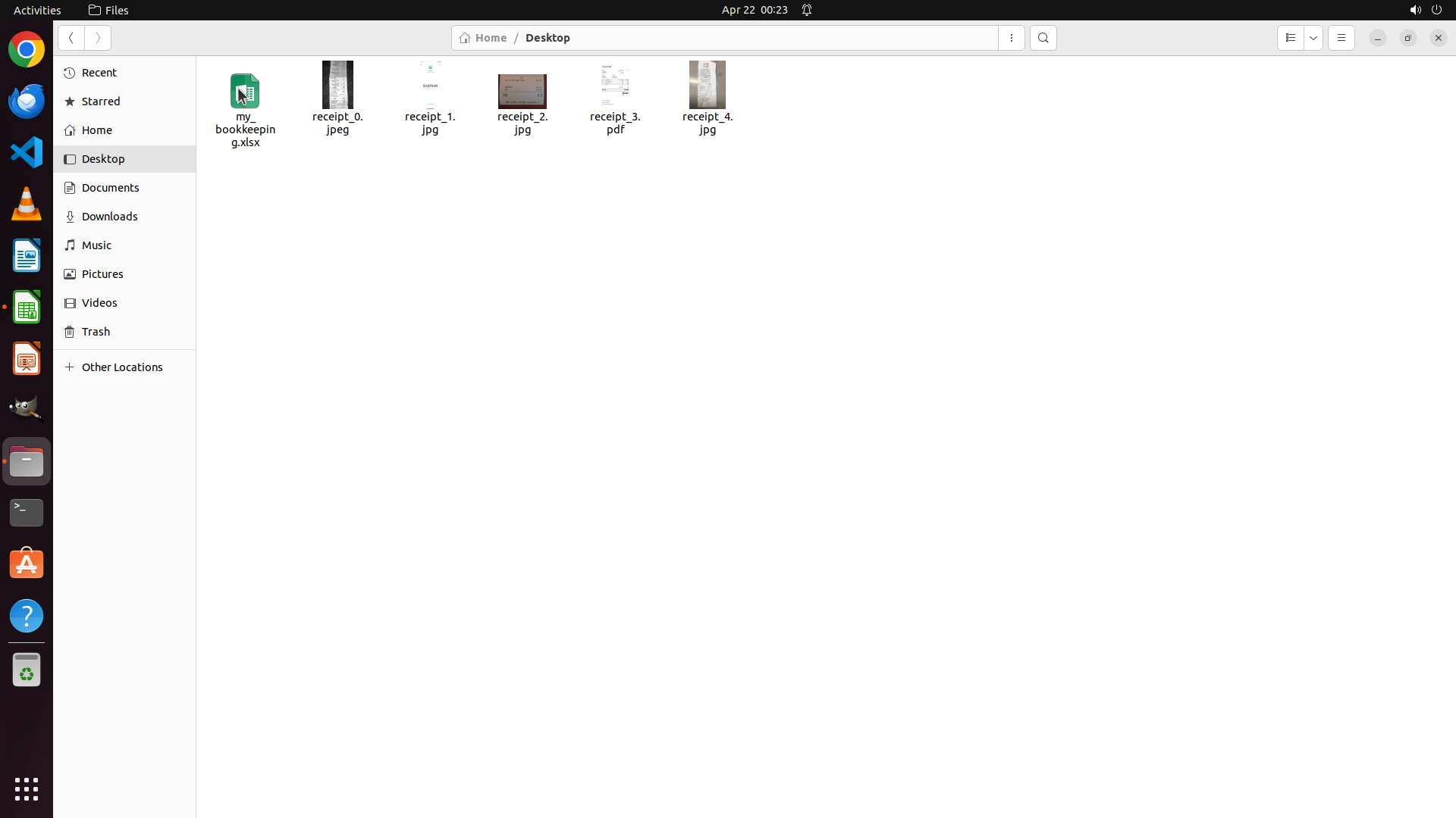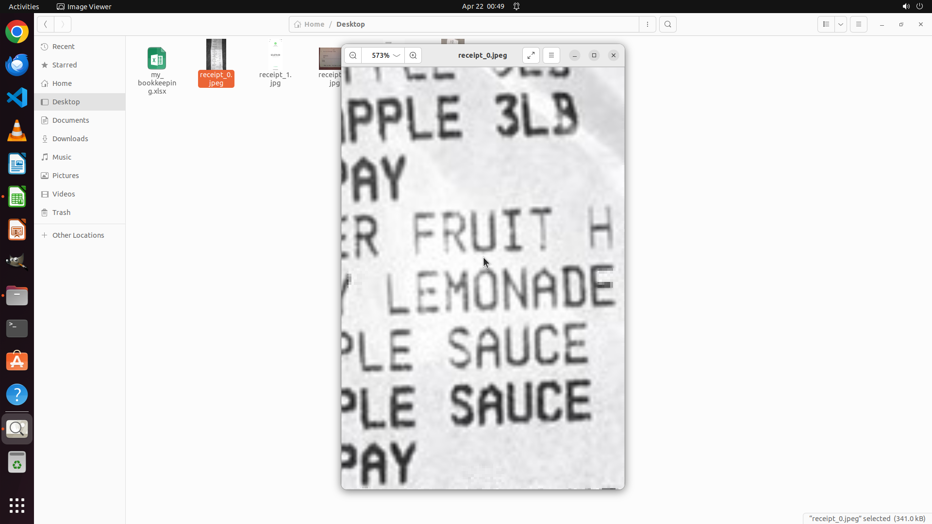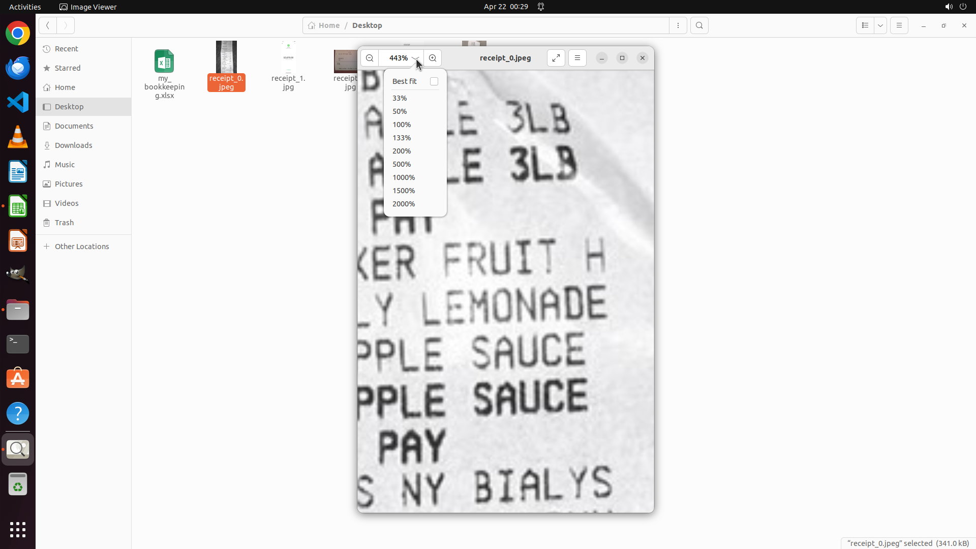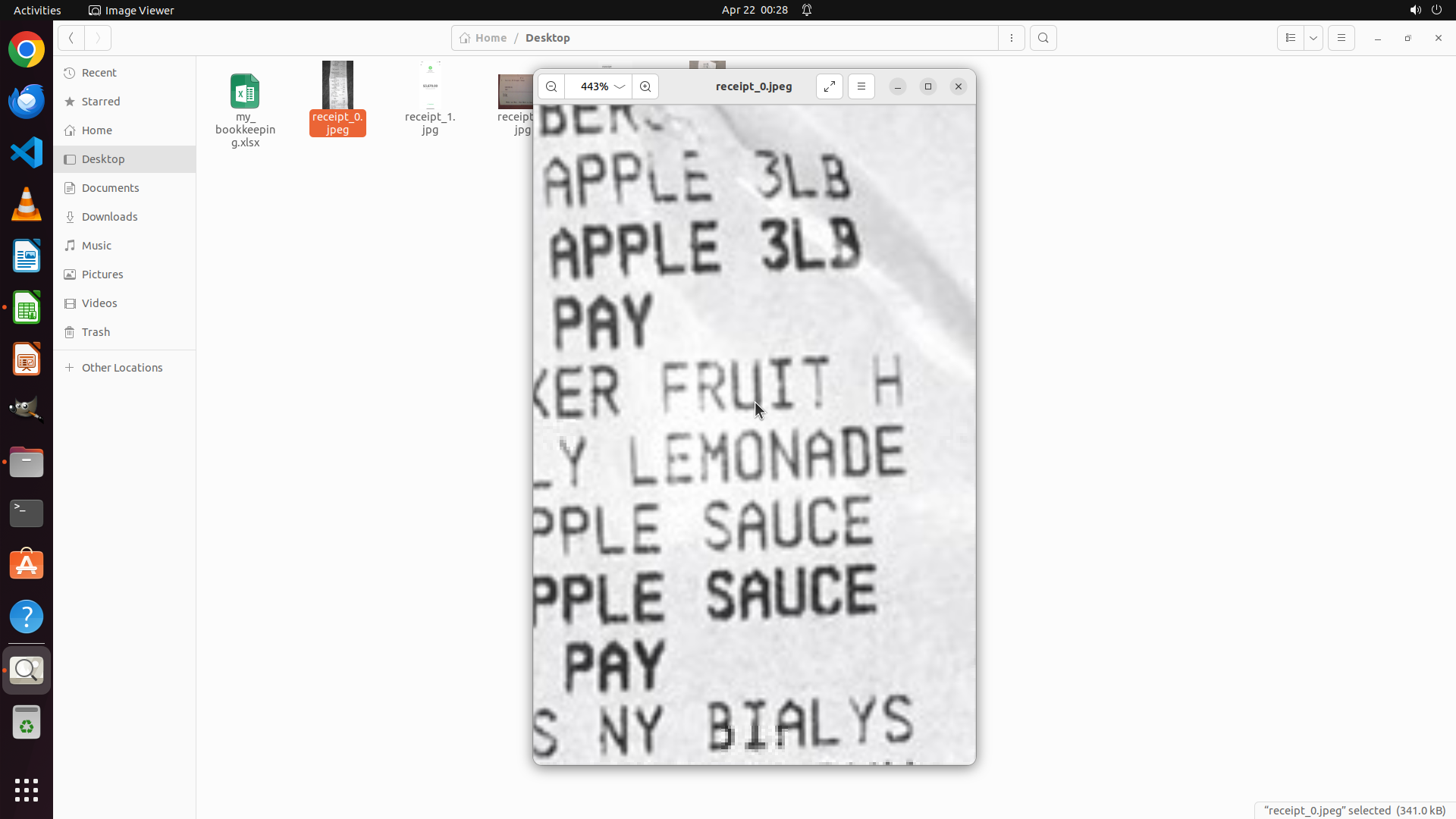 - 文件浏览器左侧显示Desktop文件夹中有my_bookkeeping.xlsx文件和多个receipt文件