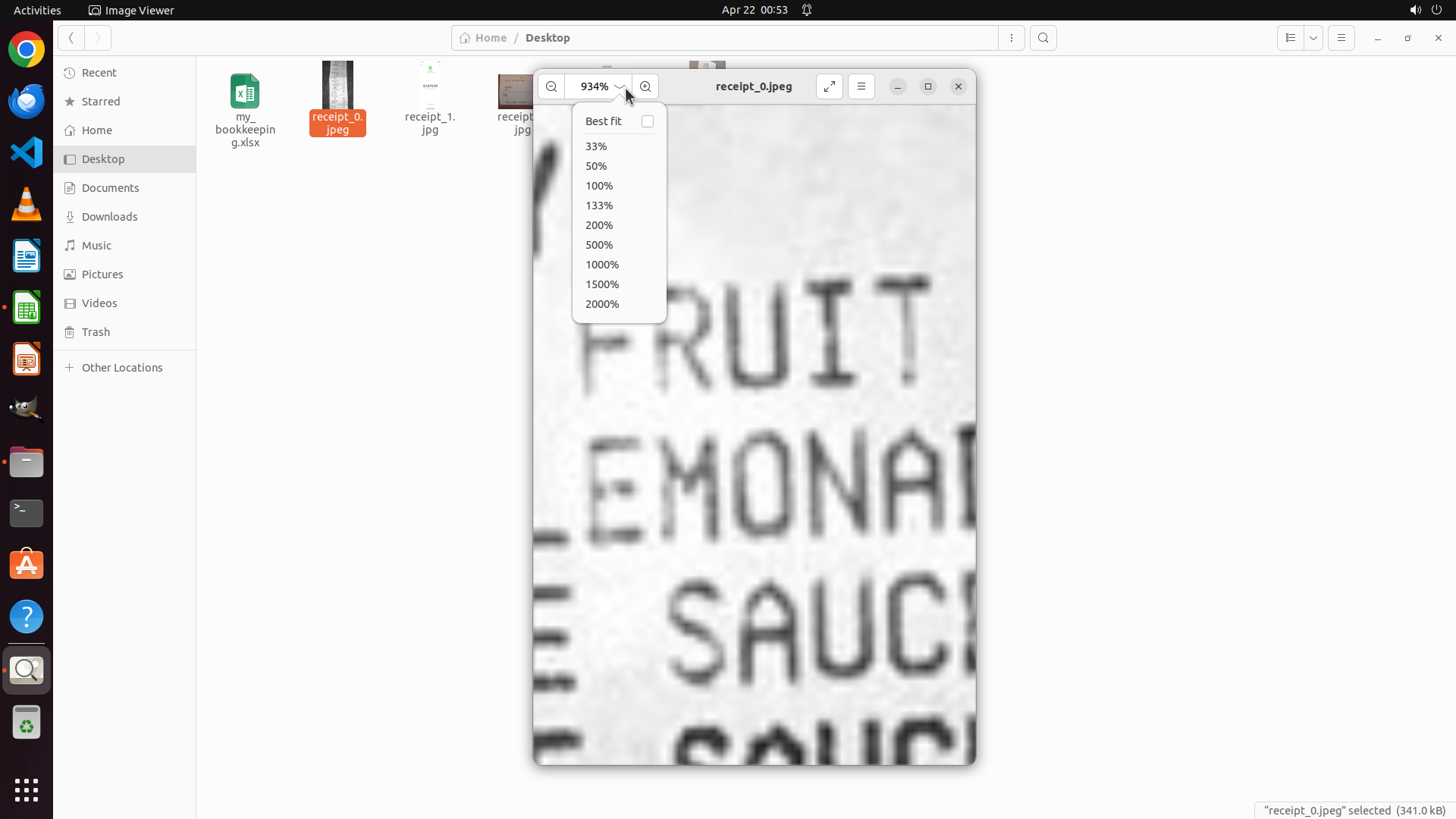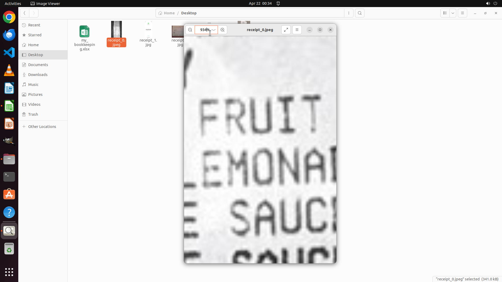 当前屏幕显示Image Viewer应用以934%的极高缩放比例打开了receipt_0.jpeg收据文件。这个缩放比例过高,视野非常受限,只能看到局部的大号文字: