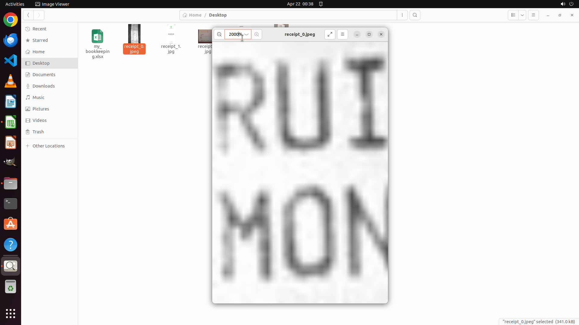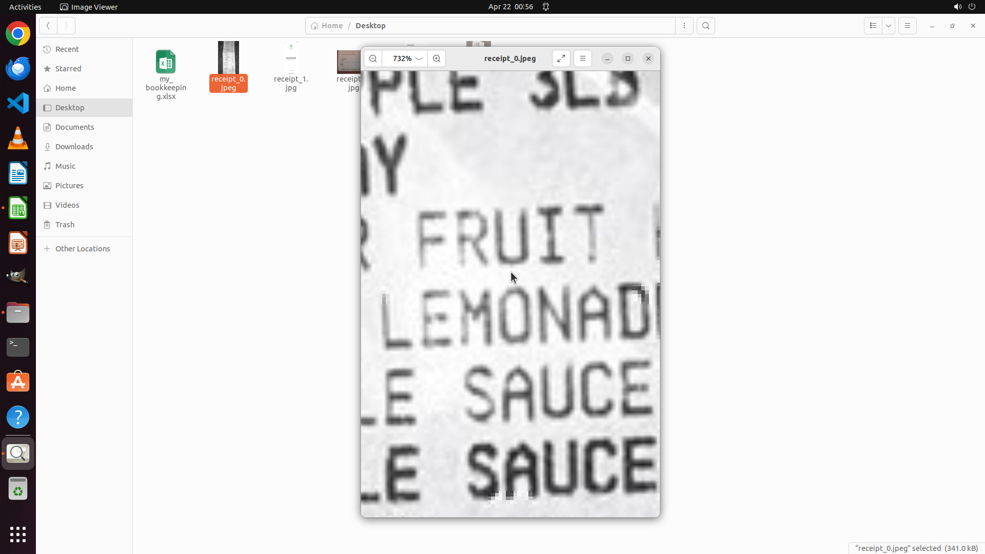 当前屏幕显示Image Viewer应用以732%的极高缩放比例打开了receipt_0.jpeg收据文件。当前视图显示局部放大的文字: