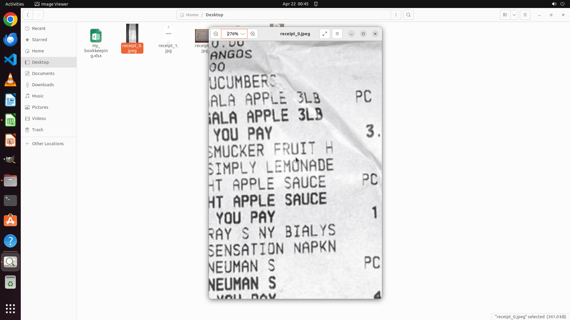 当前屏幕显示Image Viewer应用以276%缩放比例打开了receipt_0.jpeg收据文件。当前视图显示收据的中部区域,可以看到: