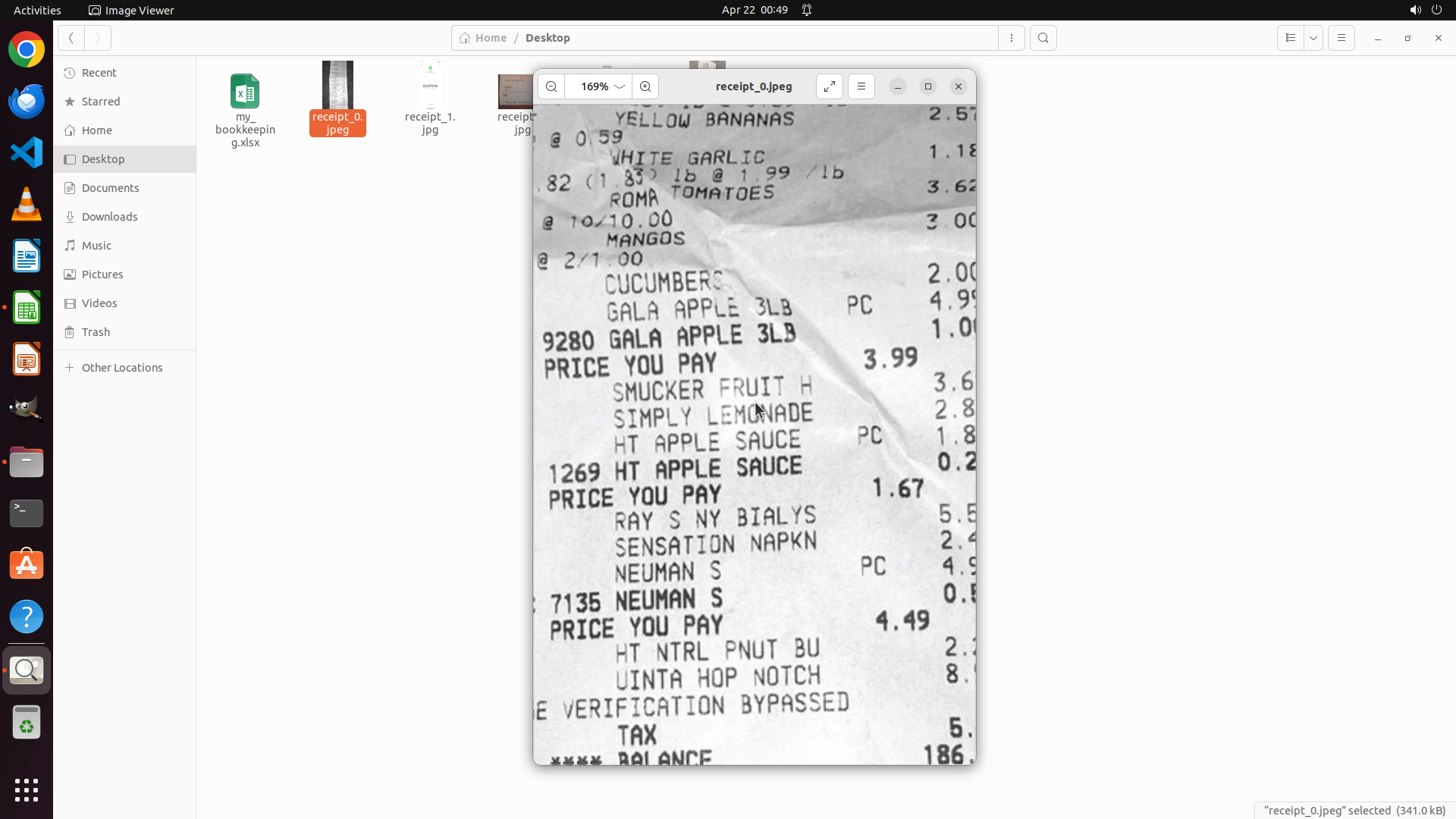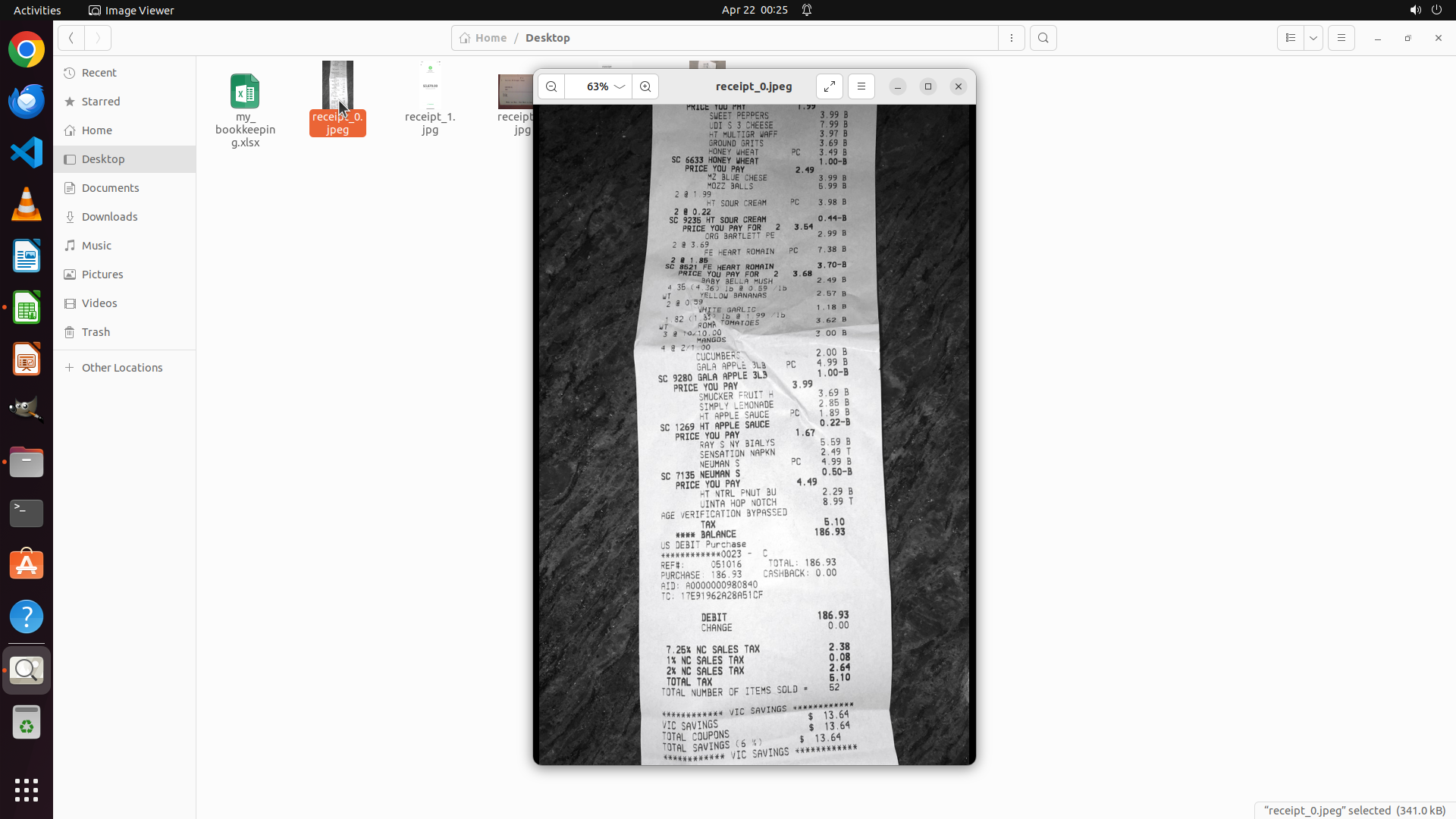 当前屏幕显示Image Viewer应用打开了receipt_0.jpeg收据文件。经过向上滚动后,我现在可以看到收据的中间部分,显示了各种商品: