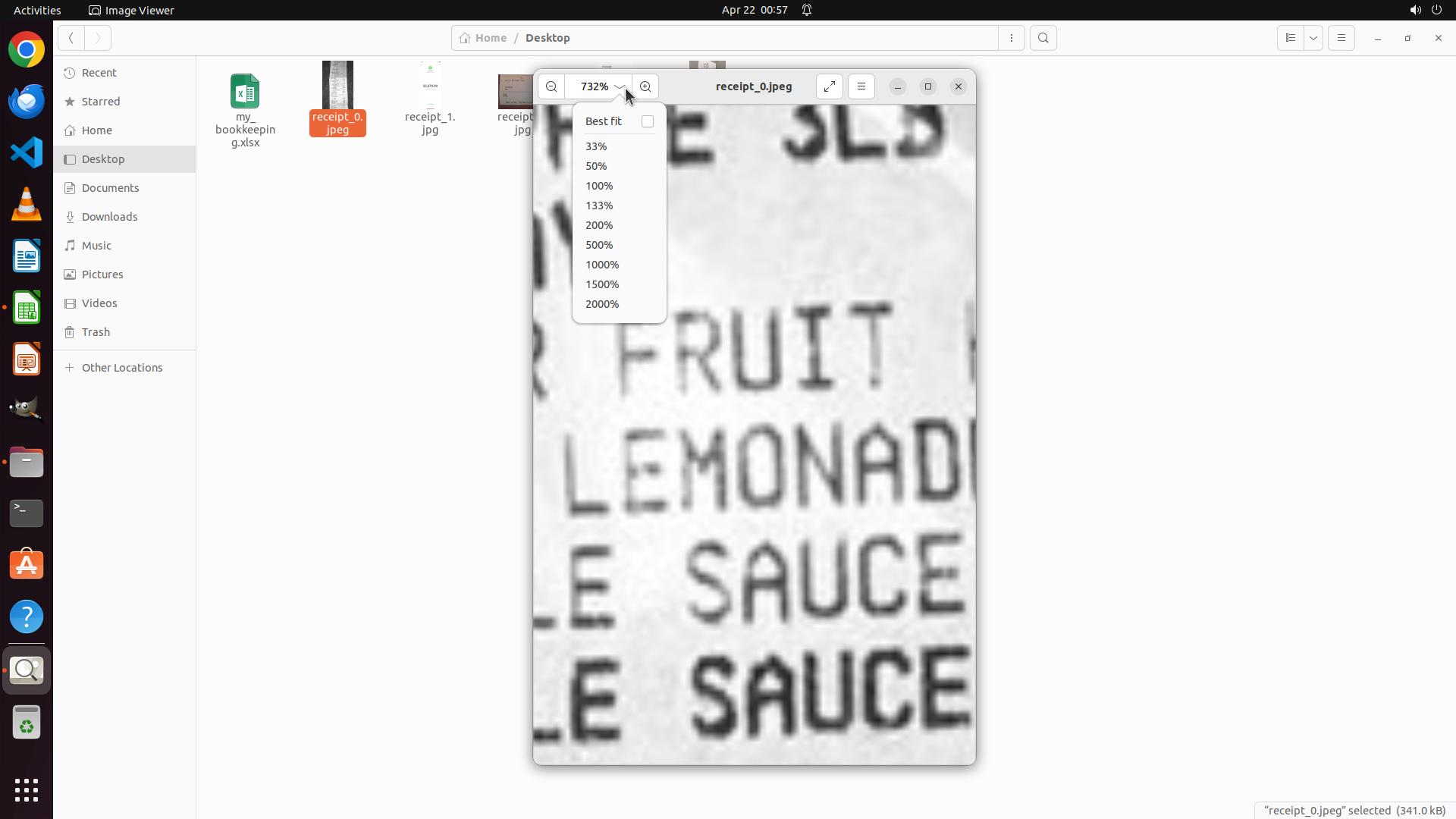 当前屏幕显示Image Viewer应用以732%的极高缩放比例打开了receipt_0.jpeg收据文件。缩放比例下拉菜单已成功打开,显示以下选项: