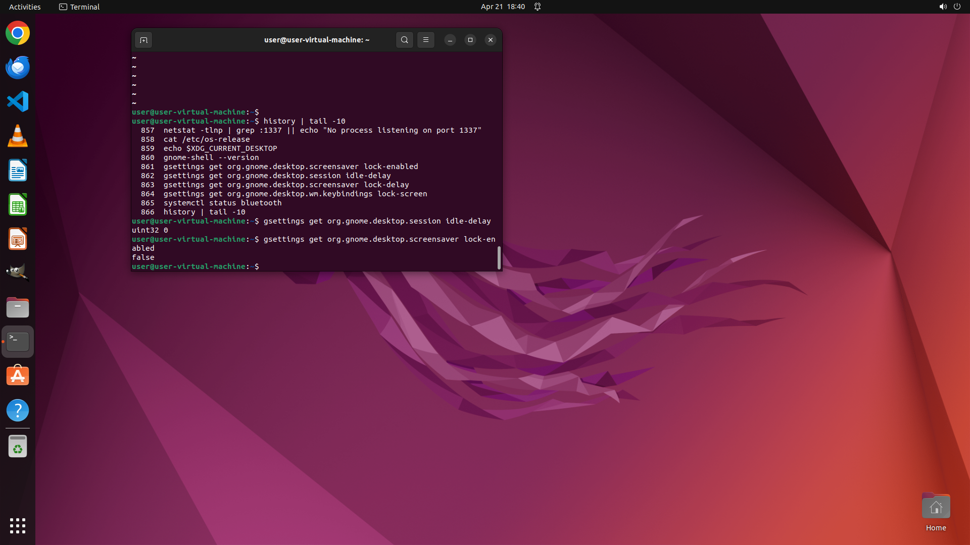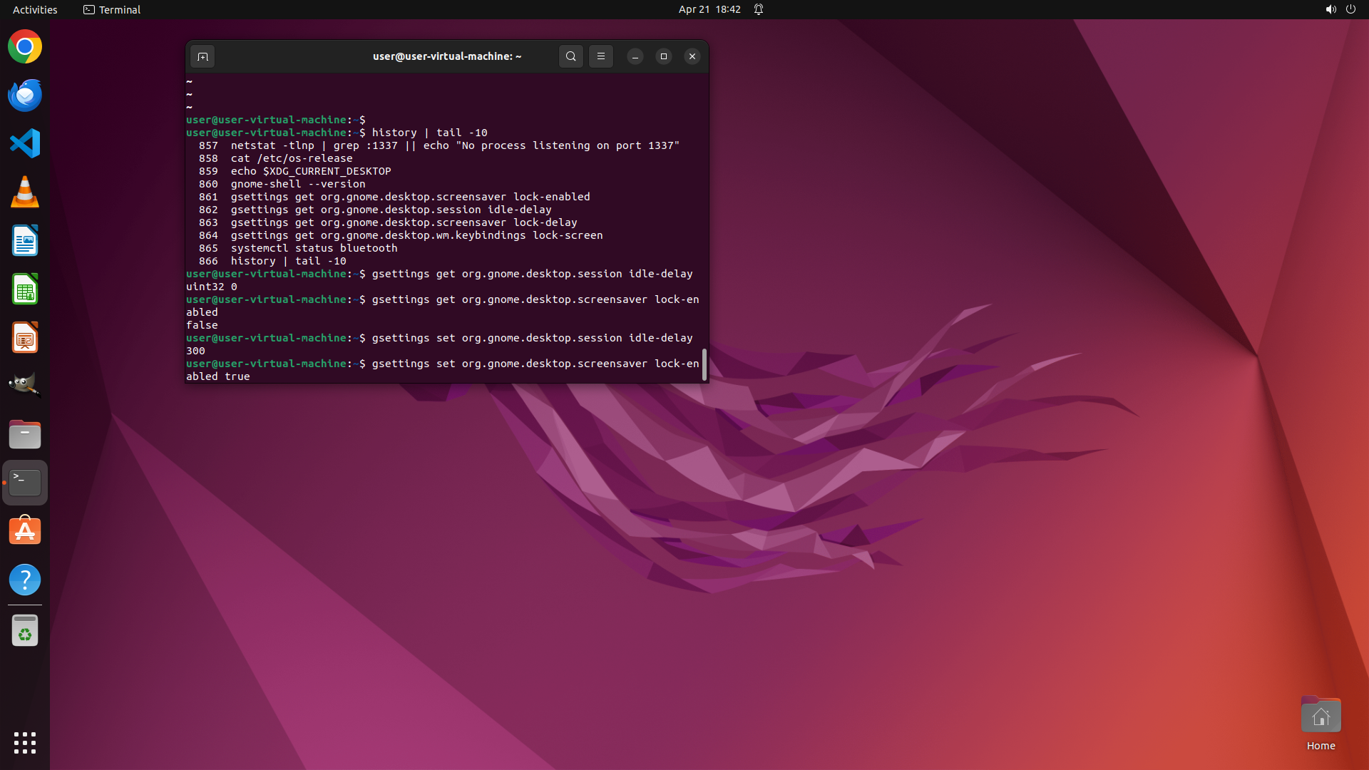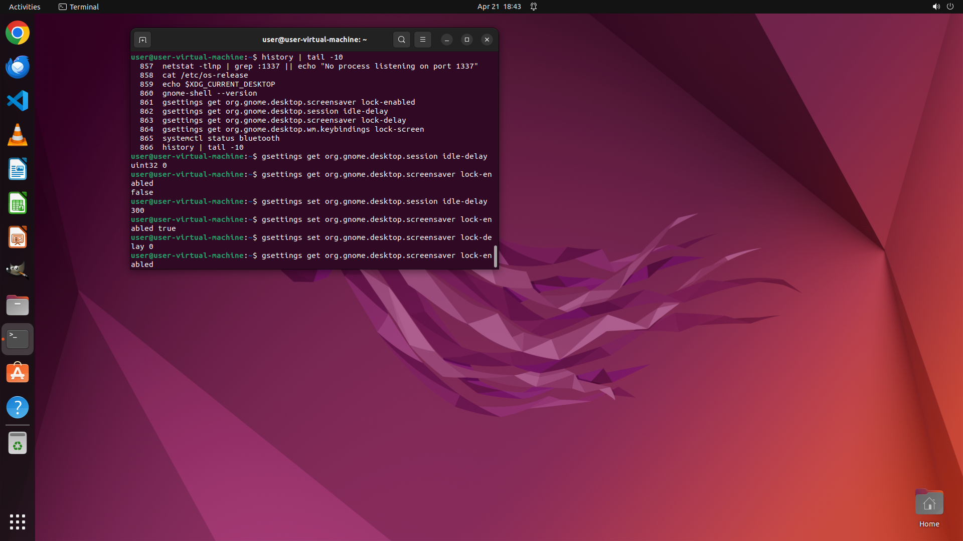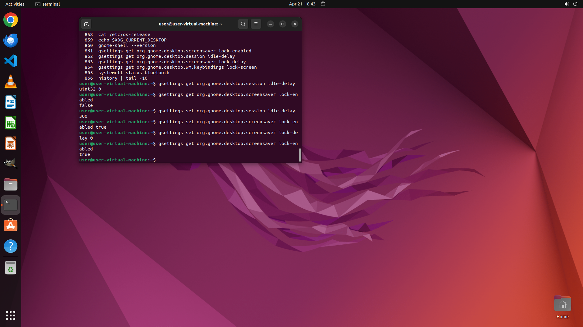 - 历史记录显示之前执行过一些 gsettings 查询命令来检查屏幕锁定相关设置