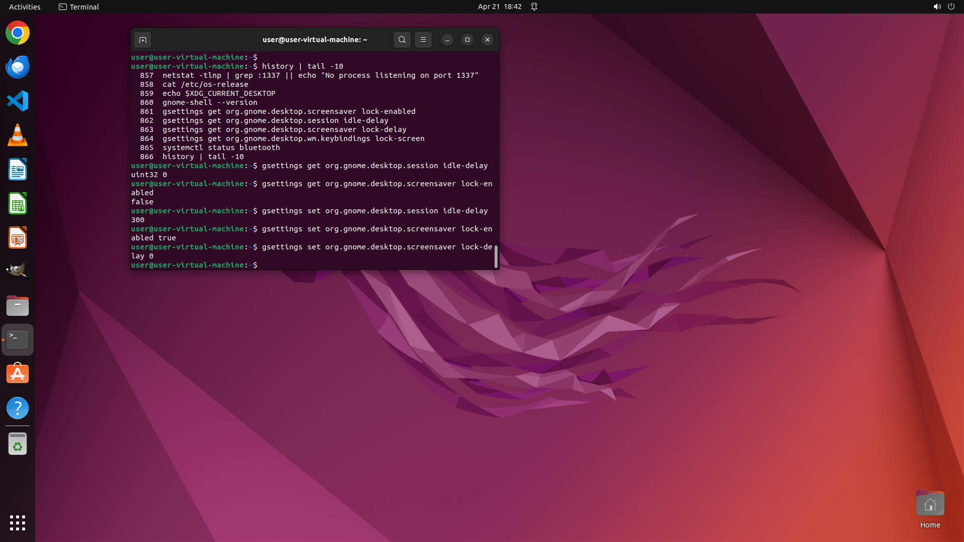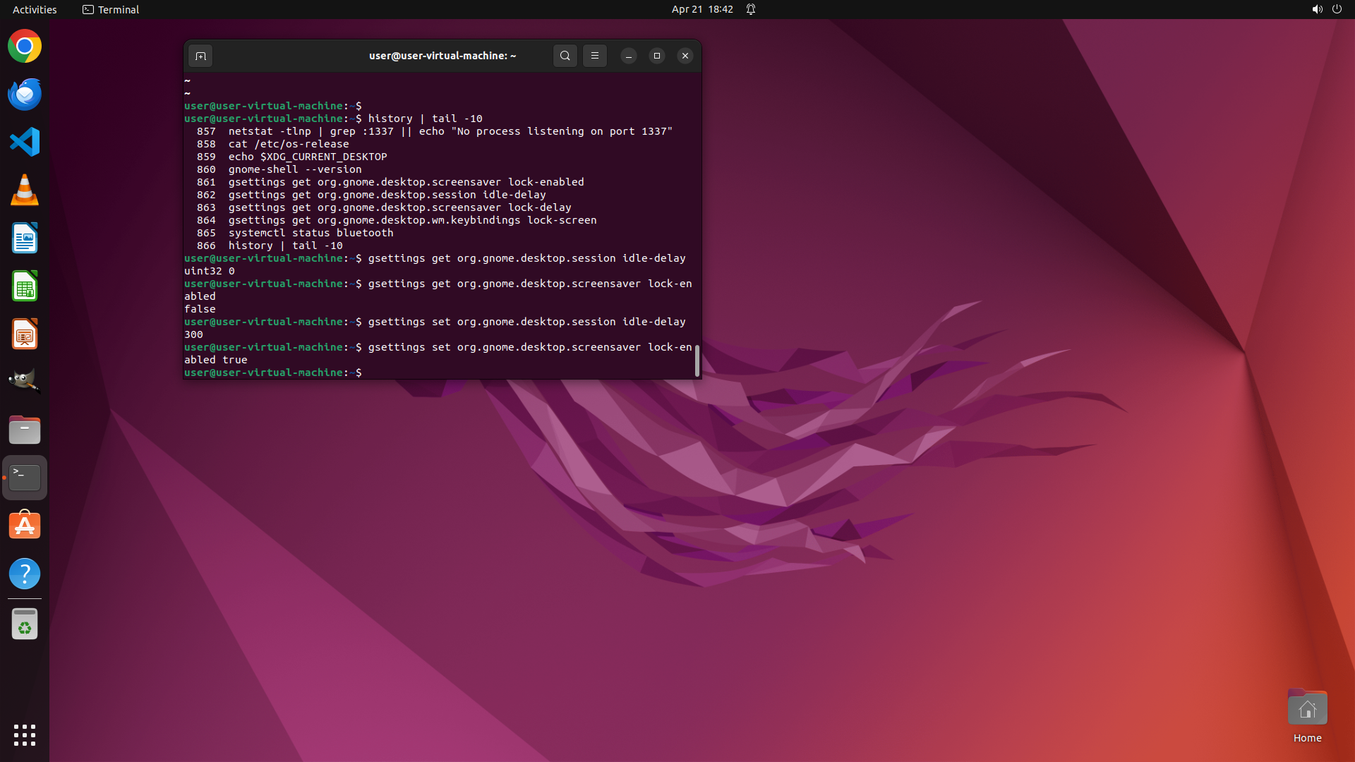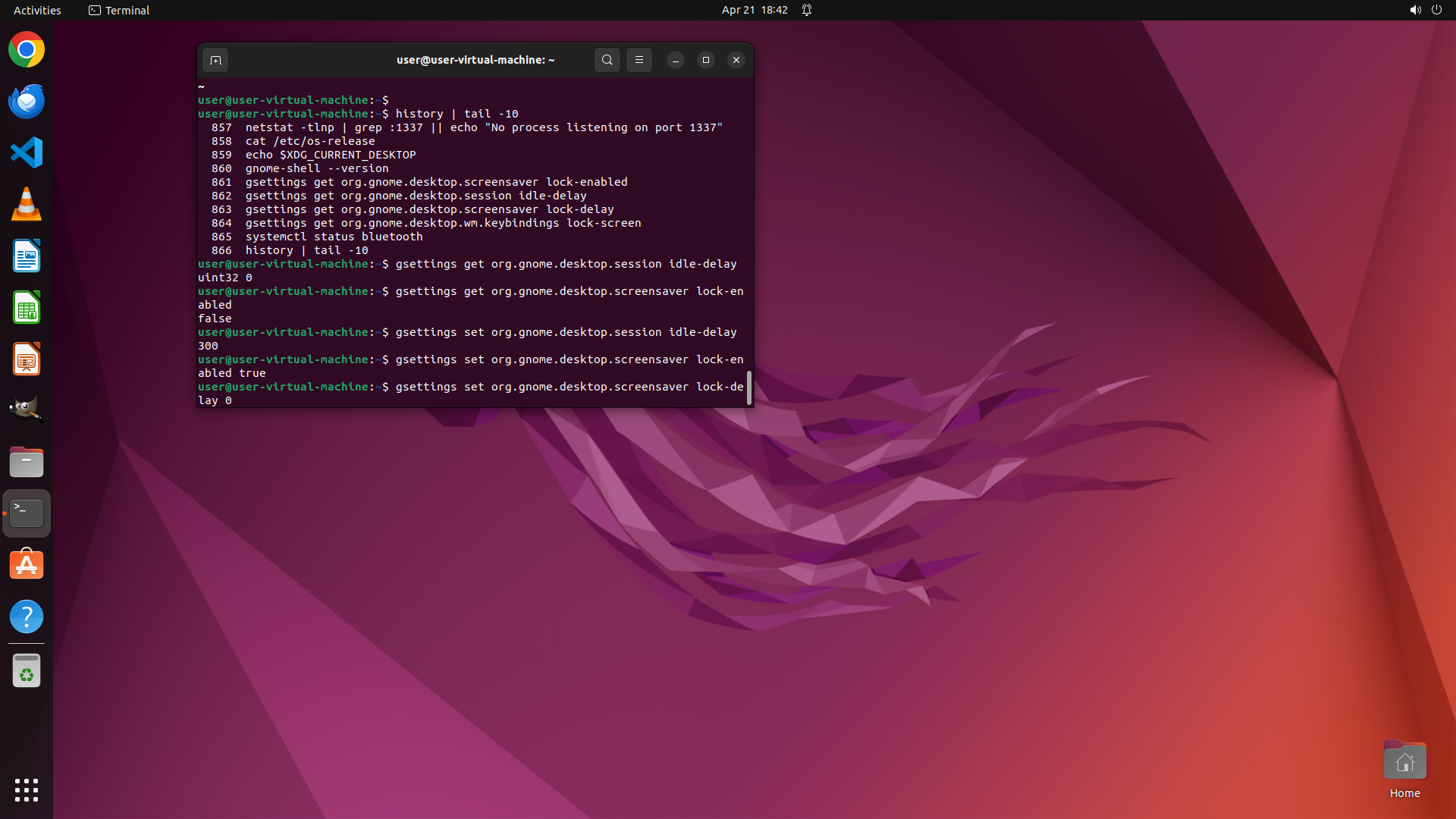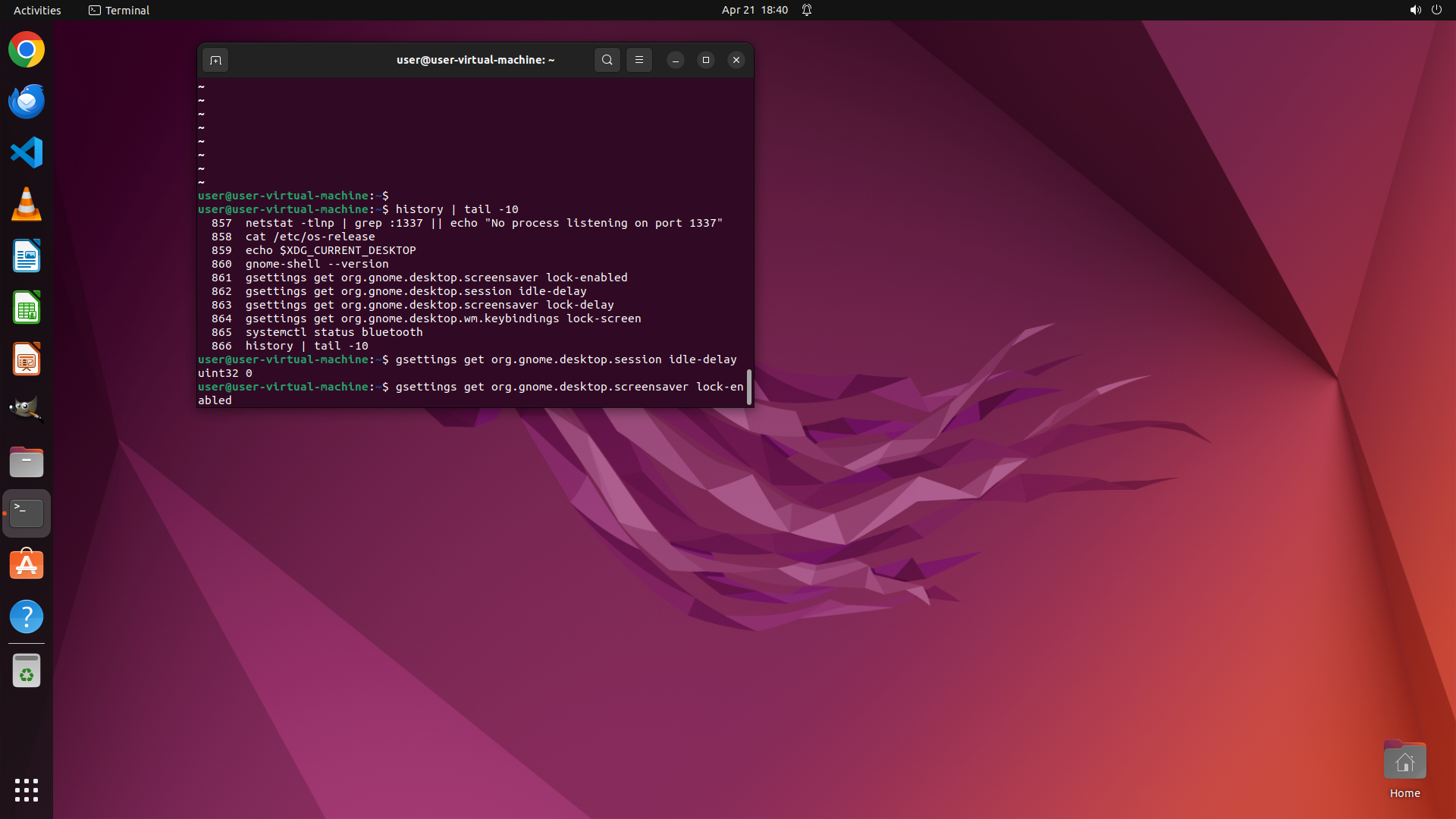 - 历史记录显示之前执行过一些 gsettings 查询命令来检查屏幕锁定相关设置