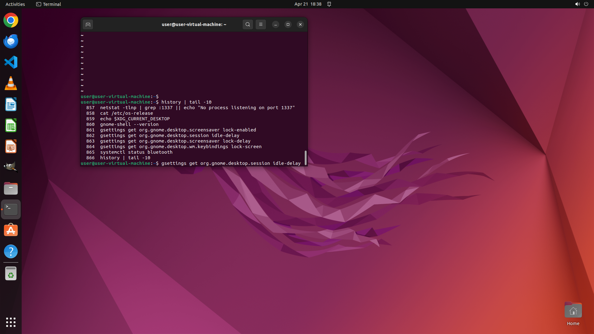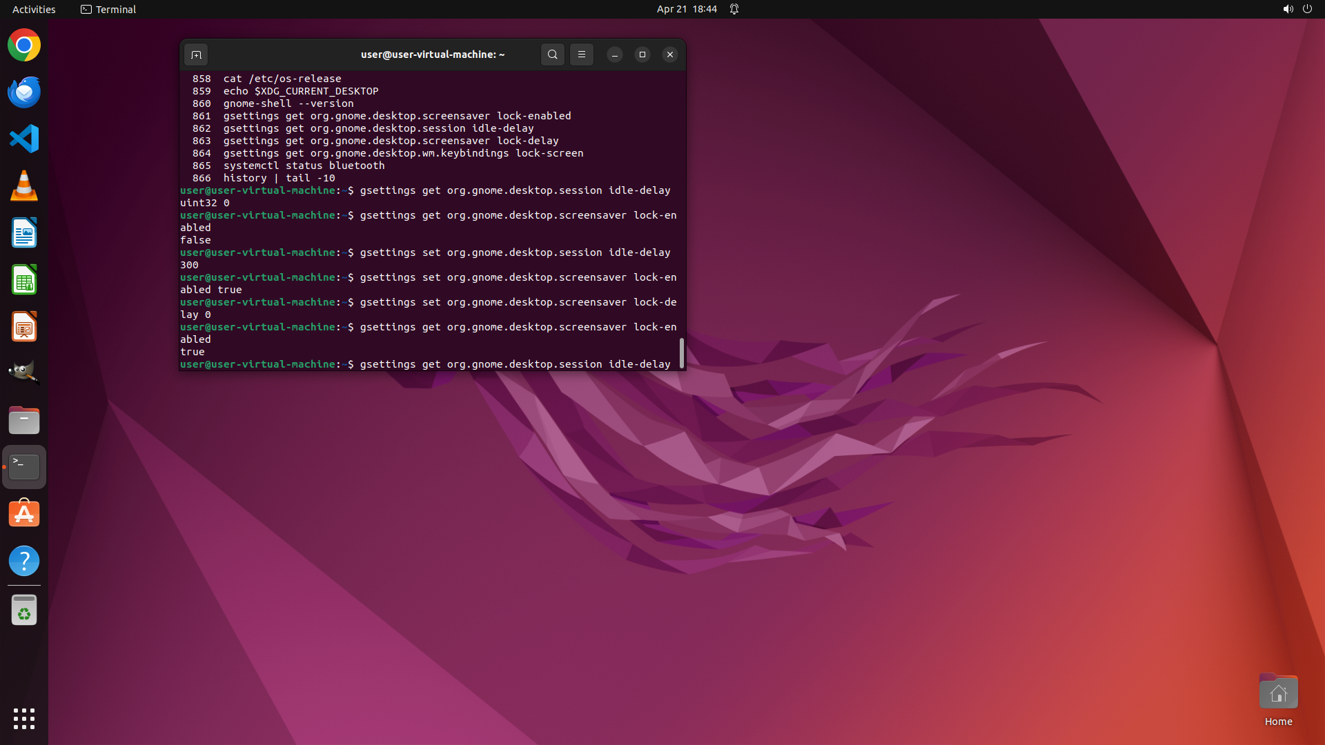 - 终端显示 `gsettings get org.gnome.desktop.session idle-delay` 命令已执行,返回值为 `uint32 0`