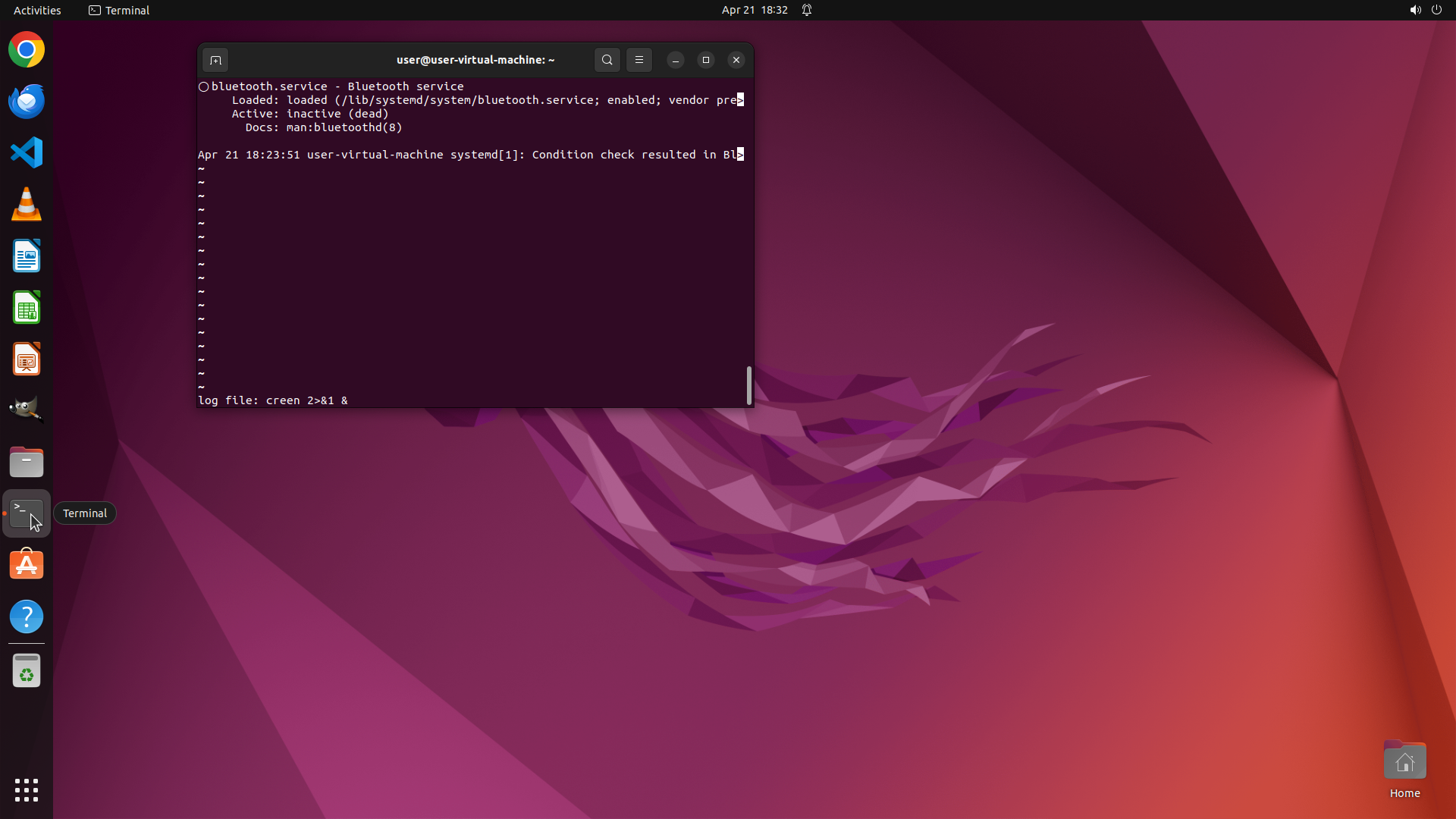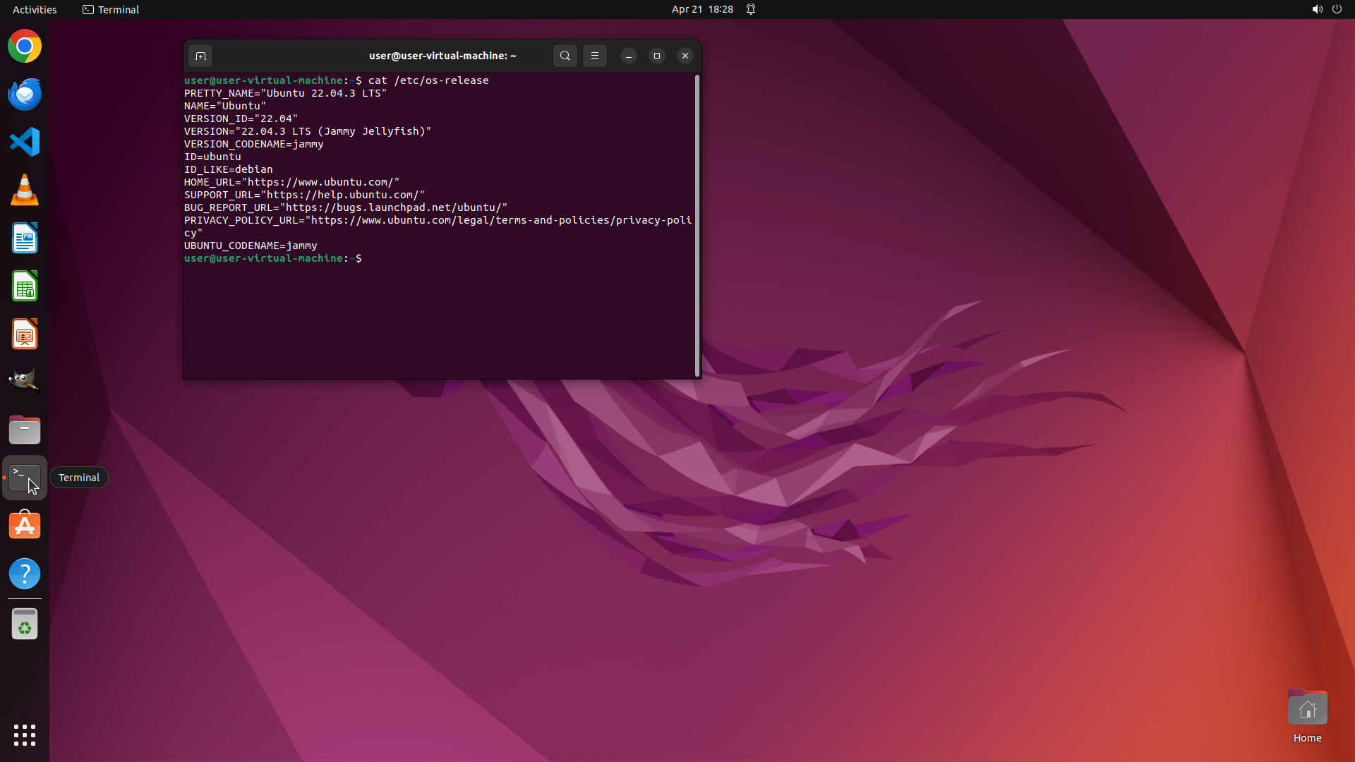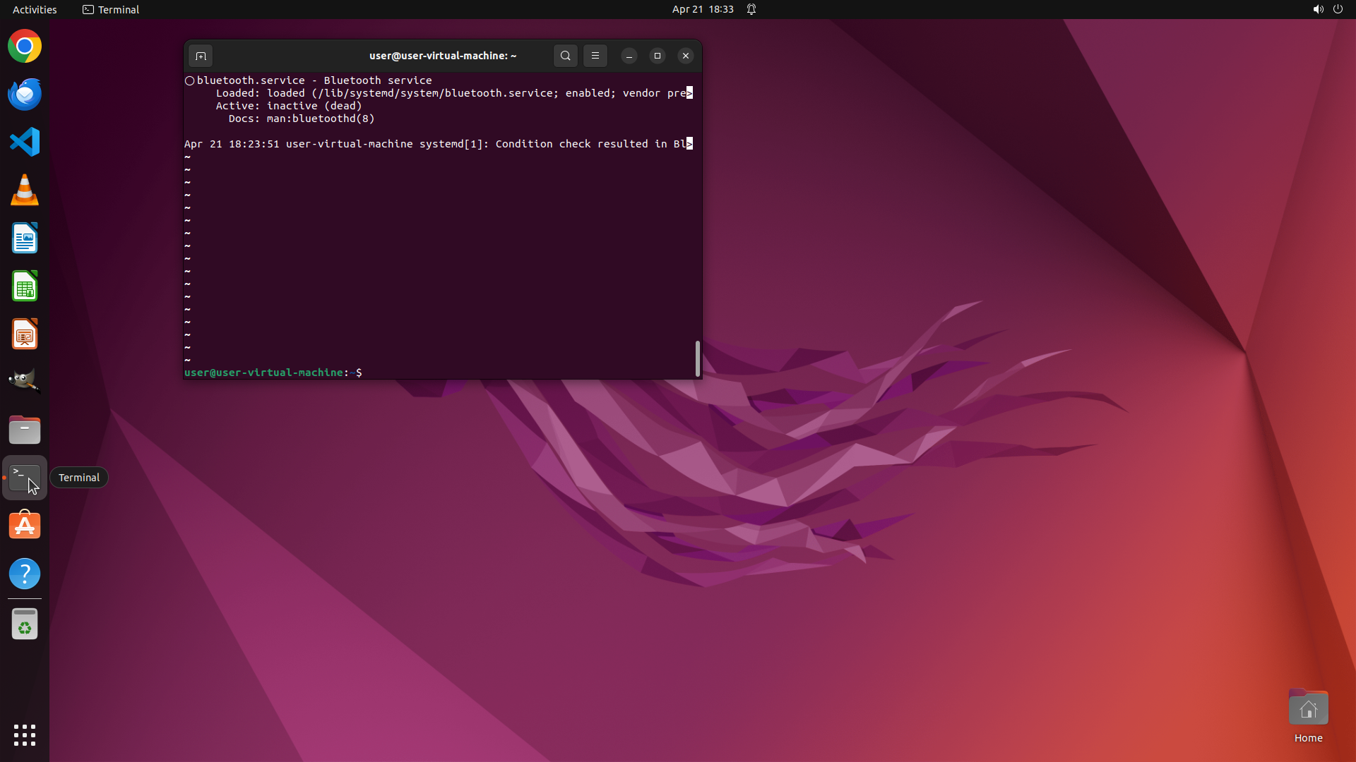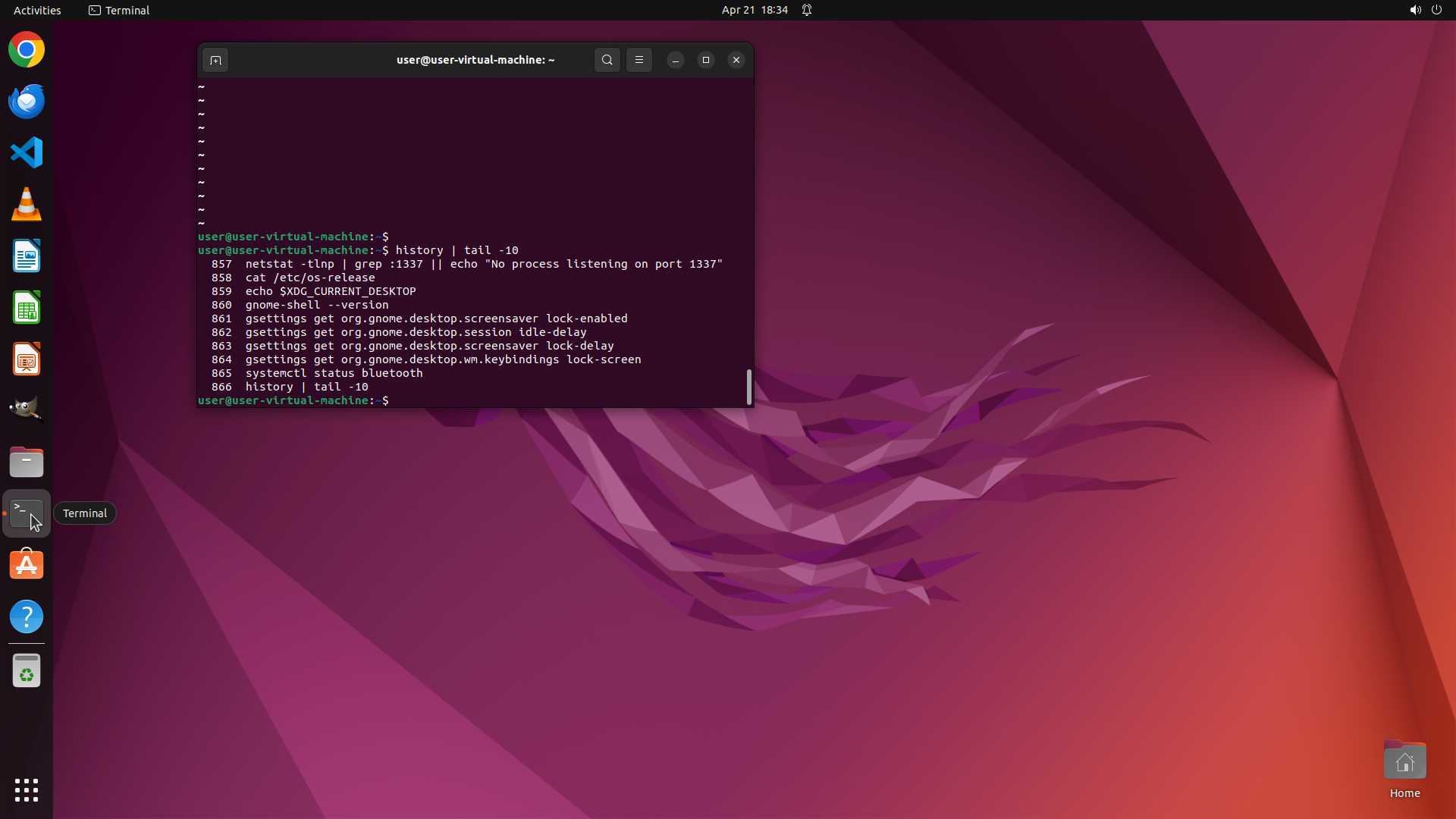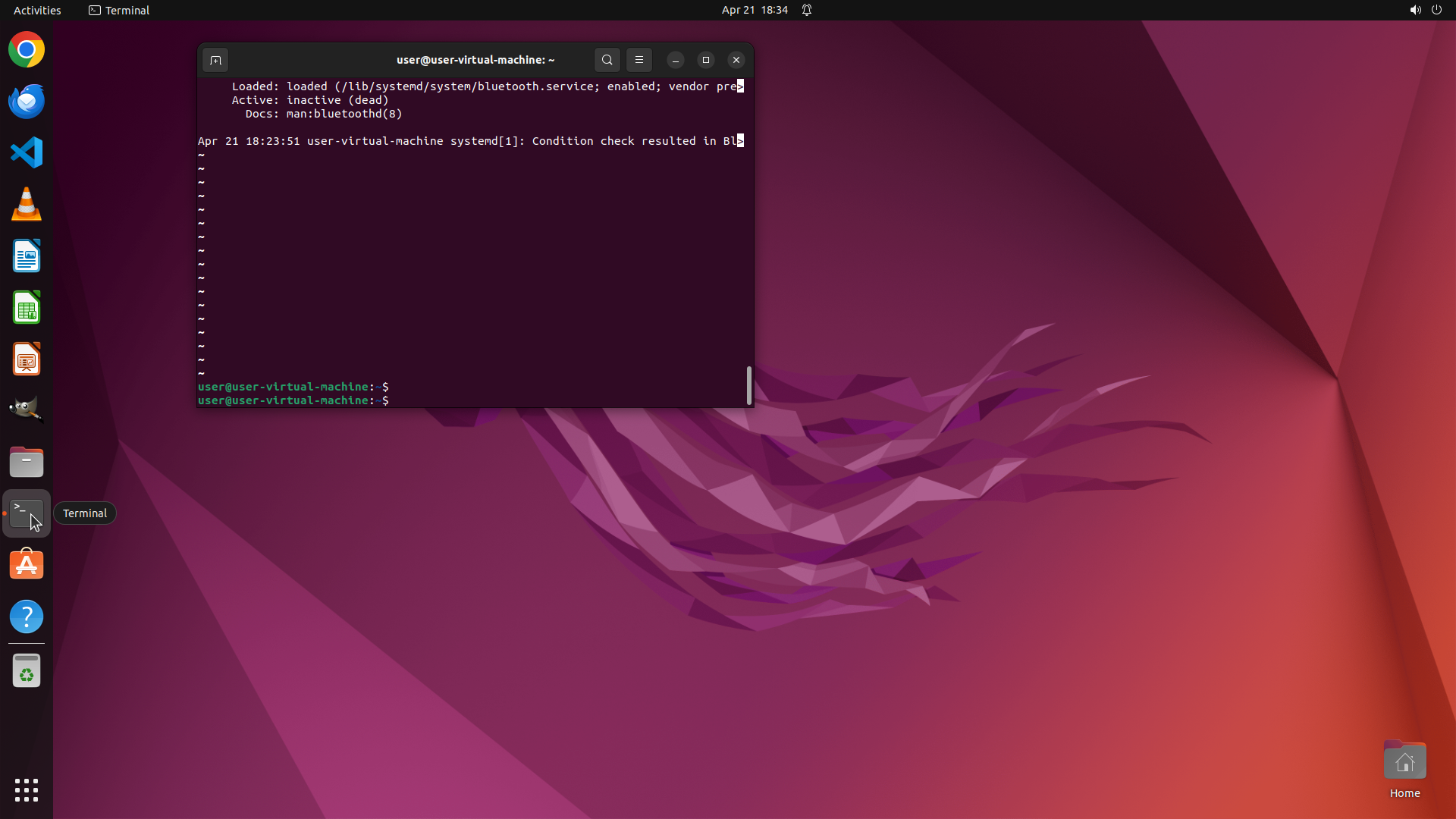 - The prompt shows "user@user-virtual-machine:~$"