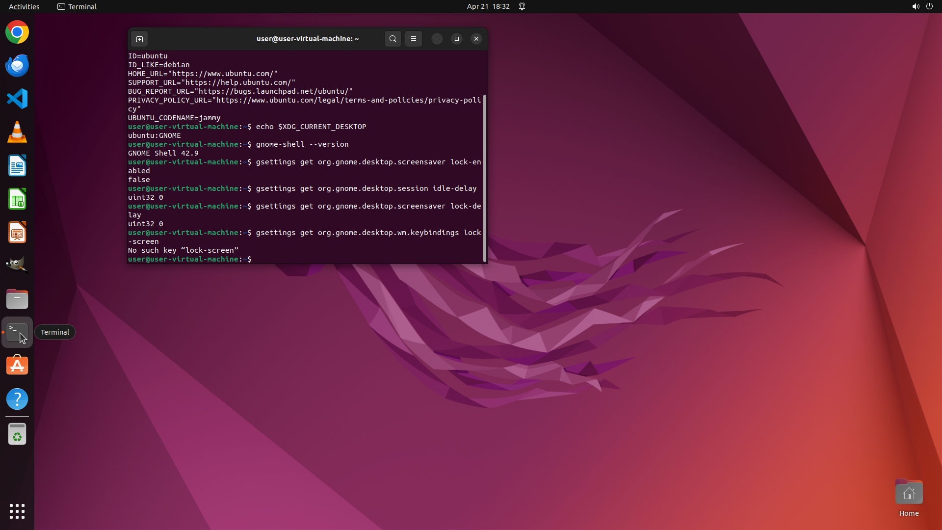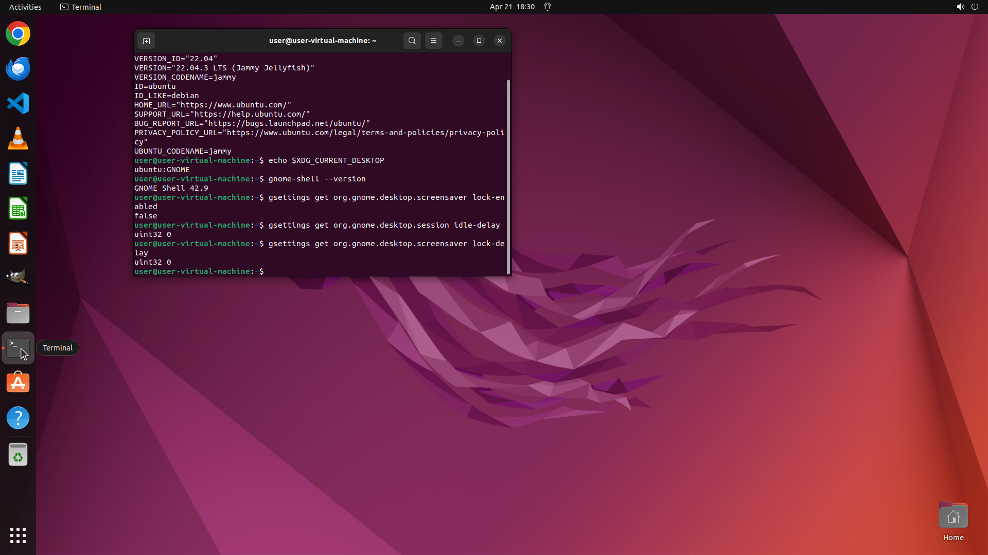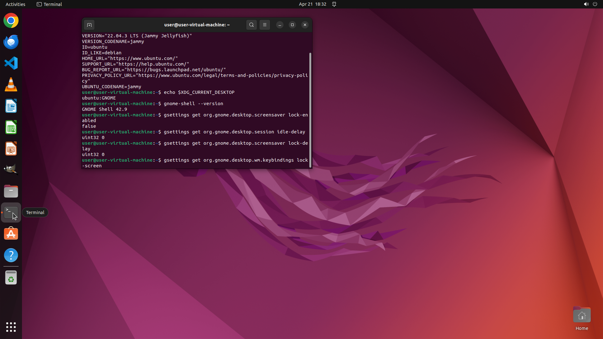 TYPING "gsettings get org.gnome.desktop.screensa…"