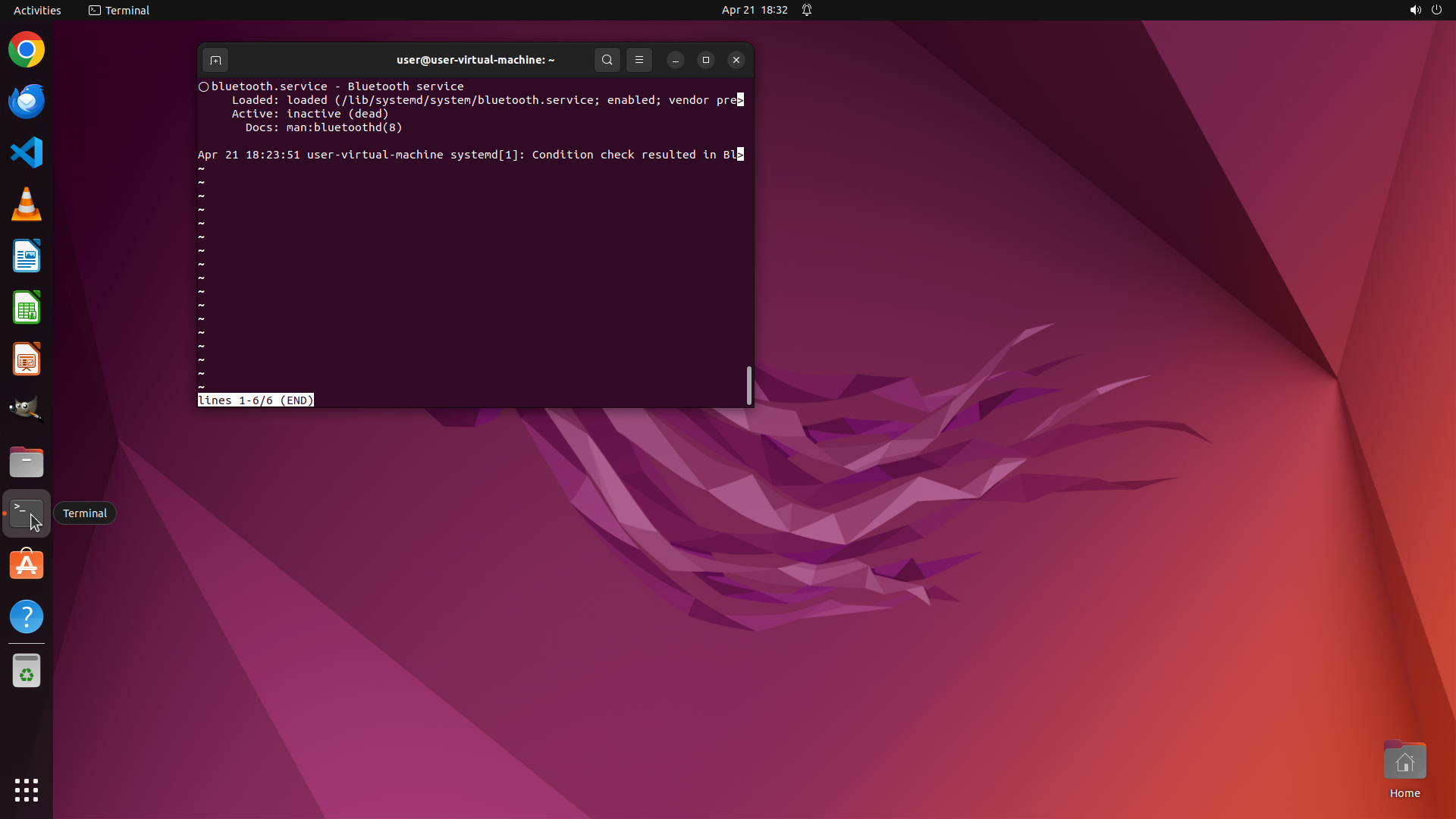 当前终端显示的是 `systemctl status bluetooth` 命令的输出,处于分页器(pager)模式,显示 "Lines 1-6/6 (END)"。从输出可以看到: