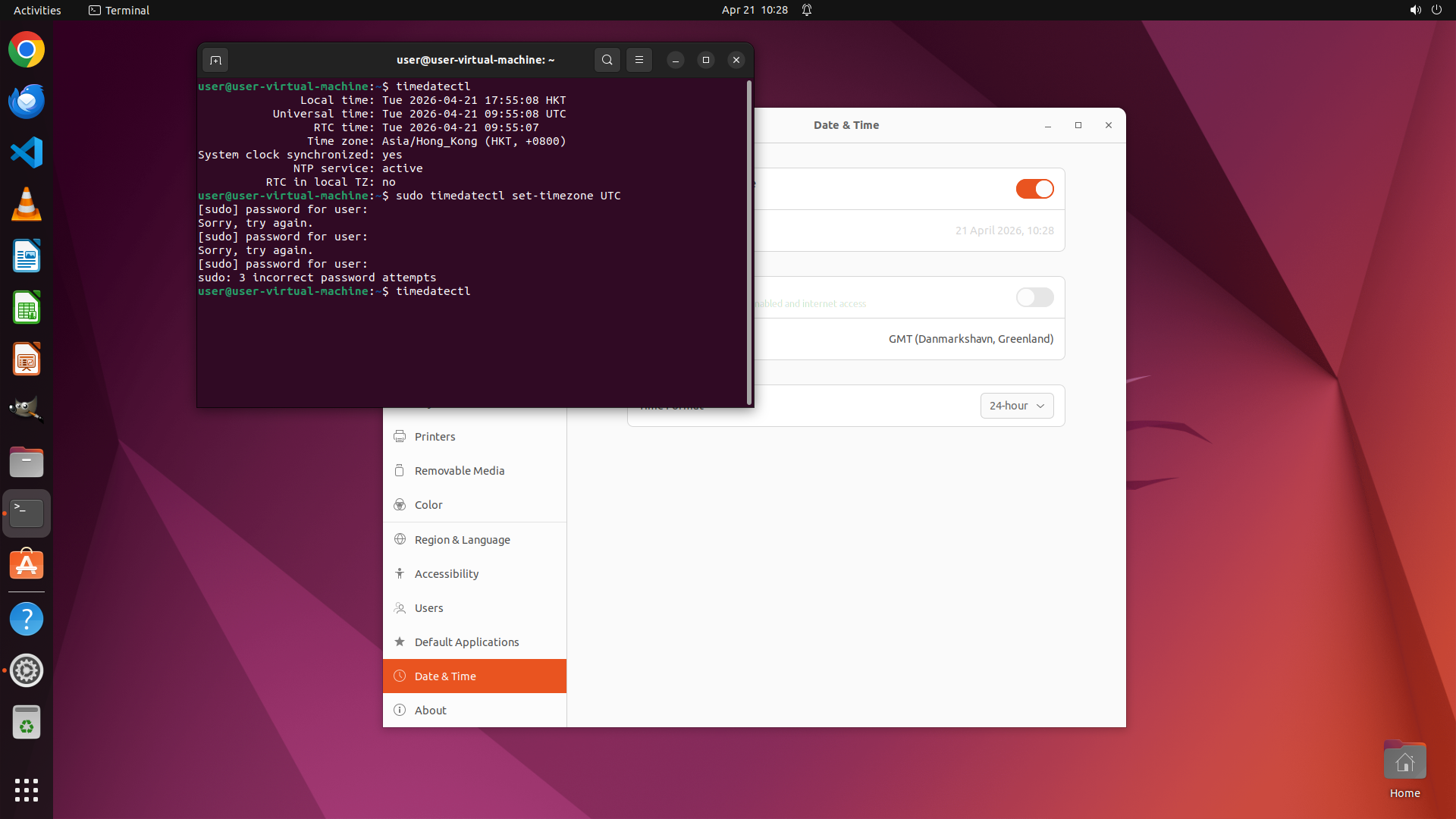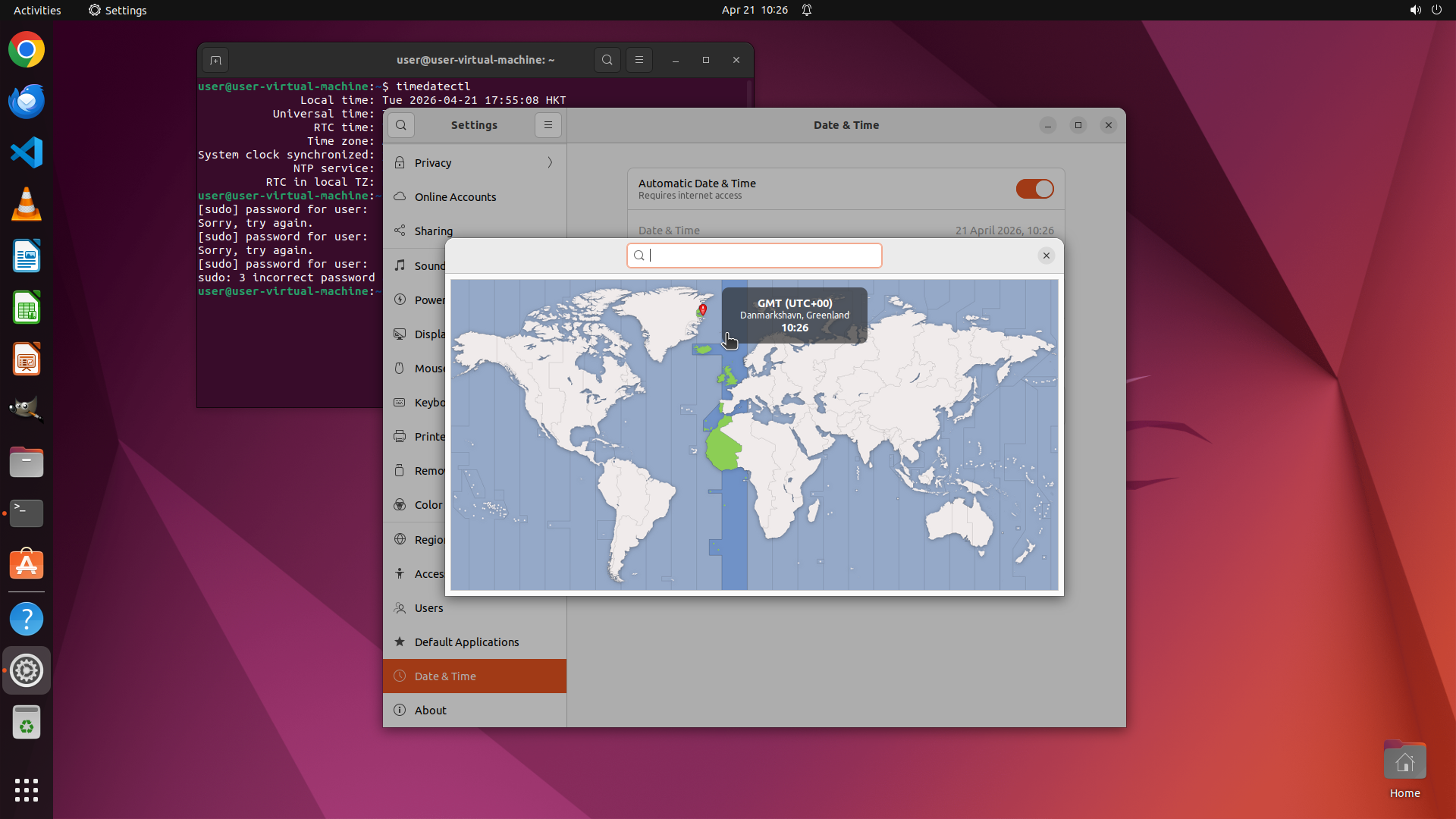 - Date & Time 设置窗口显示 "GMT (Danmarkshavn, Greenland)",与终端输出一致