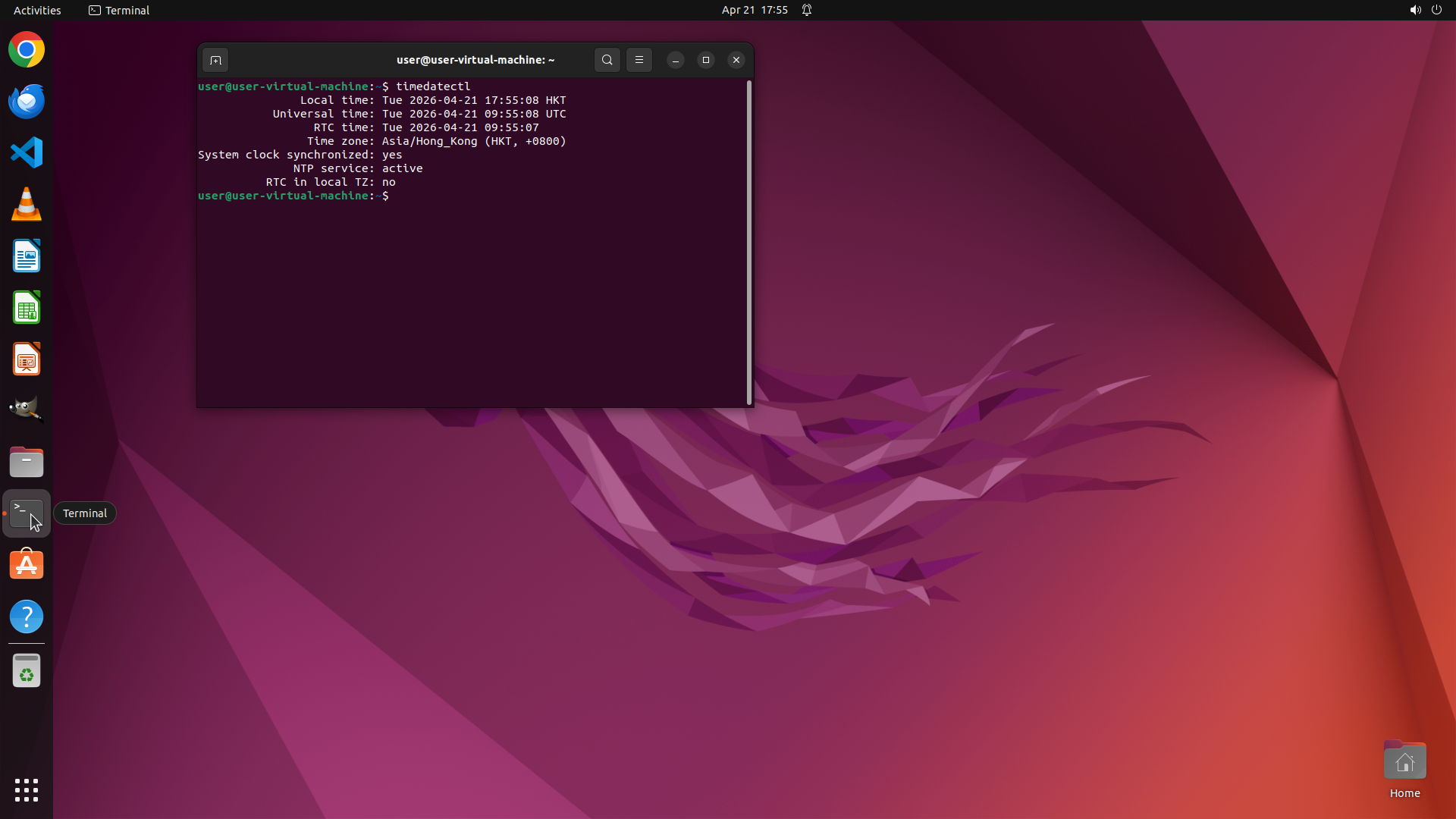 我将点击终端窗口并运行 timedatectl 命令来验证时区更改。