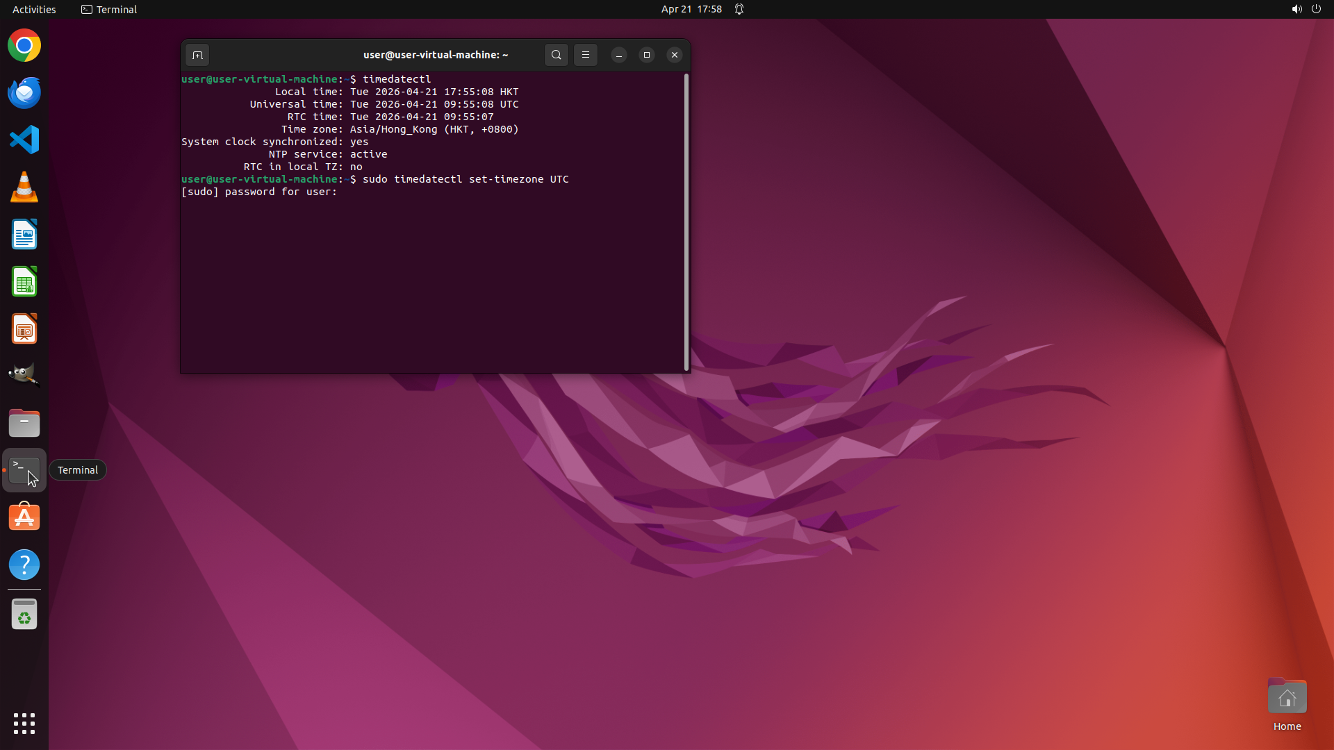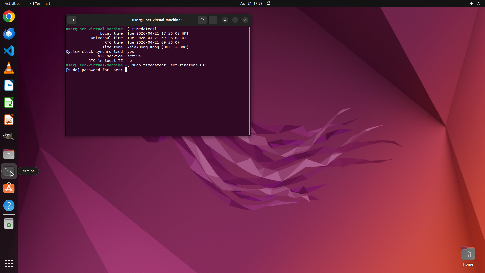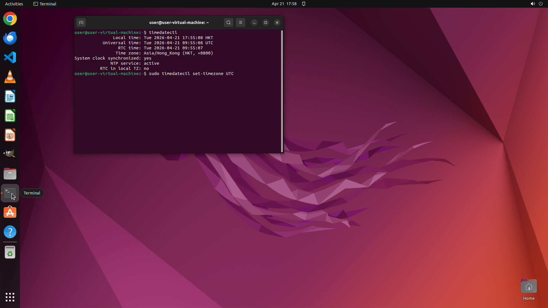 - 终端显示 `sudo timedatectl set-timezone UTC` 命令已执行