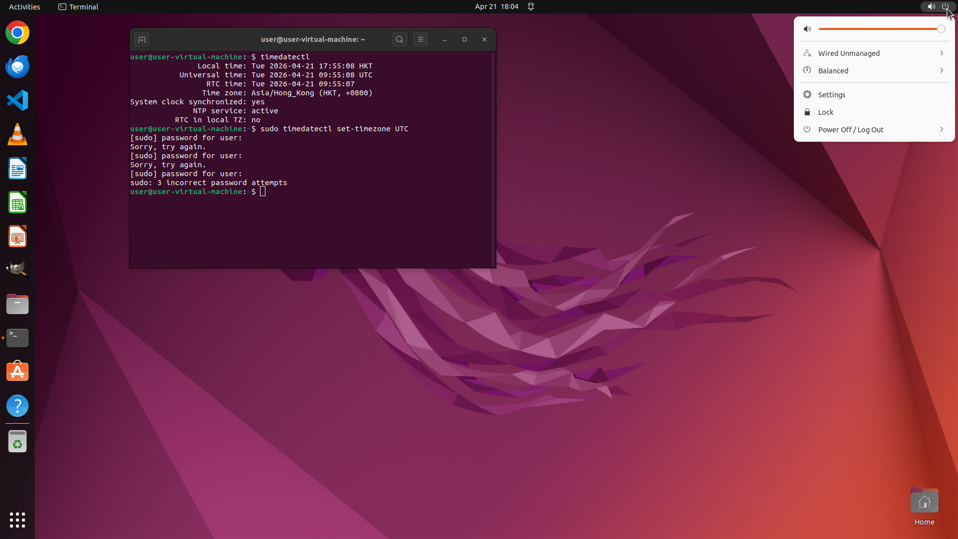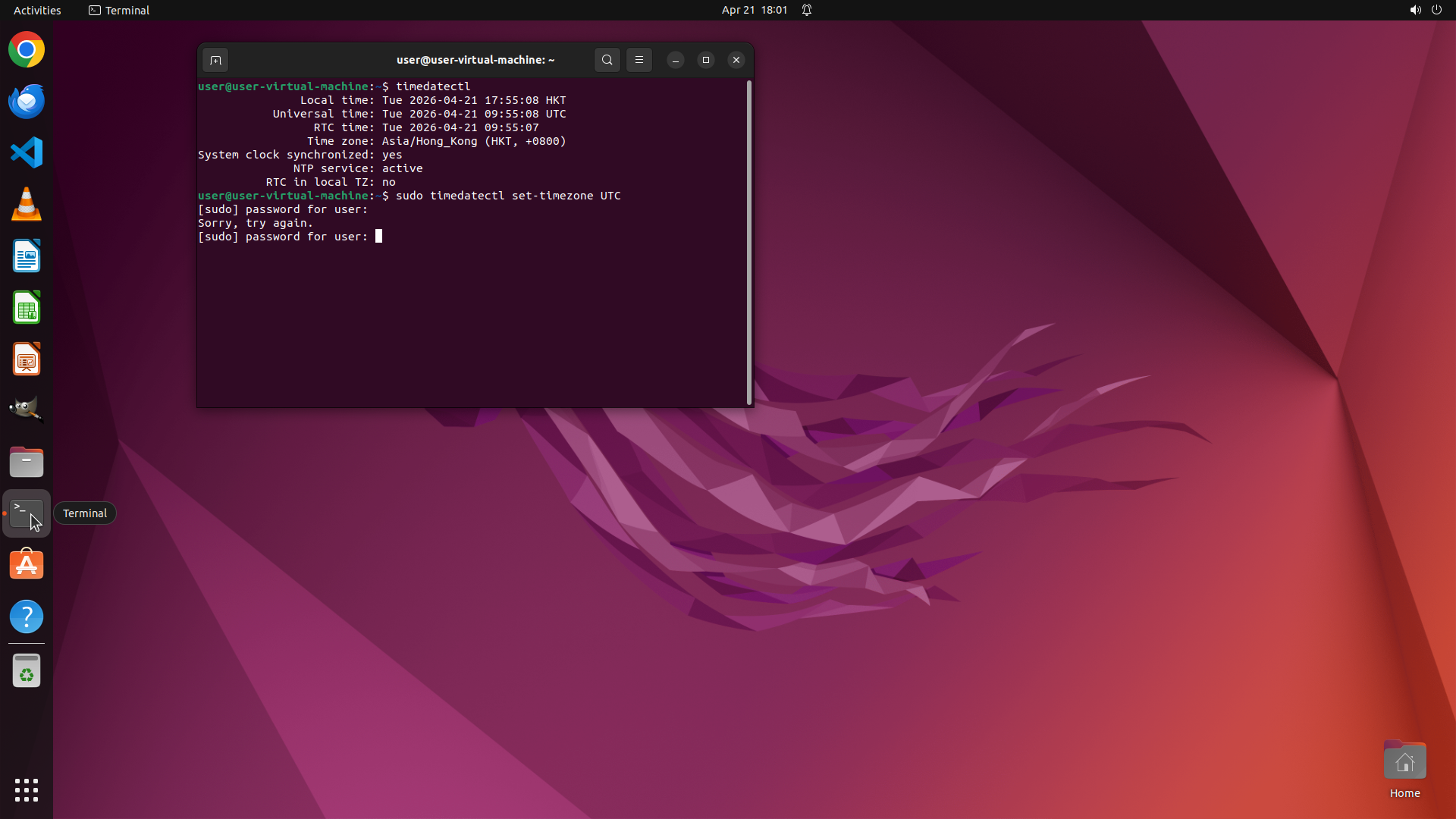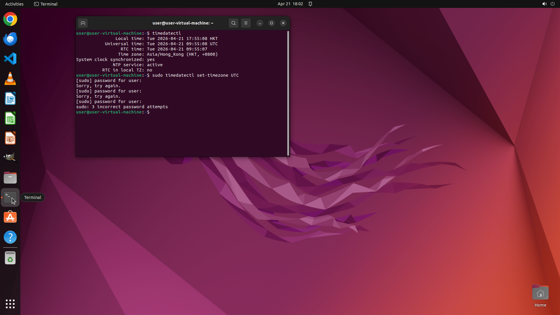 - 终端显示 `sudo timedatectl set-timezone UTC` 命令已执行