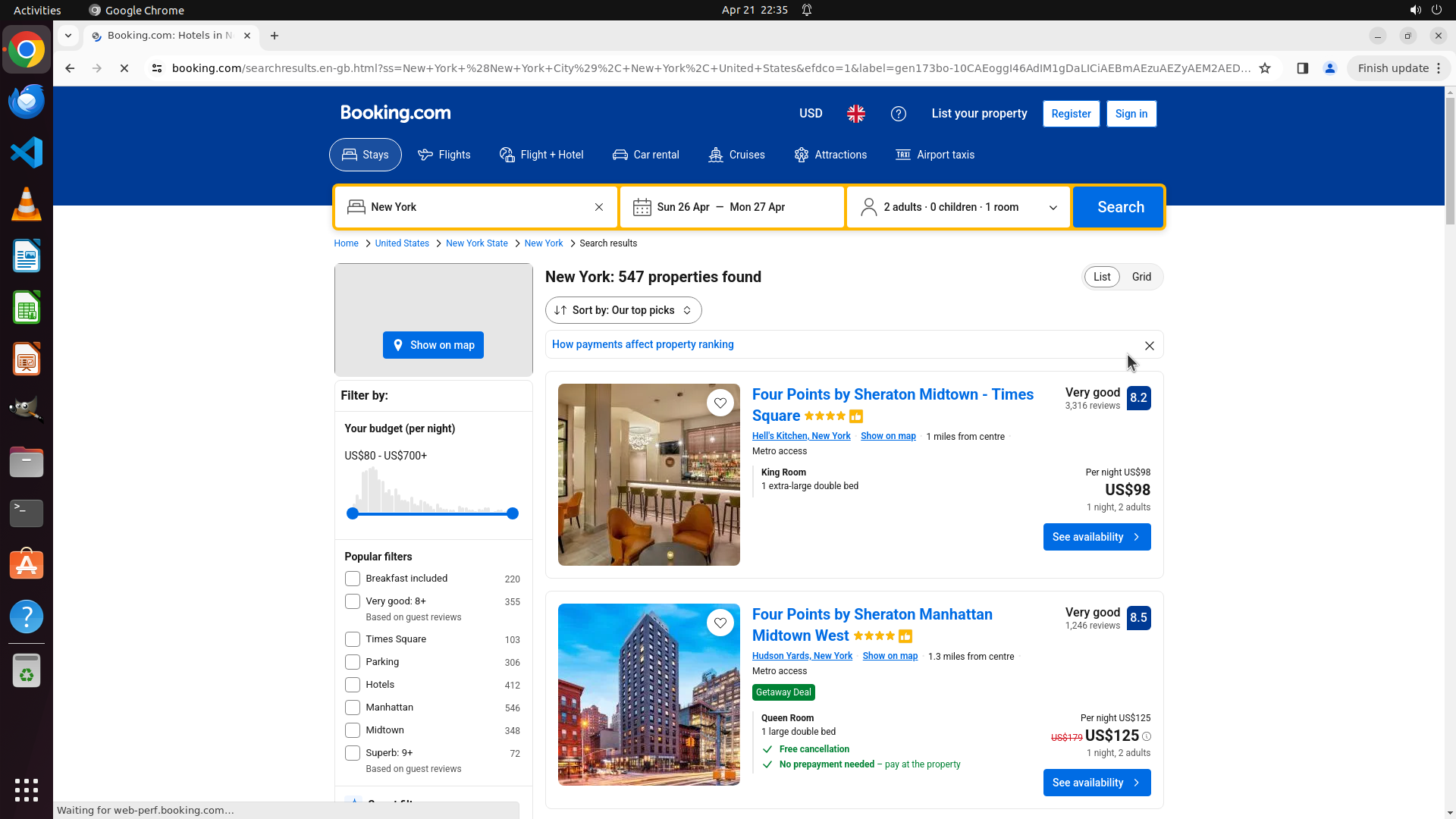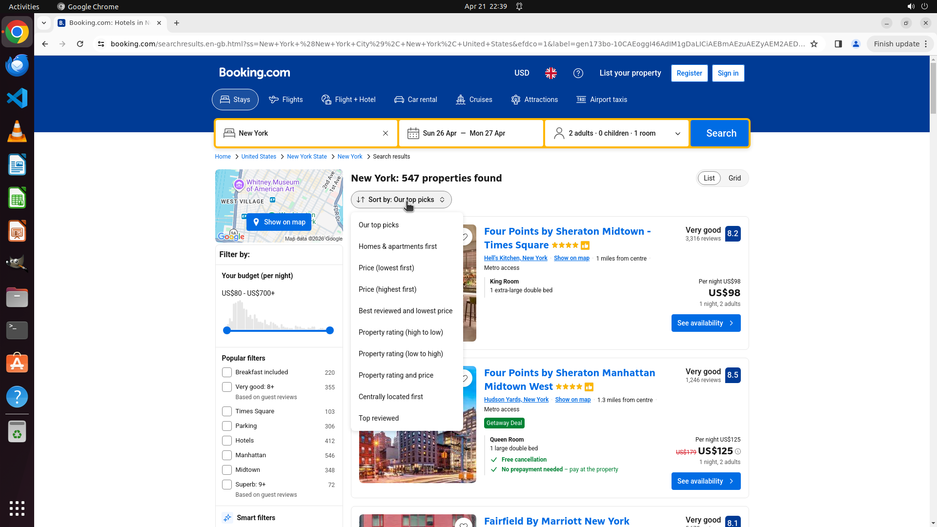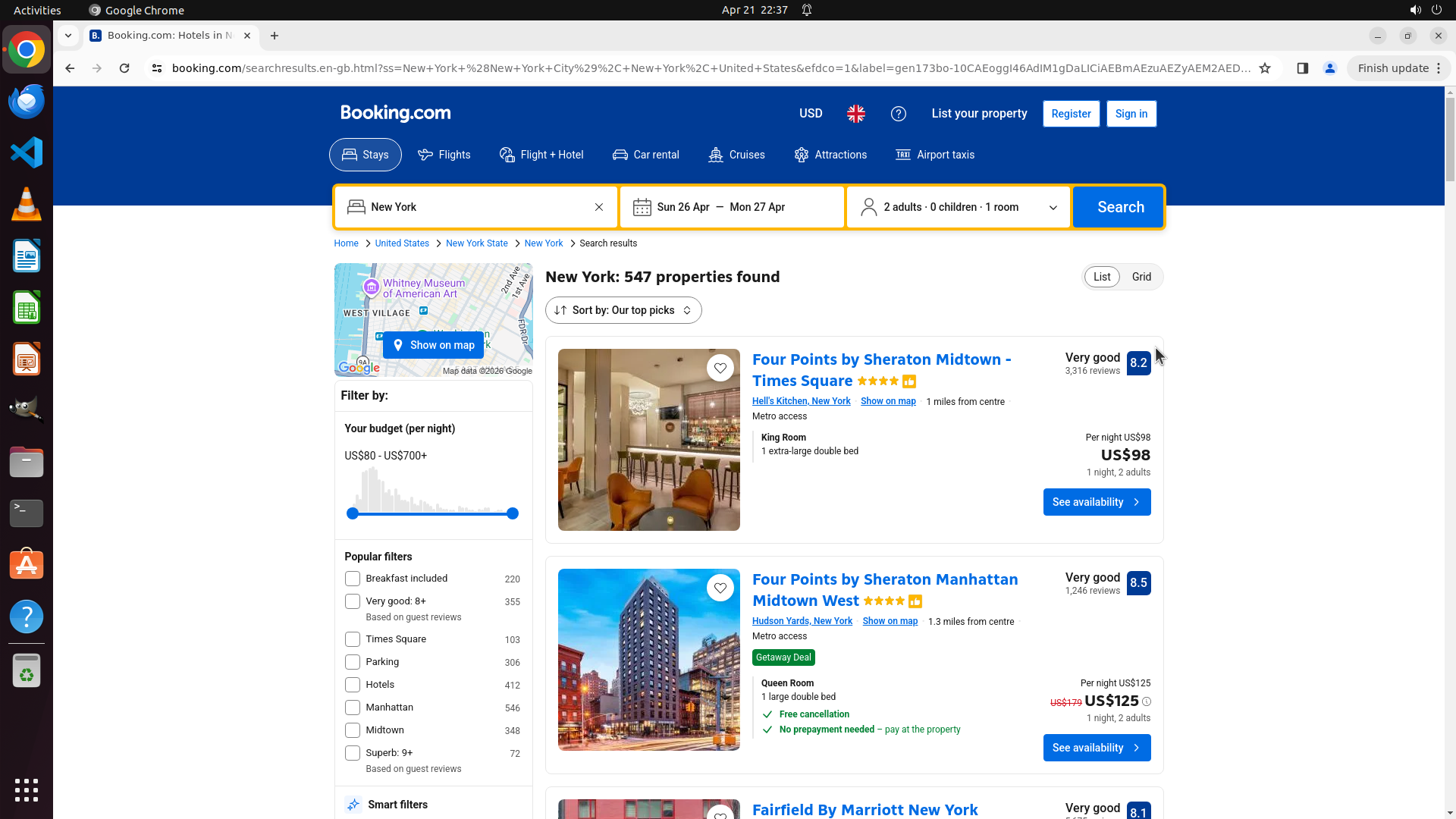 - 搜索参数正确:纽约市、4月26-27日(下周末)、2位成人