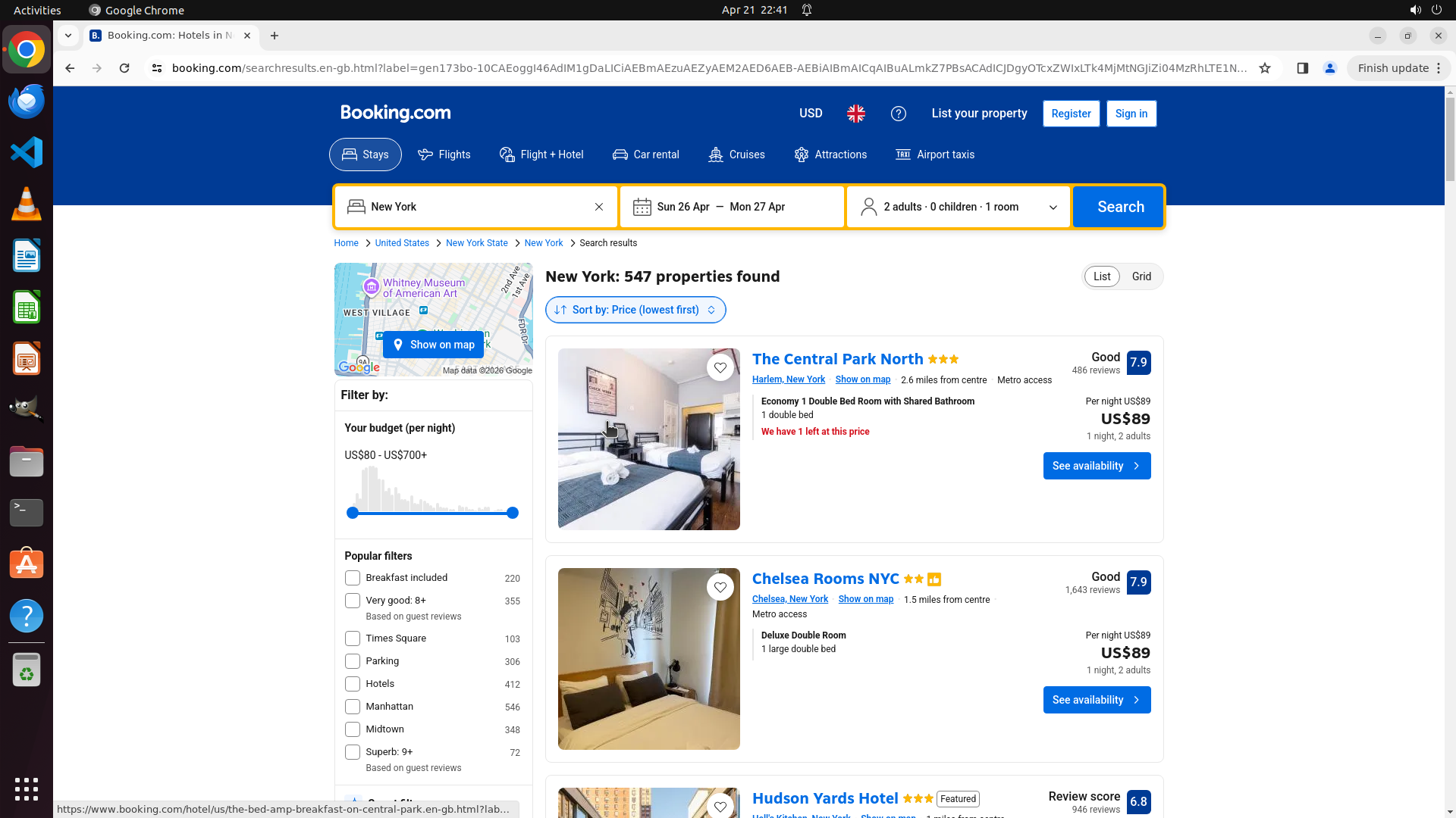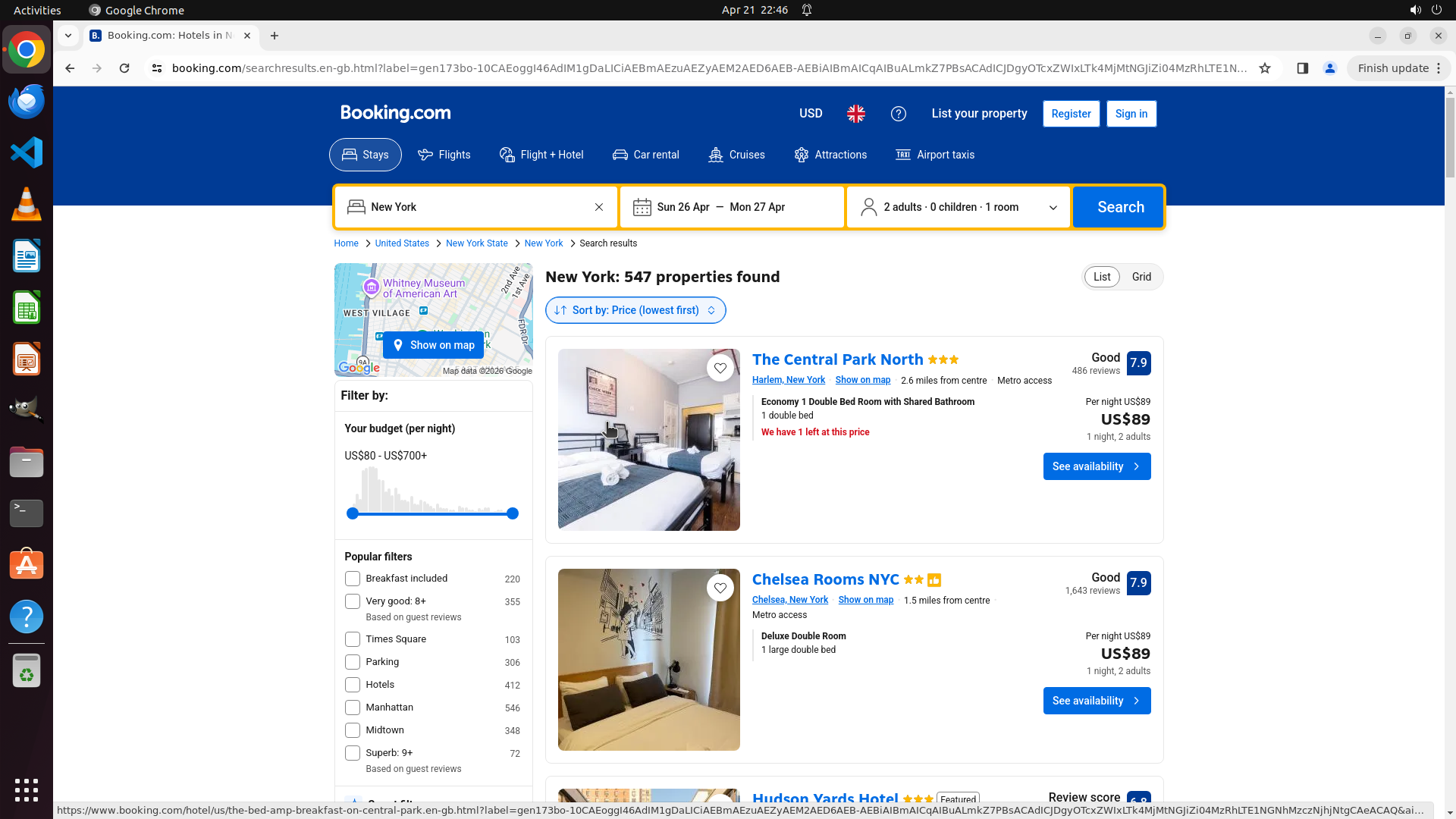 - 第二个酒店:Chelsea Rooms NYC,价格 US$89/晚