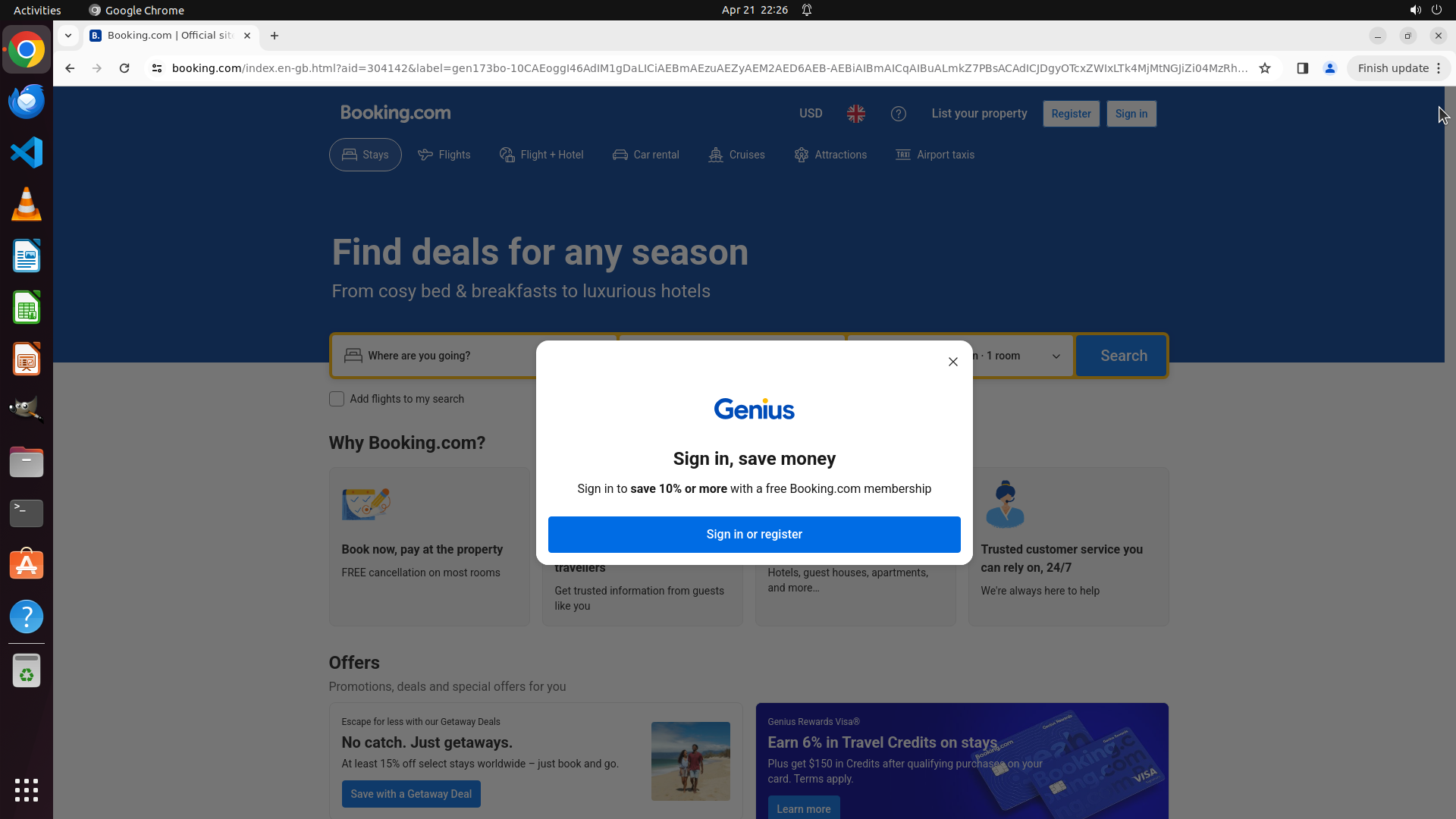 - 页面中央有一个"Genius"会员注册弹窗,提示"Sign in, save money"
