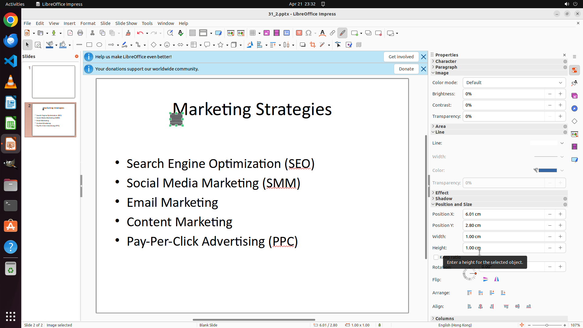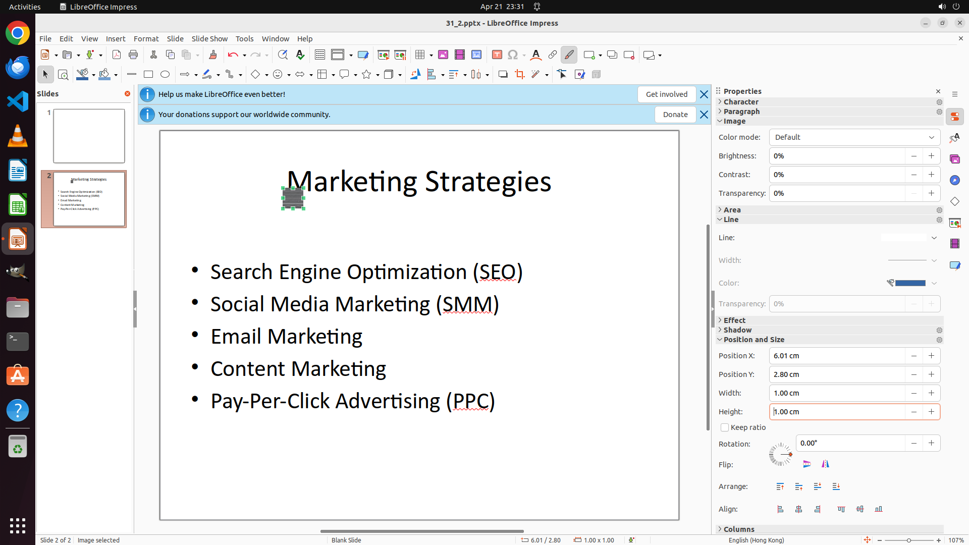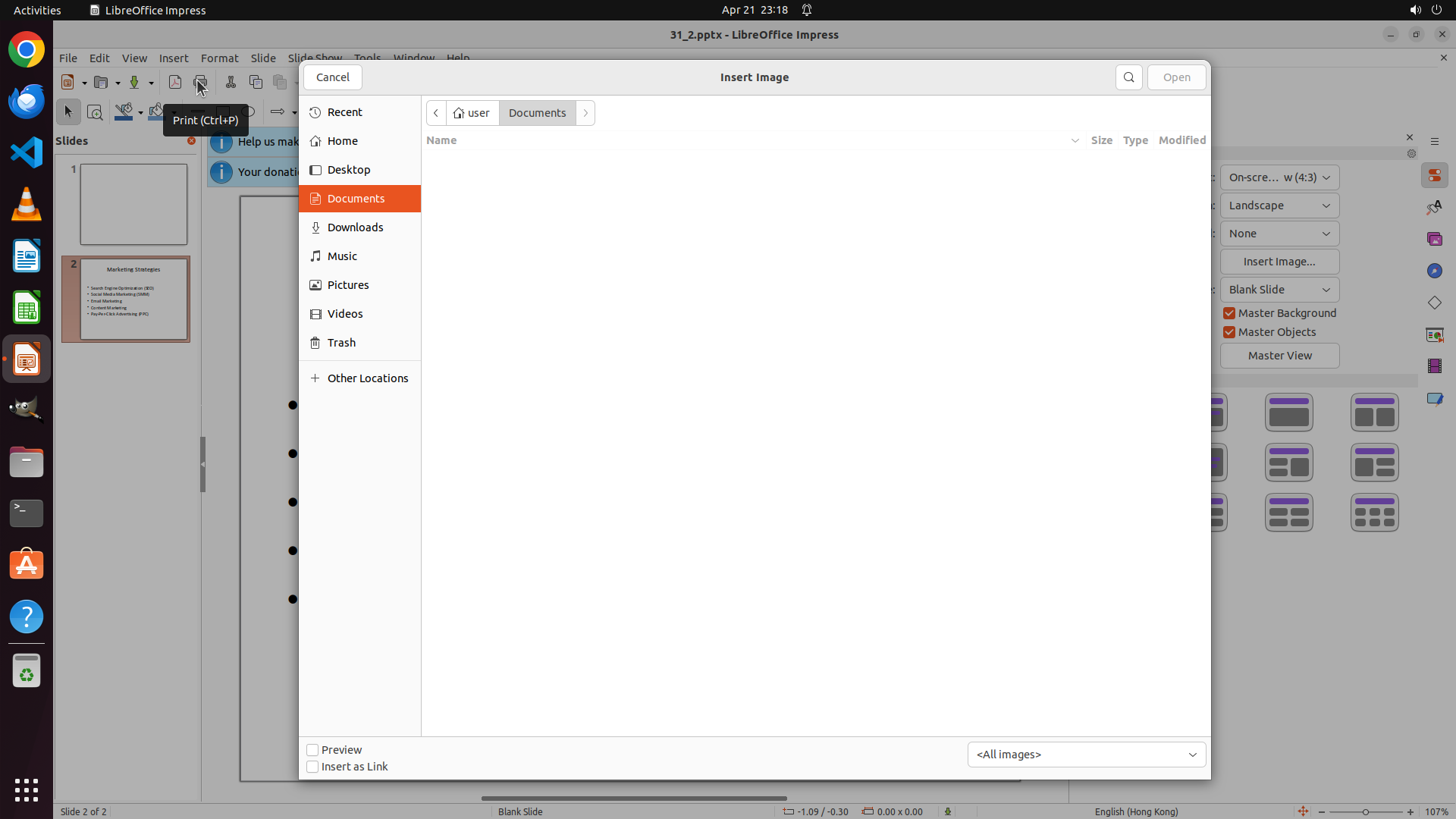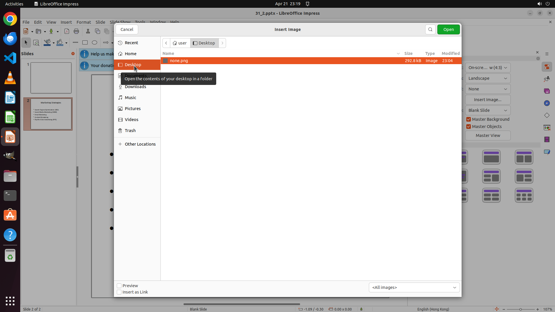任务目标:在 LibreOffice Impress 的 slide 2 中添加 Desktop 上的 none.png 图片,并调整大小为 1cm x 1cm。