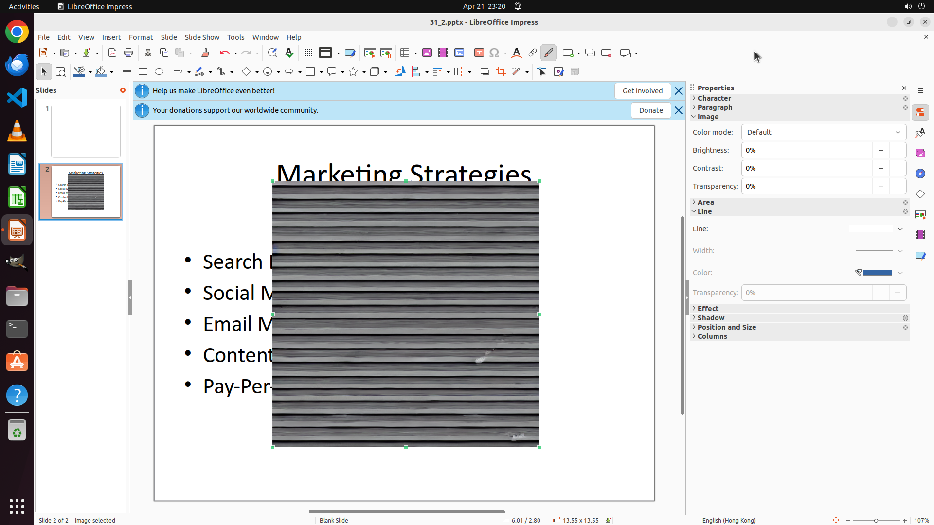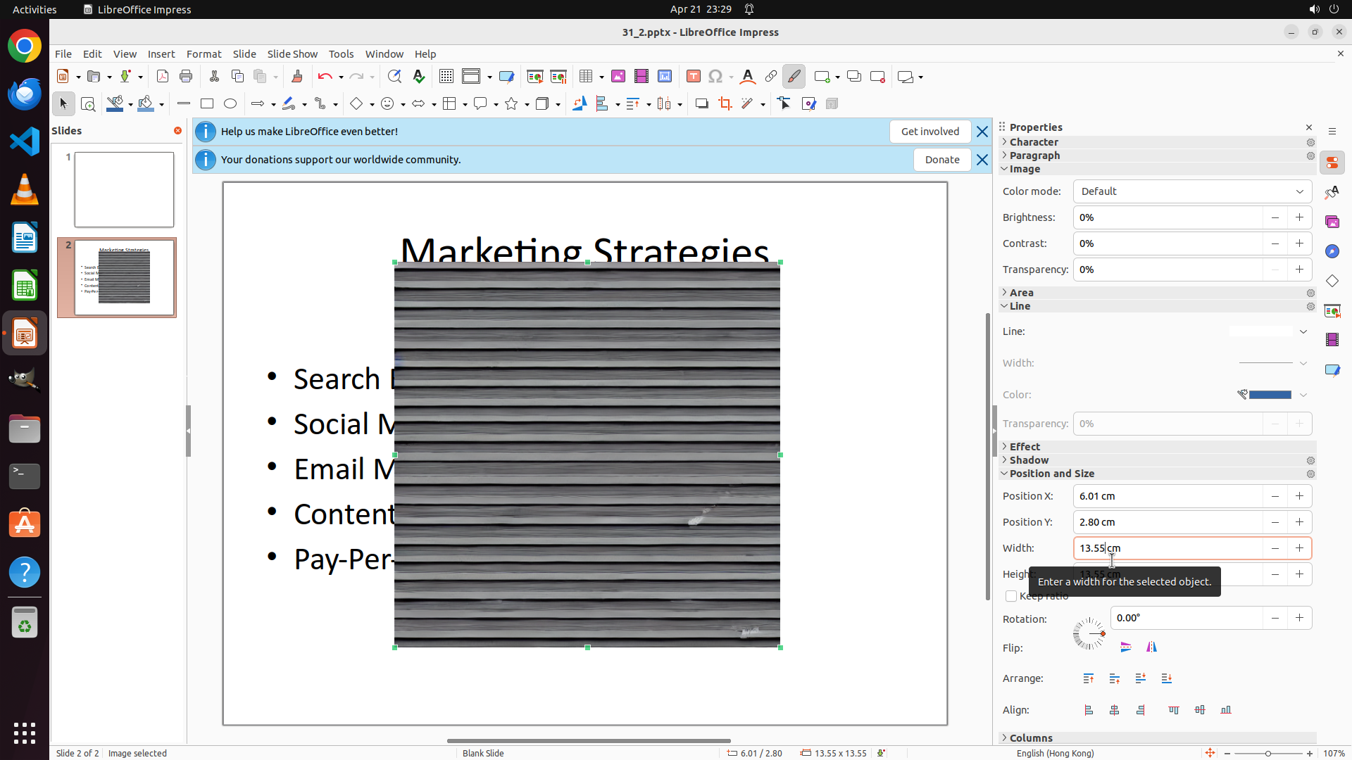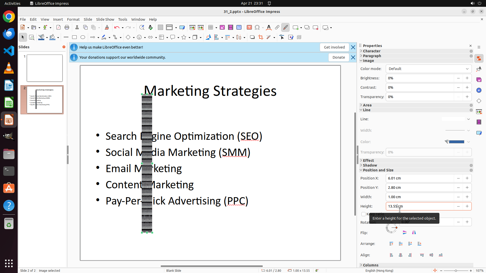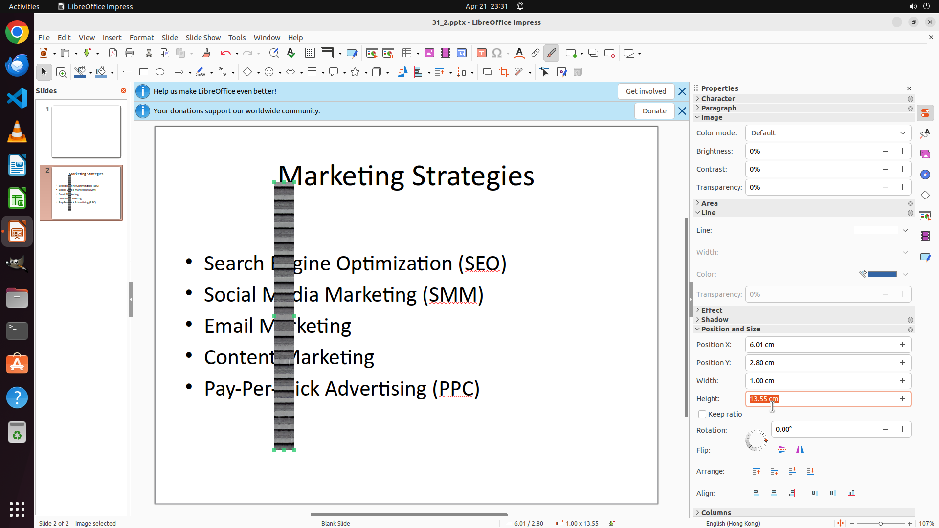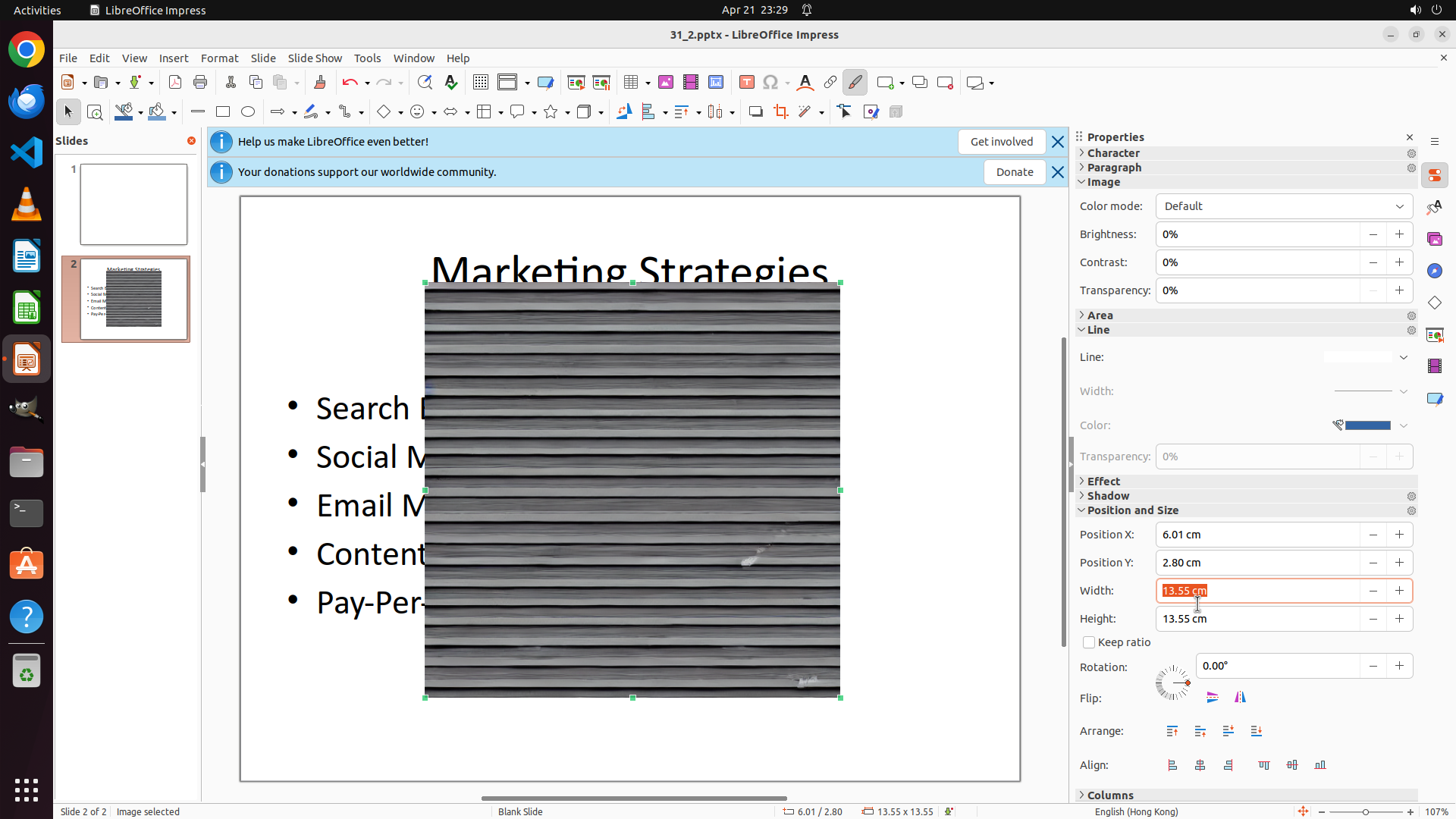 任务目标:在 LibreOffice Impress 的 slide 2 中添加 Desktop 上的 none.png 图片,并调整大小为 1cm x 1cm。