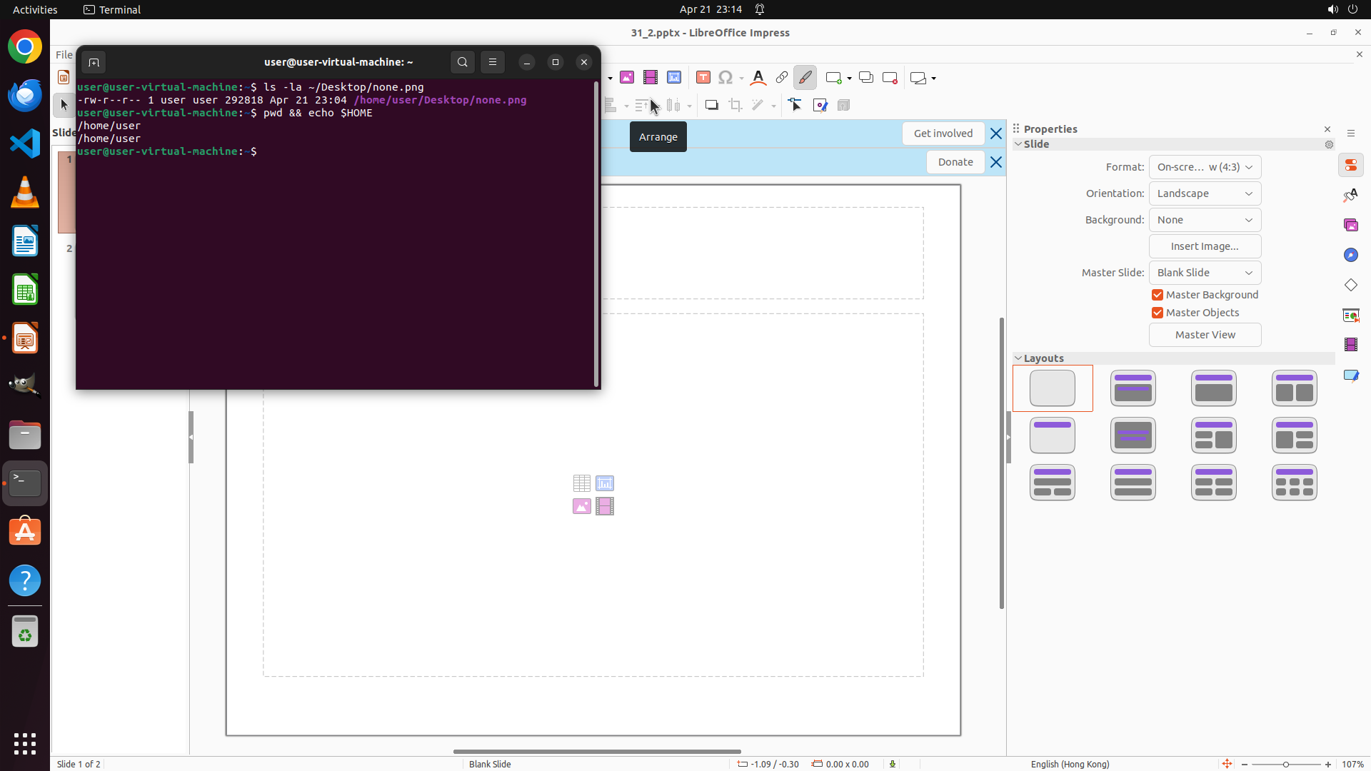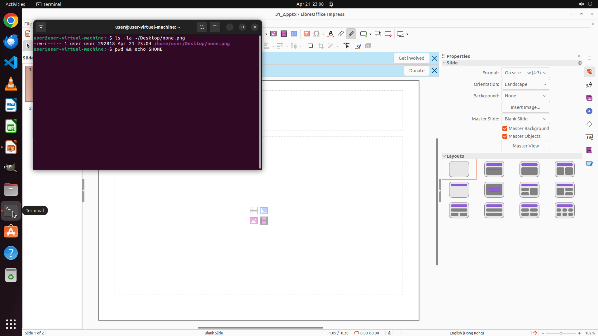 终端已成功打开,显示命令提示符 `user@user-virtual-machine:~$`,说明当前工作目录是用户主目录(~)。终端窗口位于屏幕左侧,LibreOffice Impress 在右侧背景中仍然打开。