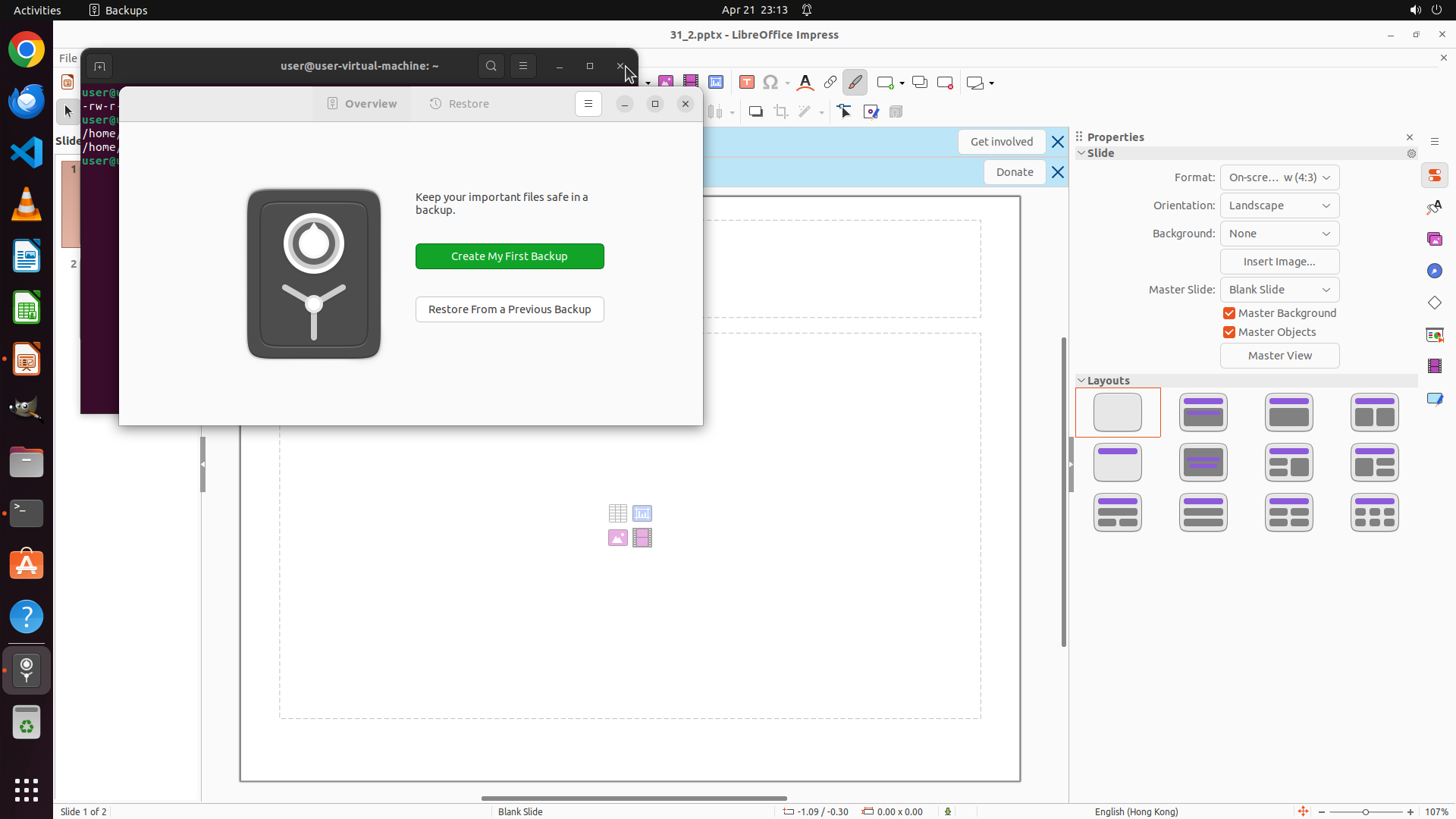 上次的点击可能关闭了 Backups 对话框,但终端窗口仍然在前景。我需要先关闭终端窗口才能操作 LibreOffice Impress。