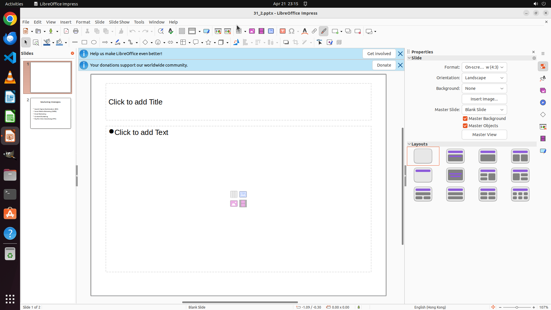 当前屏幕显示 LibreOffice Impress 已打开,正在编辑一个名为 "31_2.pptx" 的演示文稿。当前显示的是第 1 张幻灯片(共 2 张),左侧幻灯片缩略图面板显示了 2 张幻灯片。右侧属性面板显示了幻灯片格式设置(On-screen Show 4:3, Landscape 方向)。