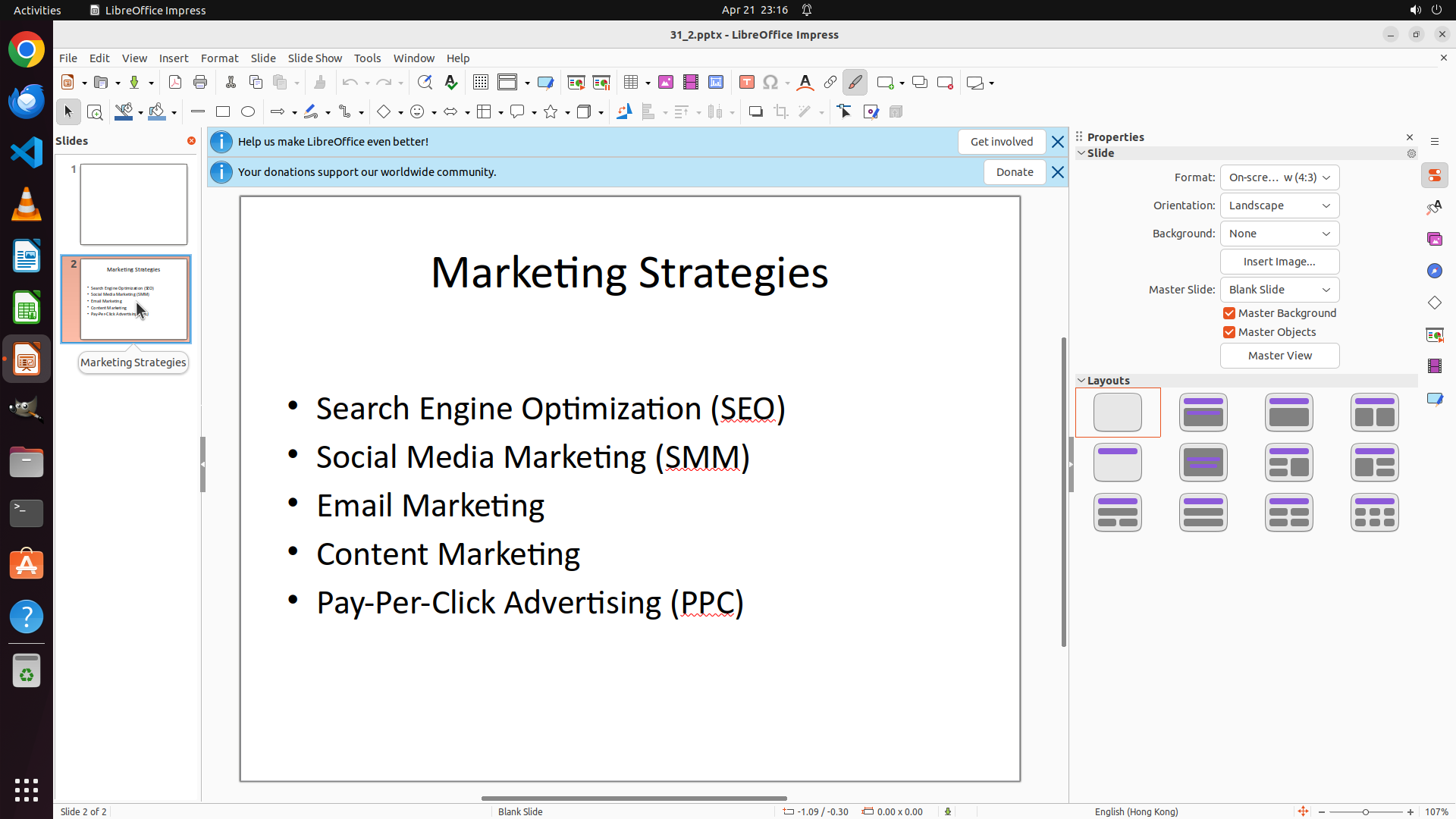下一步操作:点击左侧 Slide 2 的缩略图,导航到第二张幻灯片。Slide 2 的缩略图在左侧面板的第二个位置,可以看到它包含 "Marketing Strategies" 文本内容。
