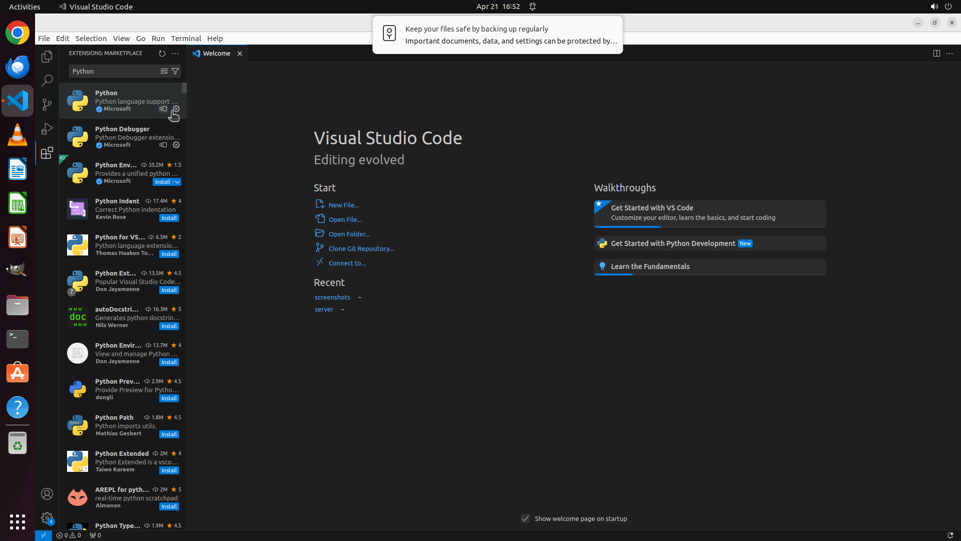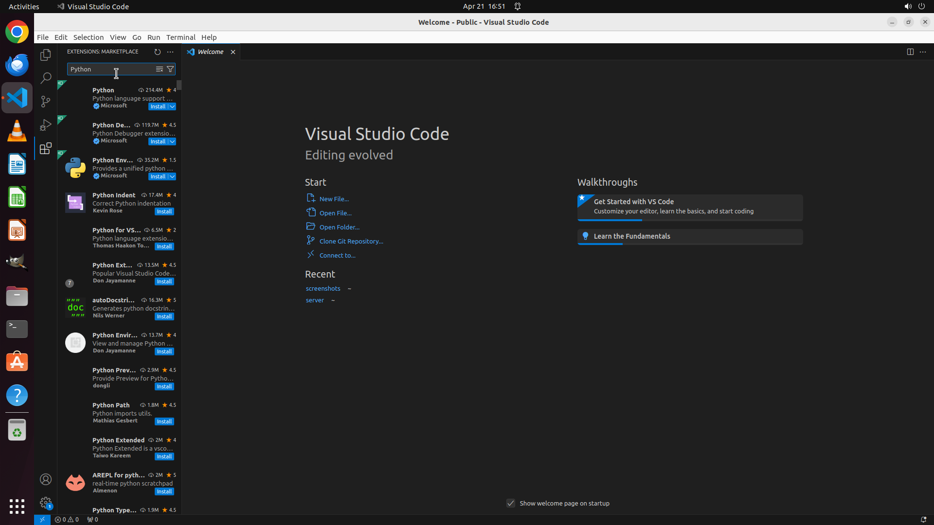 VS Code: 已经打开,显示的是 Welcome 页面。左侧边栏可以看到多个图标,包括 Explorer、Search、Source Control、Run and Debug 和 Extensions 图标。当前任务需要安装 Python 扩展,首先需要打开 Extensions 视图。