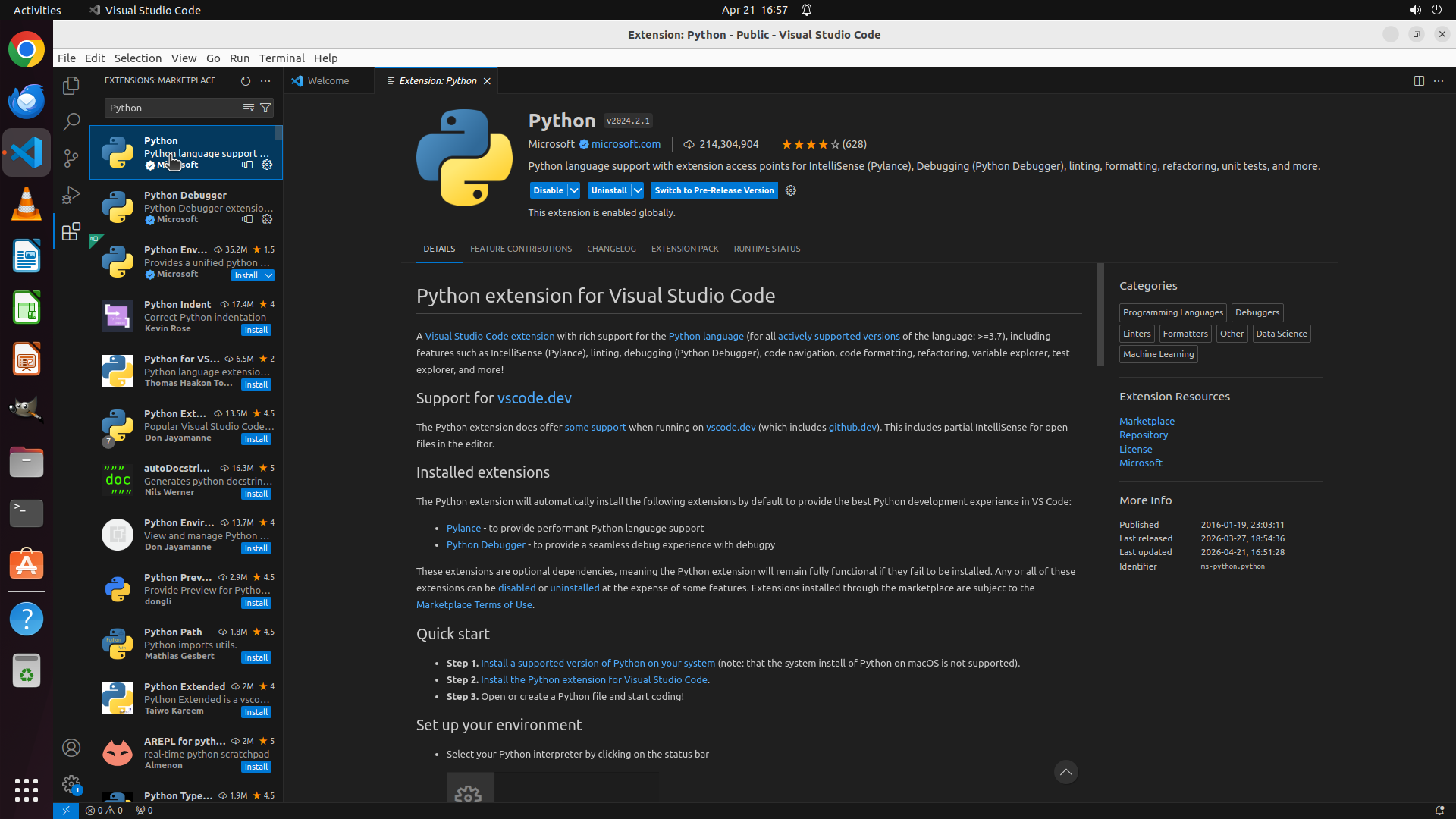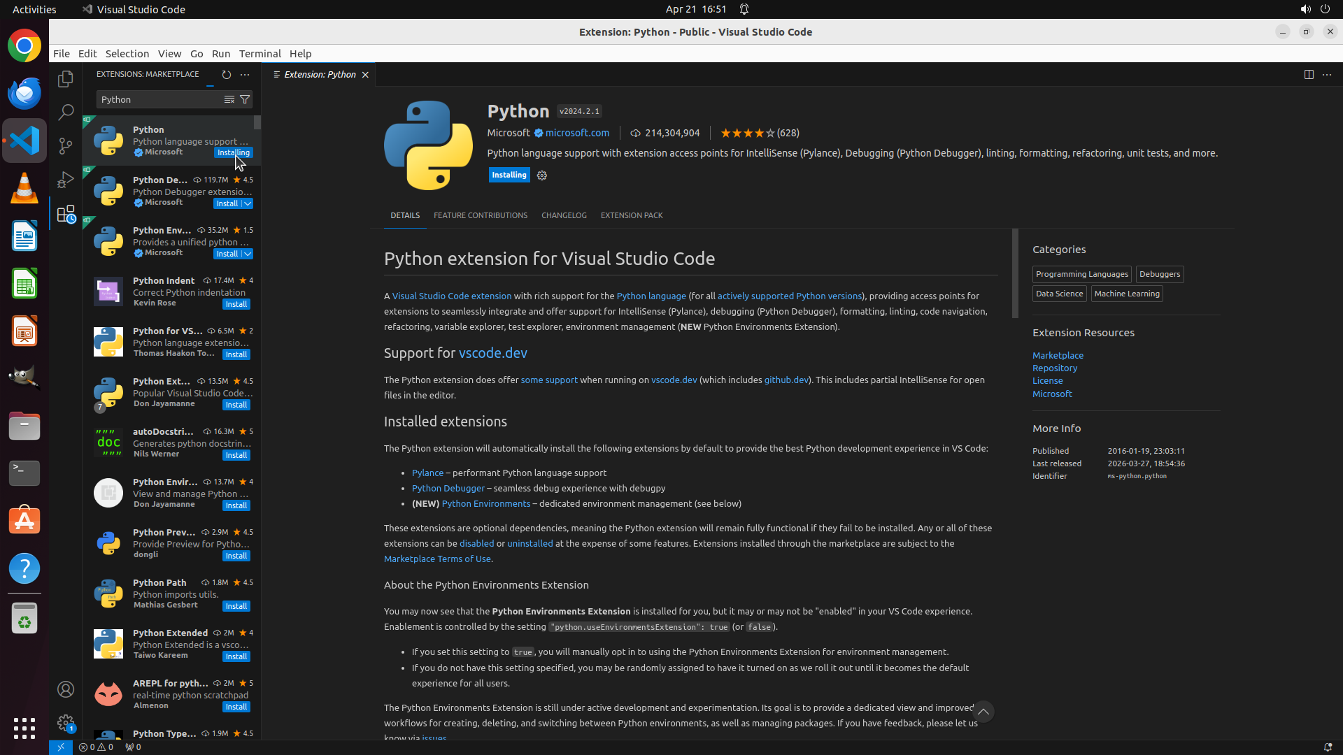 - 扩展由 Microsoft 官方提供,版本为 v2024.2.1,下载量超过 2.14 亿次