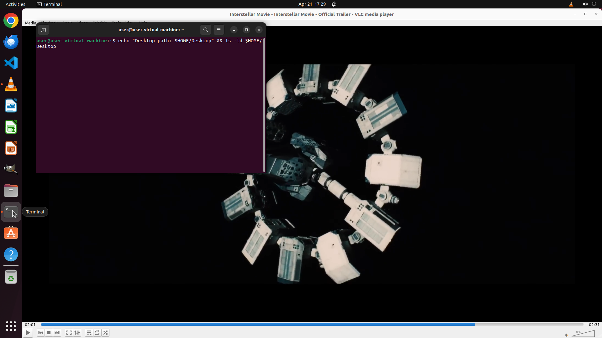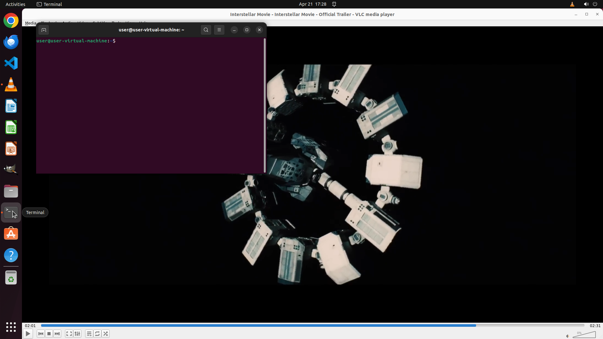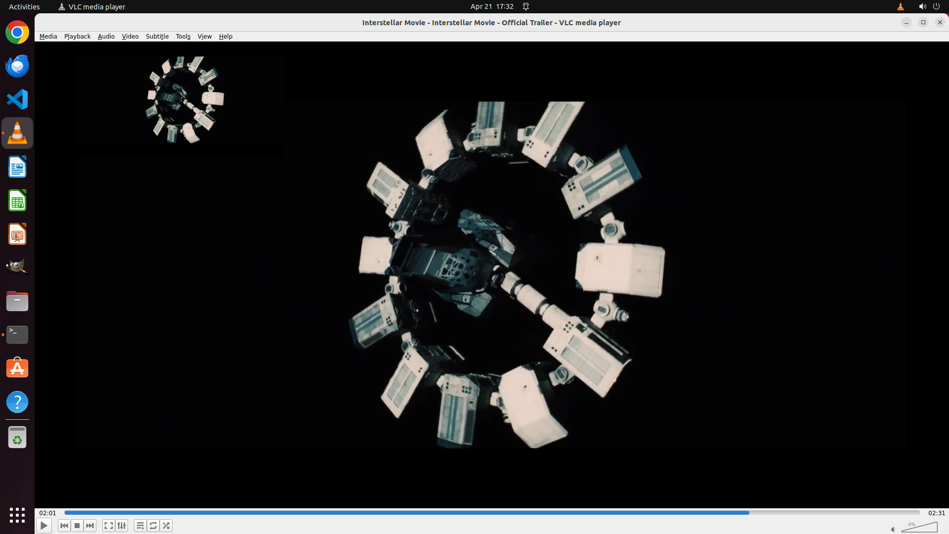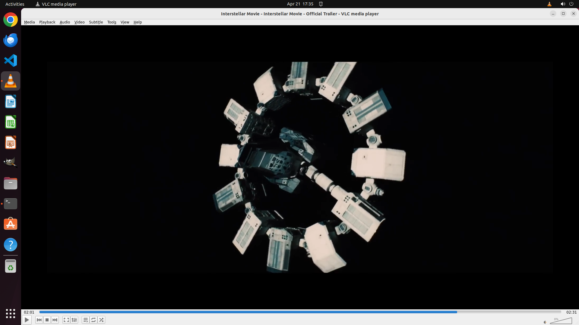 1. **VLC媒体播放器状态**: VLC正在运行并播放"Interstellar Movie - Official Trailer"视频,当前播放时间为02:01,总时长02:31。视频显示正常,界面完整。