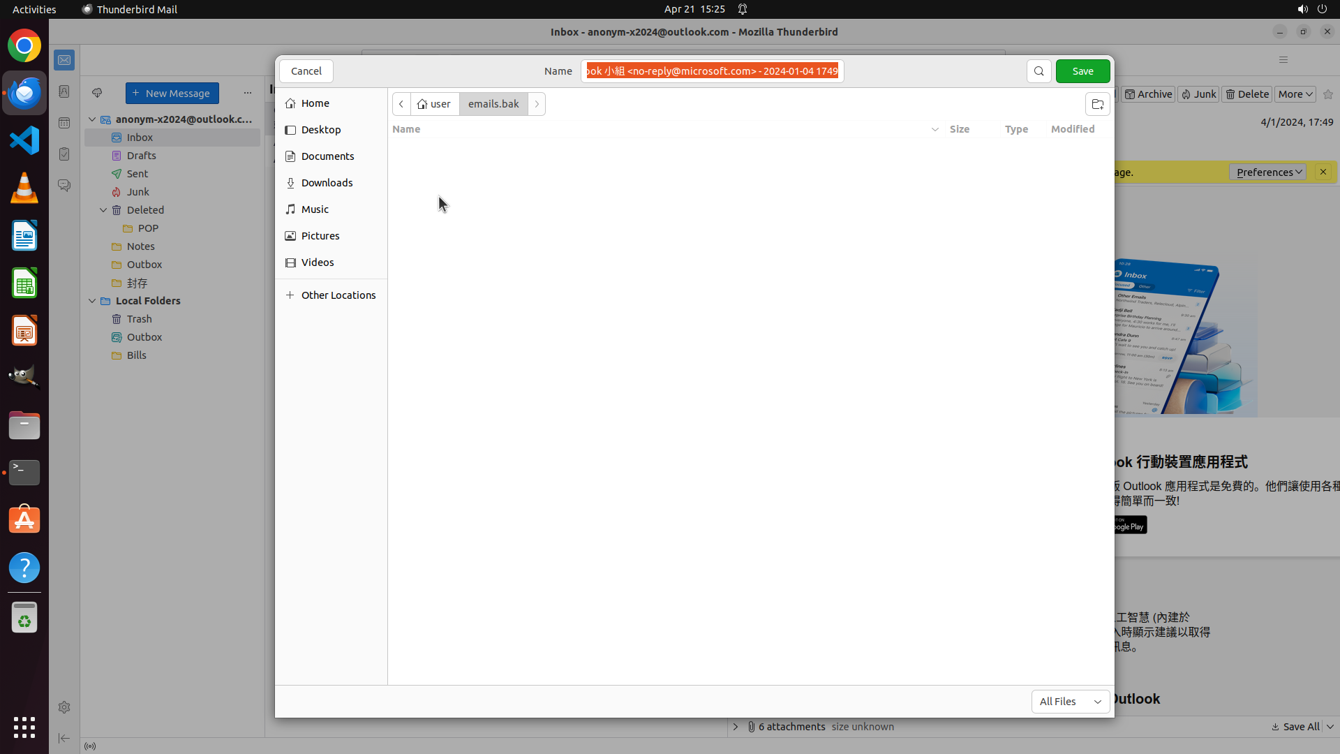 点击 "Save As..." 选项,这将打开文件保存对话框,然后我可以导航到 ~/emails.bak 目录并保存邮件。