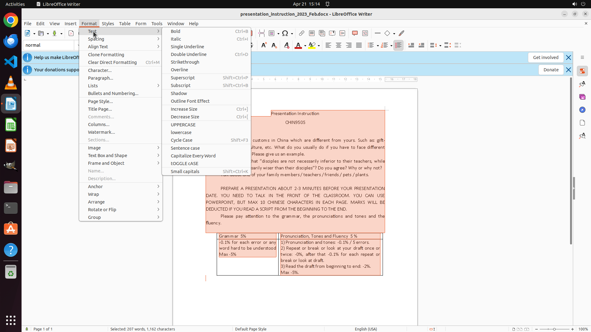 ## 6. 上一次操作的前50步操作简述 ### 步骤 1: - 描述: ``` #### 重要信息 LibreOffice Writer is open with a document titled "presentation_instruction_2023_Feb.docx". The document contains: - Title: "Presentation Instruction" - Course code: "CHIN9505" (uppercase) - Several paragraphs of text - A section in ALL CAPS: "PREPARE A PRESENTATION ABOUT 2-3 MINUTES BEFORE YOUR PRESENTATION DATE. YOU NEED TO TALK IN THE FRONT OF THE CLASSROOM..." - A grading rubric table at the bottom The task is to convert all uppercase text to lowercase. The strategy tree outlines a clear approach: select all text, use Format menu to change case, then save. #### 情况分析与思考过程 The document is already open in LibreOffice Writer, which is good. I can see there's definitely uppercase text that needs to be converted (like "CHIN9505" and the entire paragraph in caps). Following the strategy tree: 1. First step is to select all text using Ctrl+A 2. Then use Format > Text > Change Case to convert to lowercase 3. Finally save the document I'll start by selecting all text with Ctrl+A, which is the most efficient way to select the entire document content at once. ``` I'll help you convert all uppercase text to lowercase in the LibreOffice Writer document. Let me start by selecting all the text in the document. - 操作: 1. 按下键盘按键: ctrl, a ### 步骤 2: - 描述: #### 重要信息 The previous action (Ctrl+A) was successful. All text in the document is now selected, as shown by: - The orange/peach highlighting covering all document content - The status bar showing "Selected: 165 words, 1,162 characters" - The entire document including title, course code, paragraphs, and table are all highlighted #### 情况分析与思考过程 Step 1 of the strategy tree is complete - all text is selected. Now I need to proceed to Step 2: Convert the selected text to lowercase using the Format menu. The next logical steps are: 1. Click on the "Format" menu in the menu bar 2. Navigate to Text > Change Case 3. Select the lowercase option I'll start by clicking on the Format menu to access the text formatting options. This is the most direct path to changing text case in LibreOffice Writer. - 操作: 1. 左键单击坐标 (0.151, 0.068) </SITUATION>