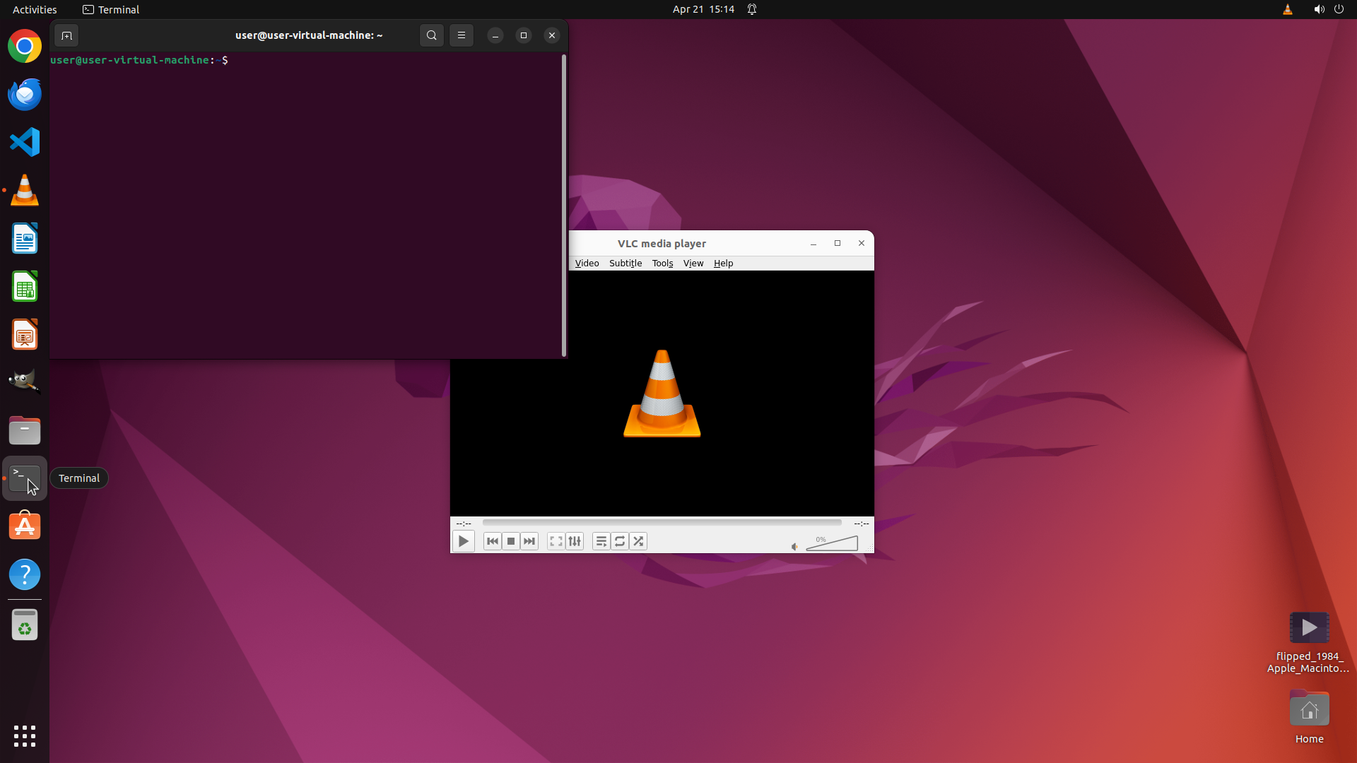 3. **桌面环境**: Ubuntu 系统,顶部状态栏显示 "Activities" 和 "VLC media player",时间显示为 Apr 21 15:11。