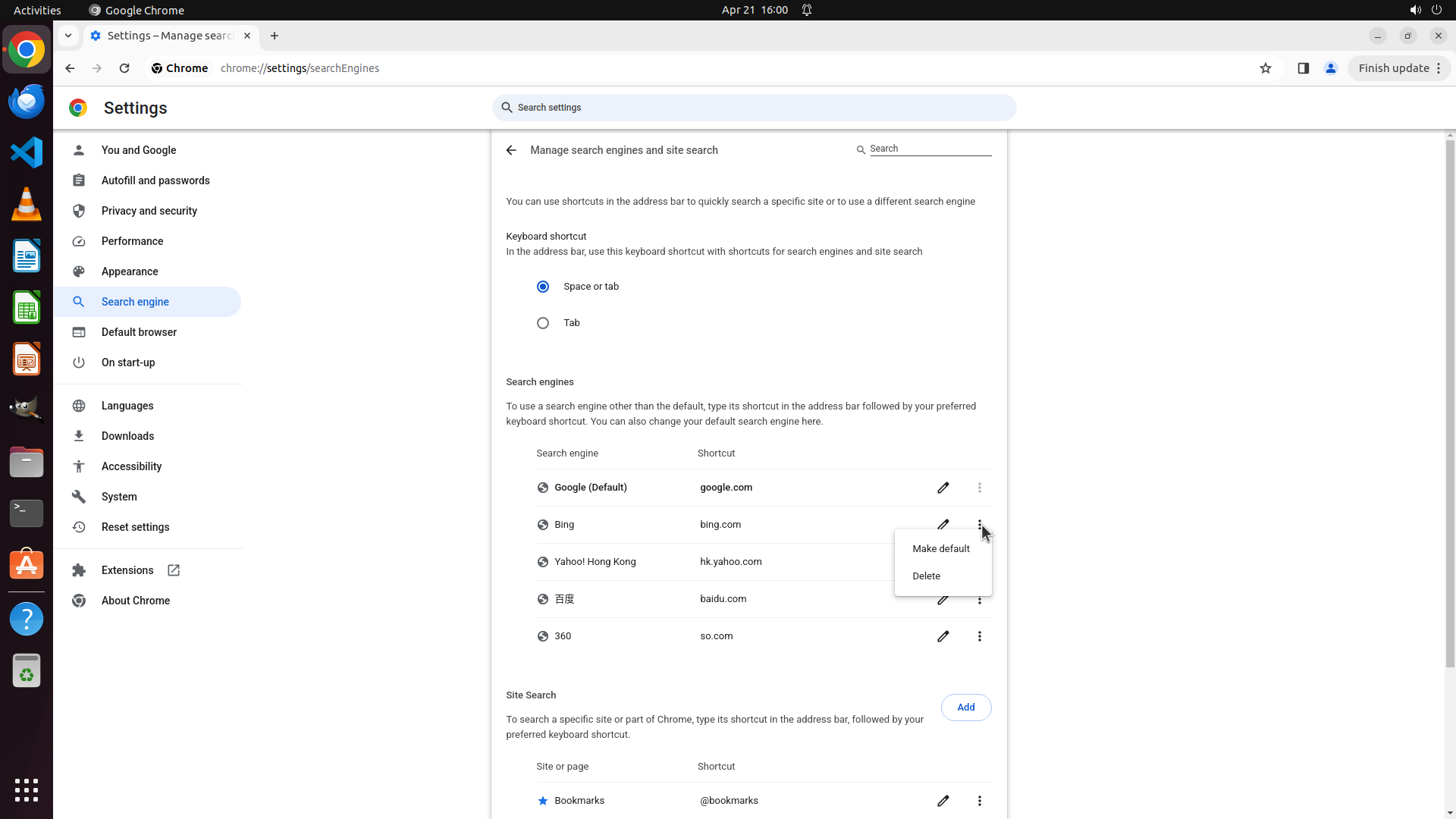 上一步操作成功:已点击"Manage search engines and site search",现在可以看到完整的搜索引擎列表。