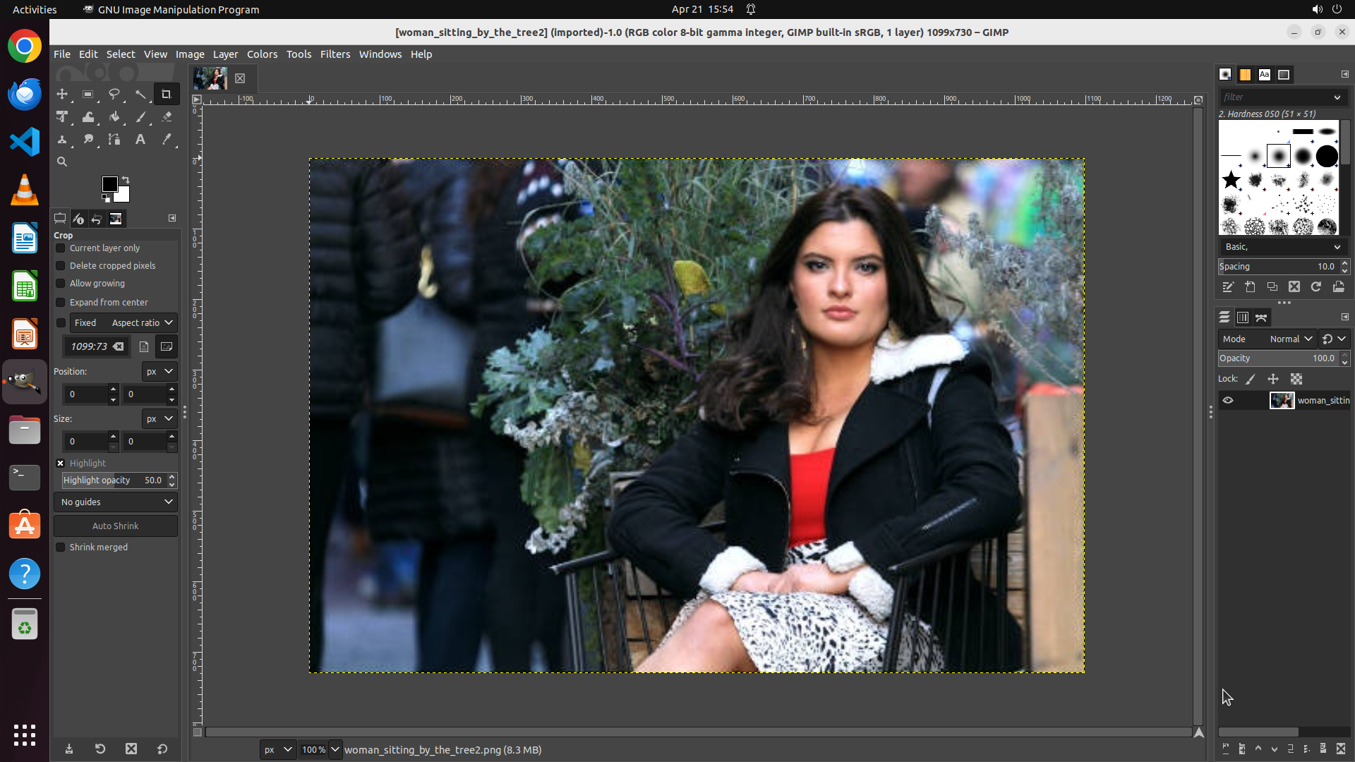 - The photo in the main canvas displays visibly more vibrant and saturated colors (e.g., the red top appears more vivid, green foliage more intense, overall image less muted)
